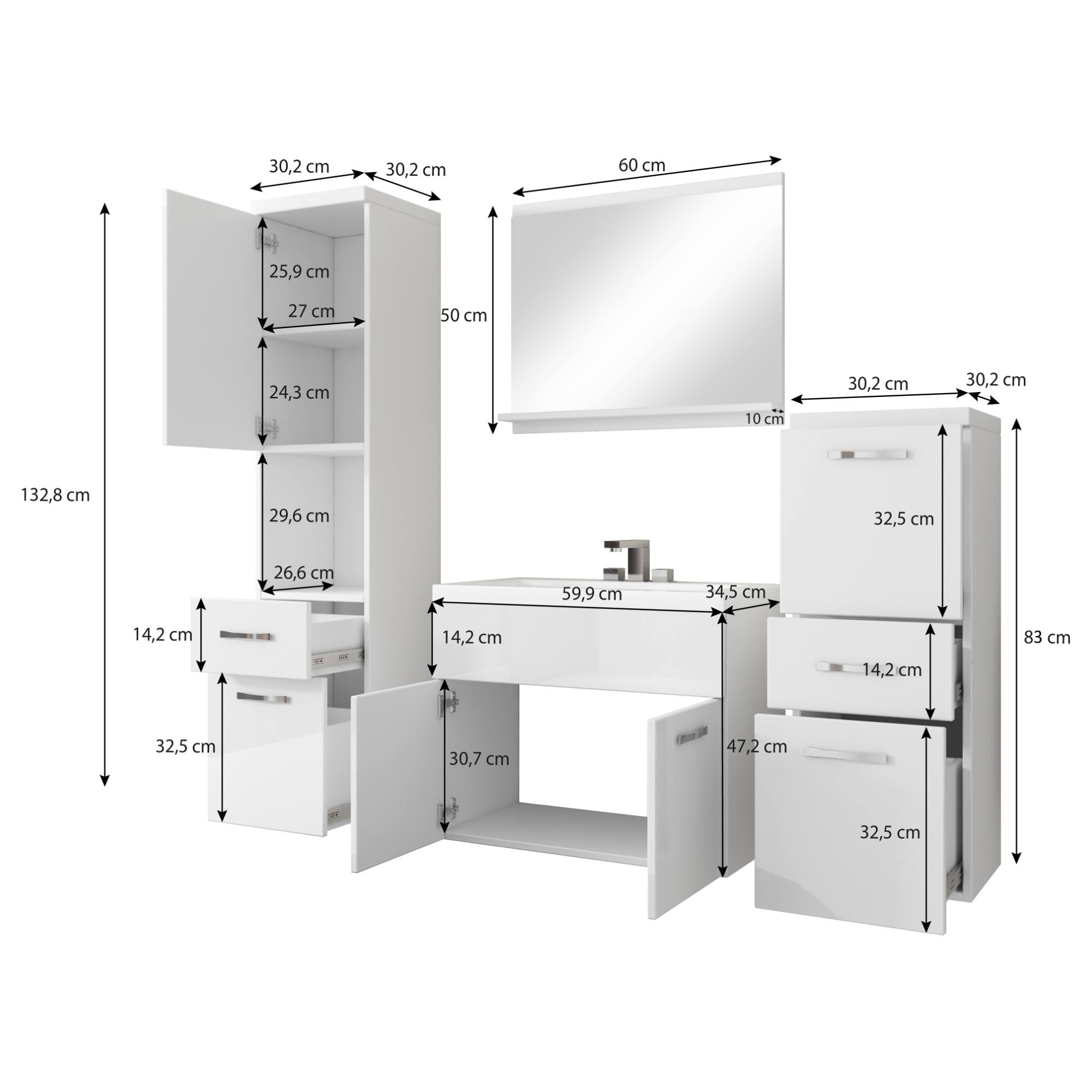 - Výbava: Kúpeľňová skrinka pod umývadlo, Kúpeľňová skrinka závesná, Umývadlo, Zrkadlo