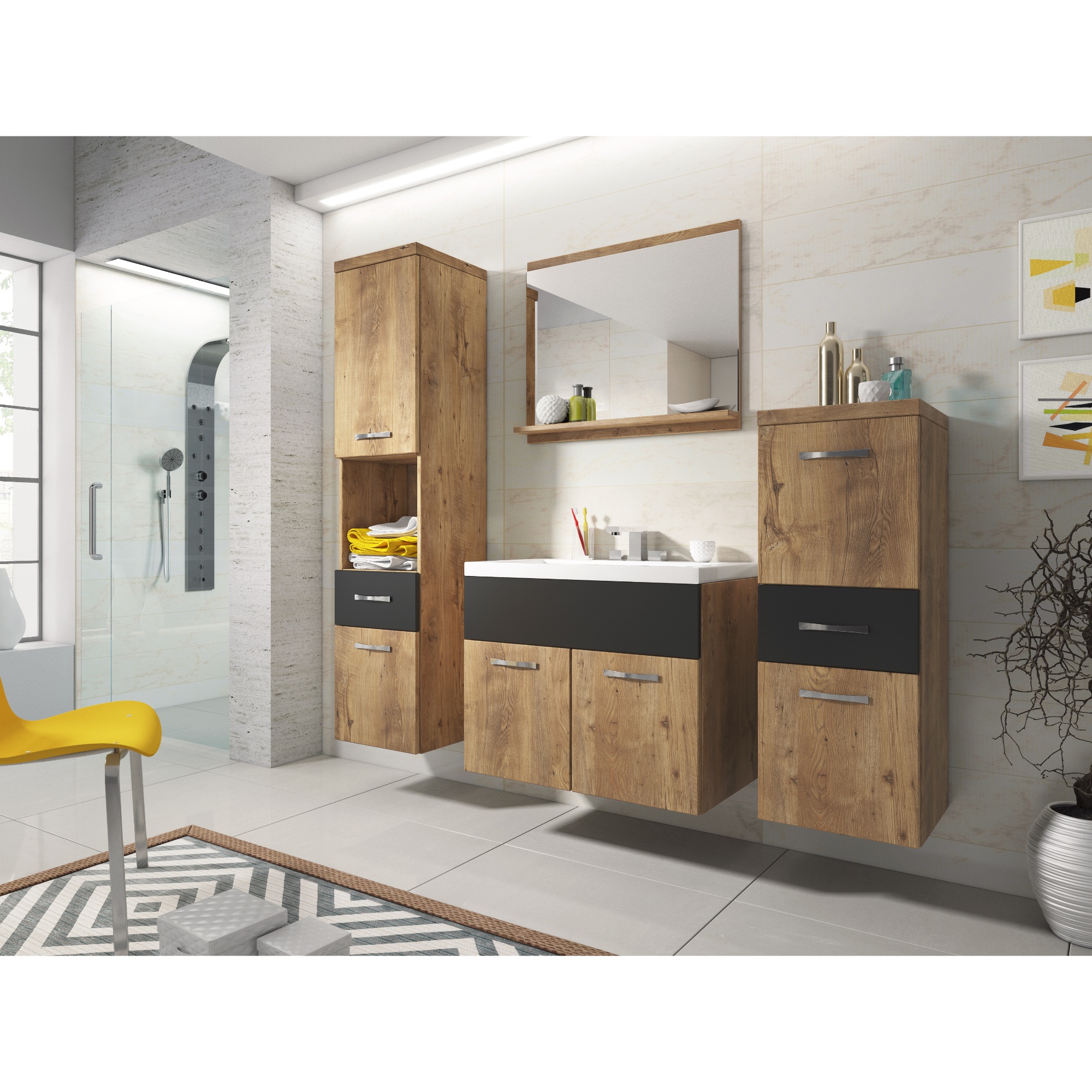 - Výbava: Kúpeľňová skrinka pod umývadlo, Kúpeľňová skrinka závesná, Umývadlo, Zrkadlo