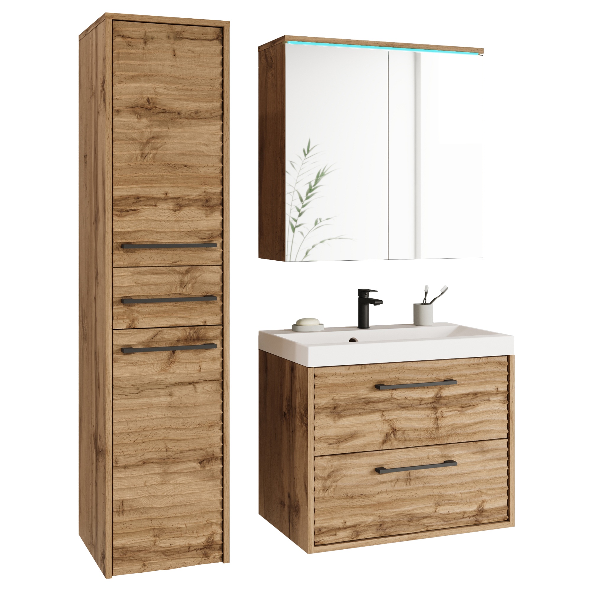 Táto zostava obsahuje tri priestranné kúpeľňové skrinky, z toho jedna obsahuje keramické umývadlo. Skrinky ponúkajú dostatočný úložný priestor na odloženie všetkých nevyhnutných vecí. Praktické rúčky spoločne s LED podsvietením pôsobia decentným dojmom a zdôrazňujú celkový vzhľad.
