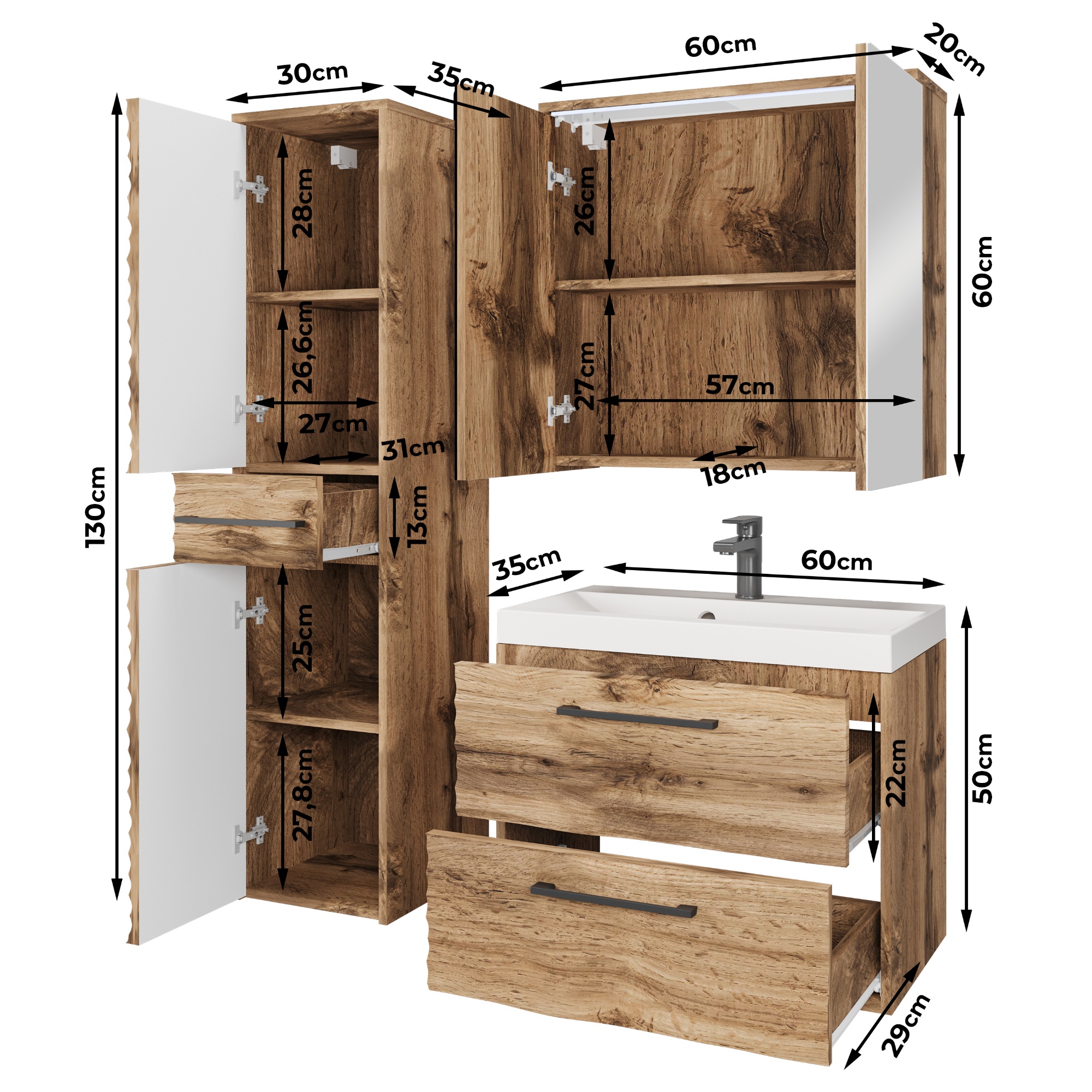 - Výbava: Kúpeľňová skrinka pod umývadlo, Kúpeľňová skrinka so zrkadlom, Kúpeľňová skrinka závesná, Umývadlo