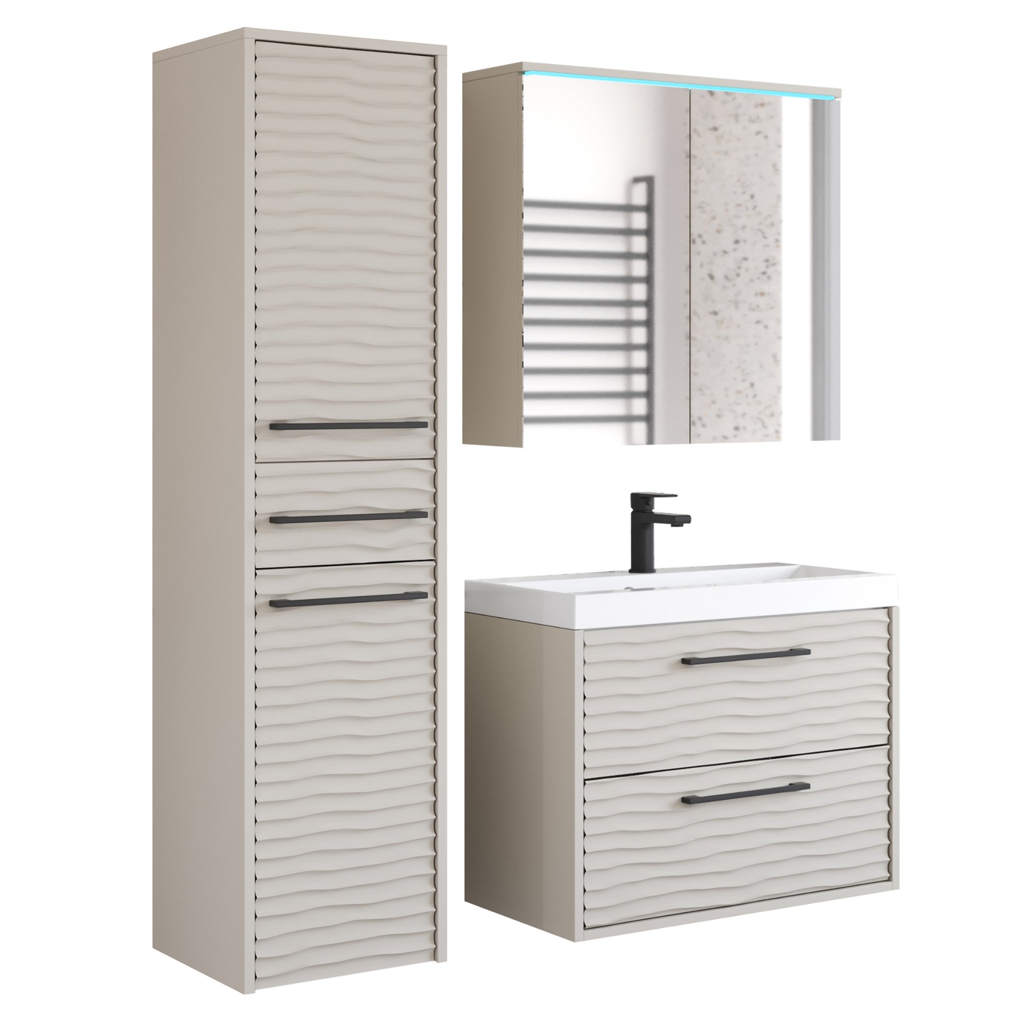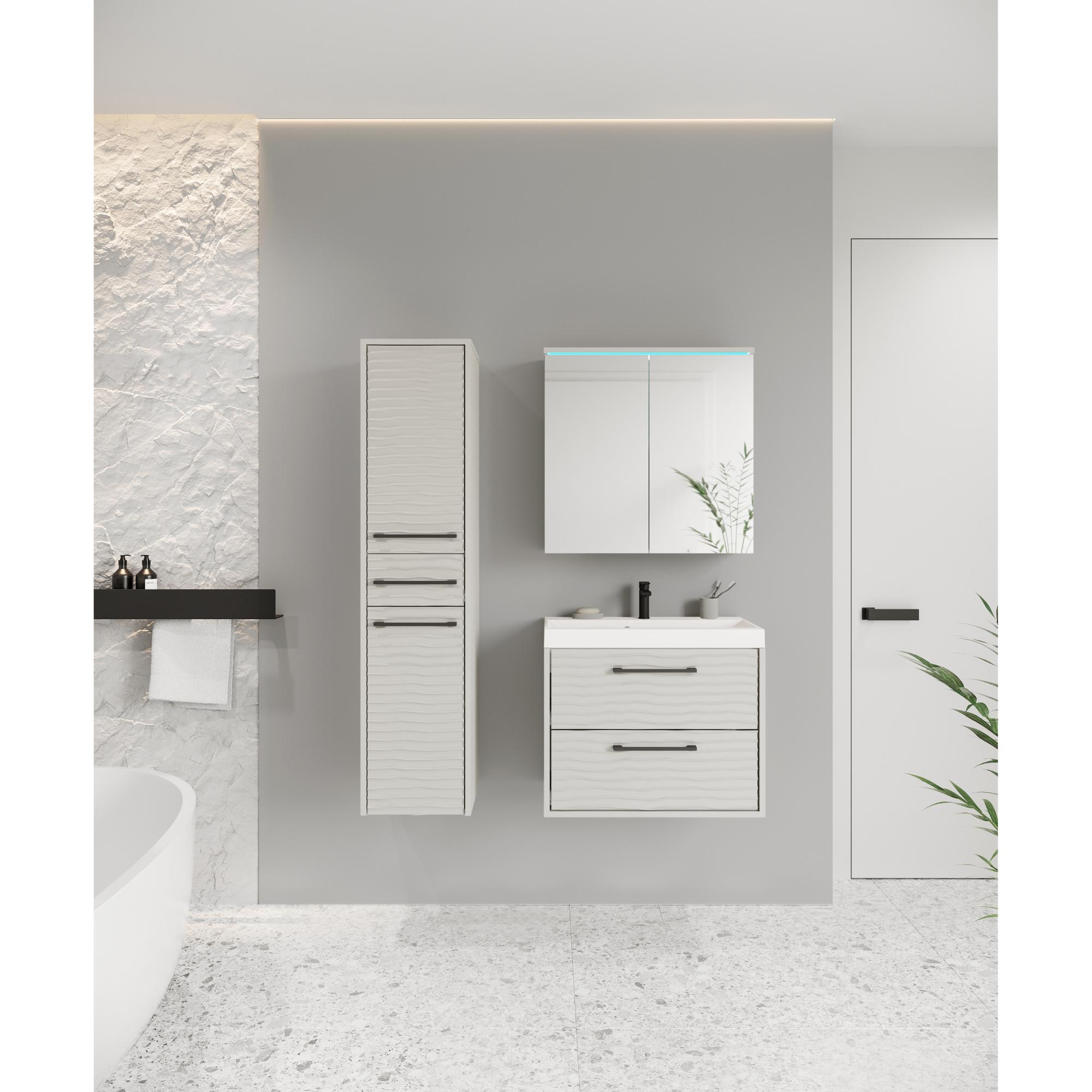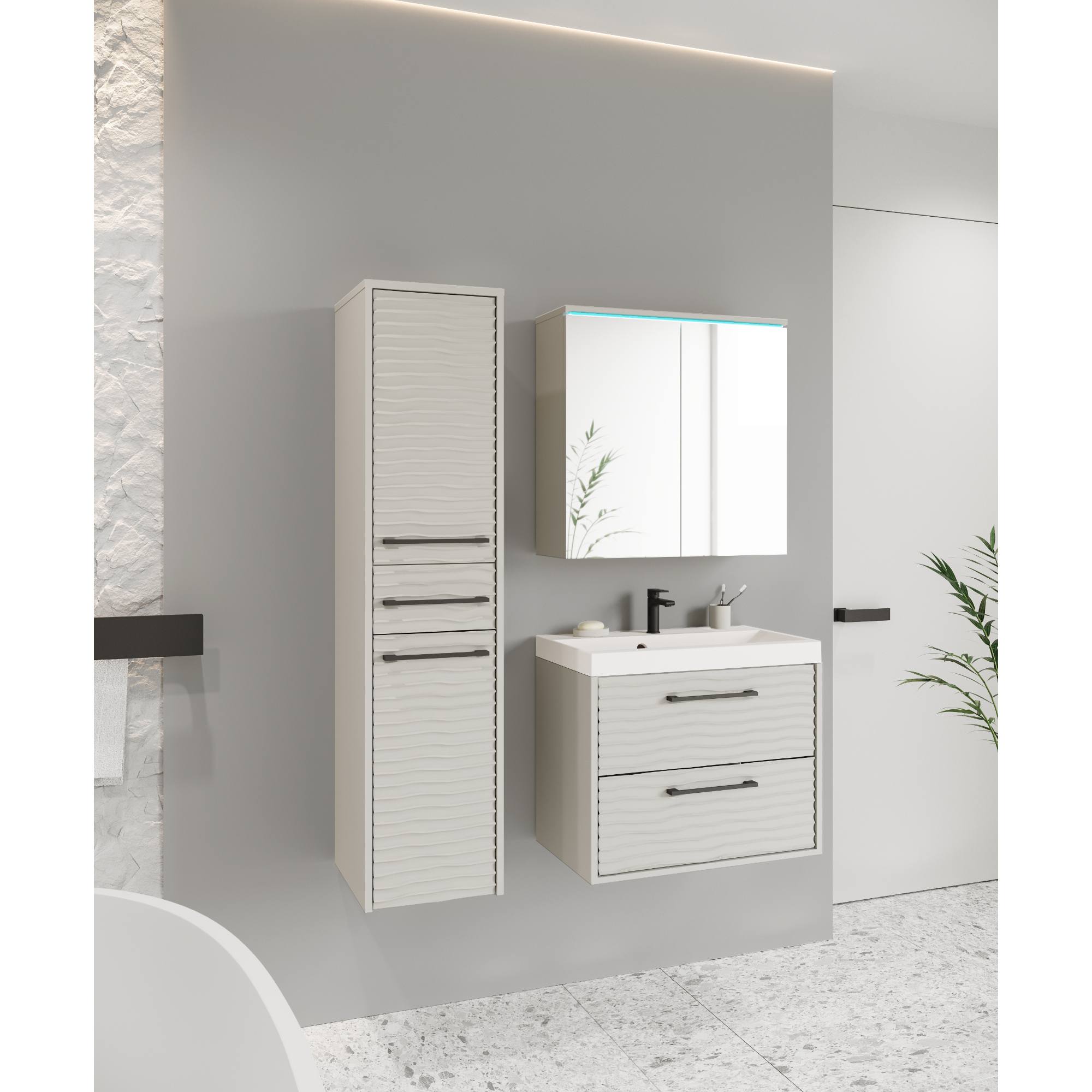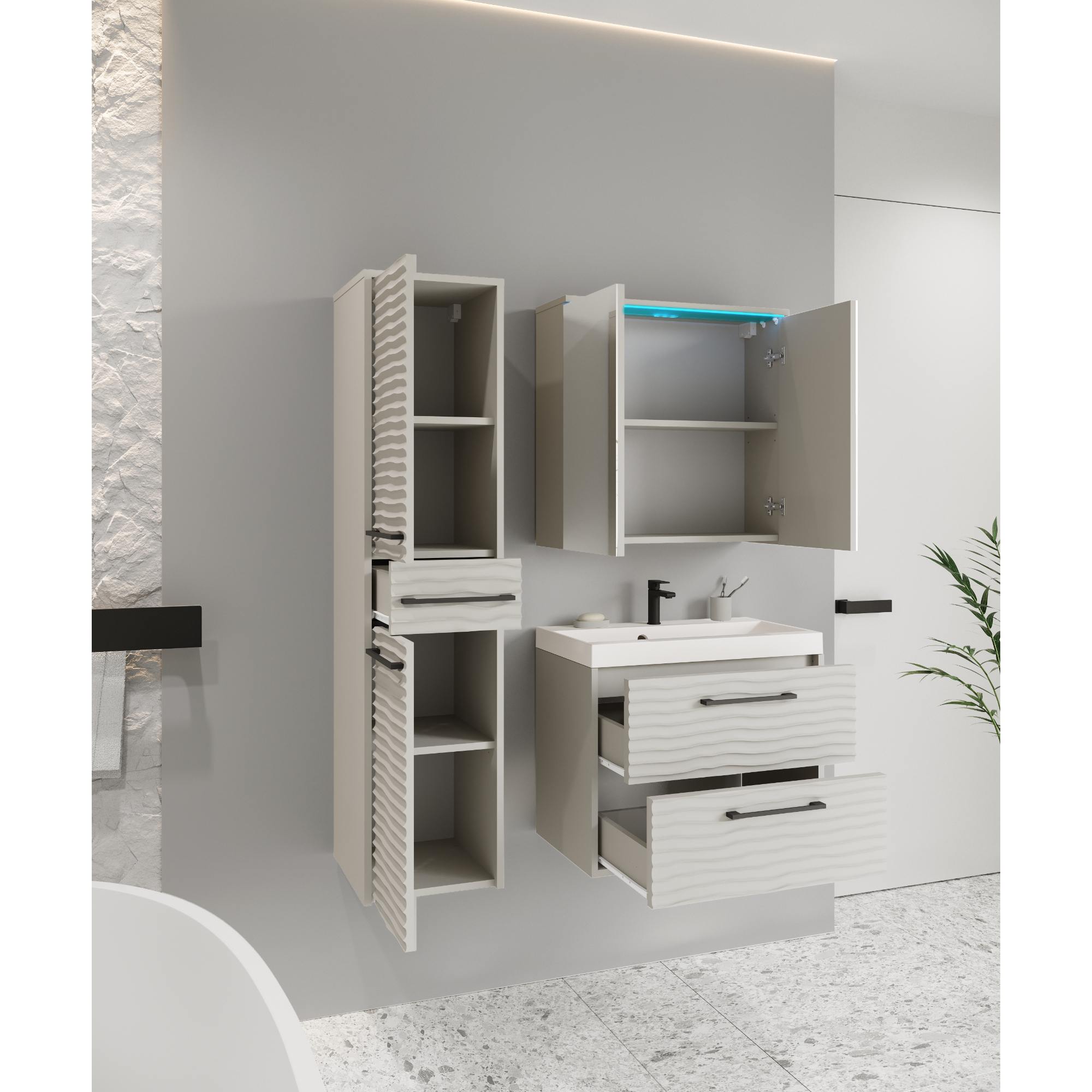 Táto zostava obsahuje tri priestranné kúpeľňové skrinky, z toho jedna obsahuje keramické umývadlo. Skrinky ponúkajú dostatočný úložný priestor na odloženie všetkých nevyhnutných vecí. Praktické rúčky spoločne s LED podsvietením pôsobia decentným dojmom a zdôrazňujú celkový vzhľad.