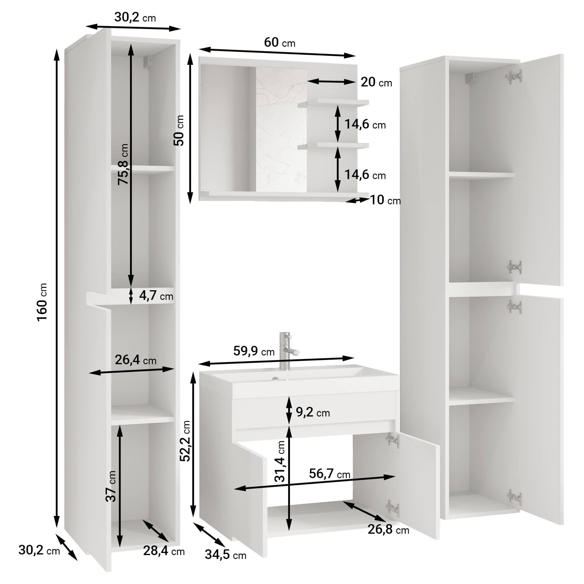 - Výbava: Kúpeľňová skrinka pod umývadlo, Kúpeľňová skrinka závesná, Umývadlo, Zrkadlo