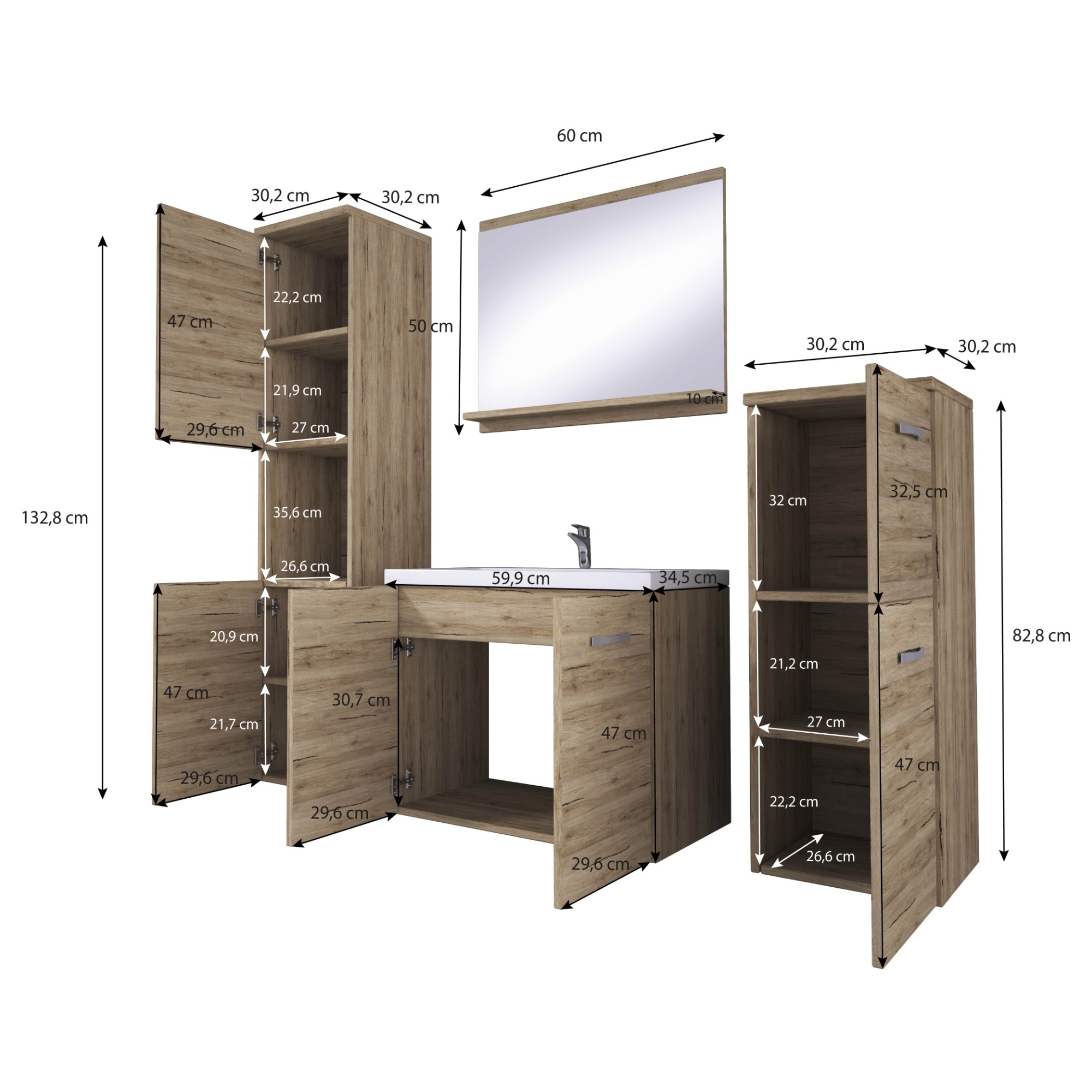 - Výbava: Kúpeľňová skrinka pod umývadlo, Kúpeľňová skrinka závesná, Umývadlo, Zrkadlo