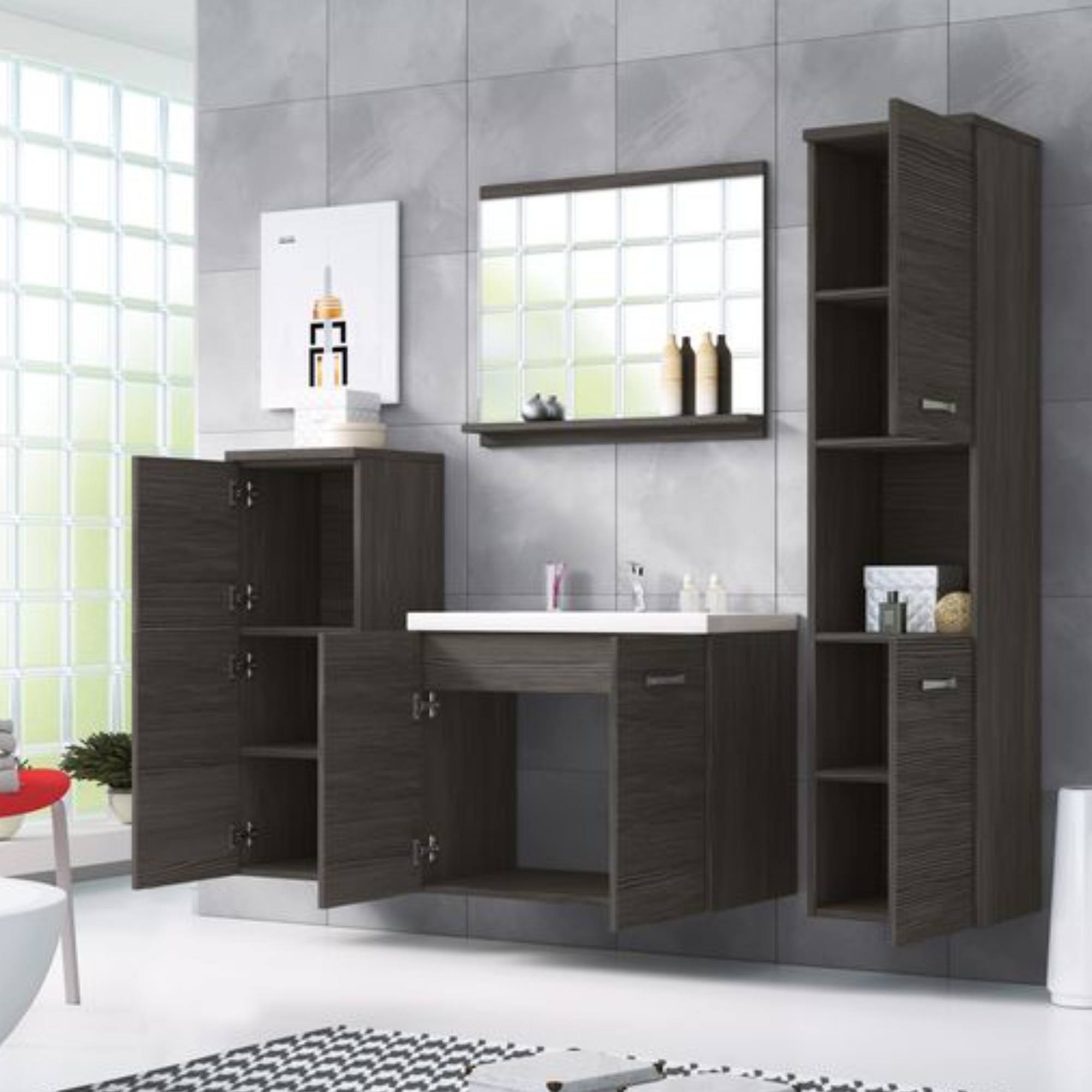 - Výbava: Kúpeľňová skrinka pod umývadlo, Kúpeľňová skrinka závesná, Umývadlo, Zrkadlo