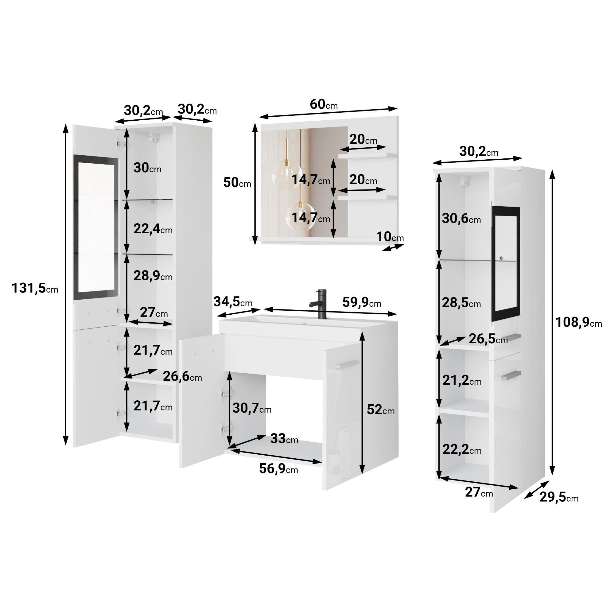 - Výbava: Kúpeľňová skrinka pod umývadlo, Kúpeľňová skrinka závesná, Umývadlo, Zrkadlo
