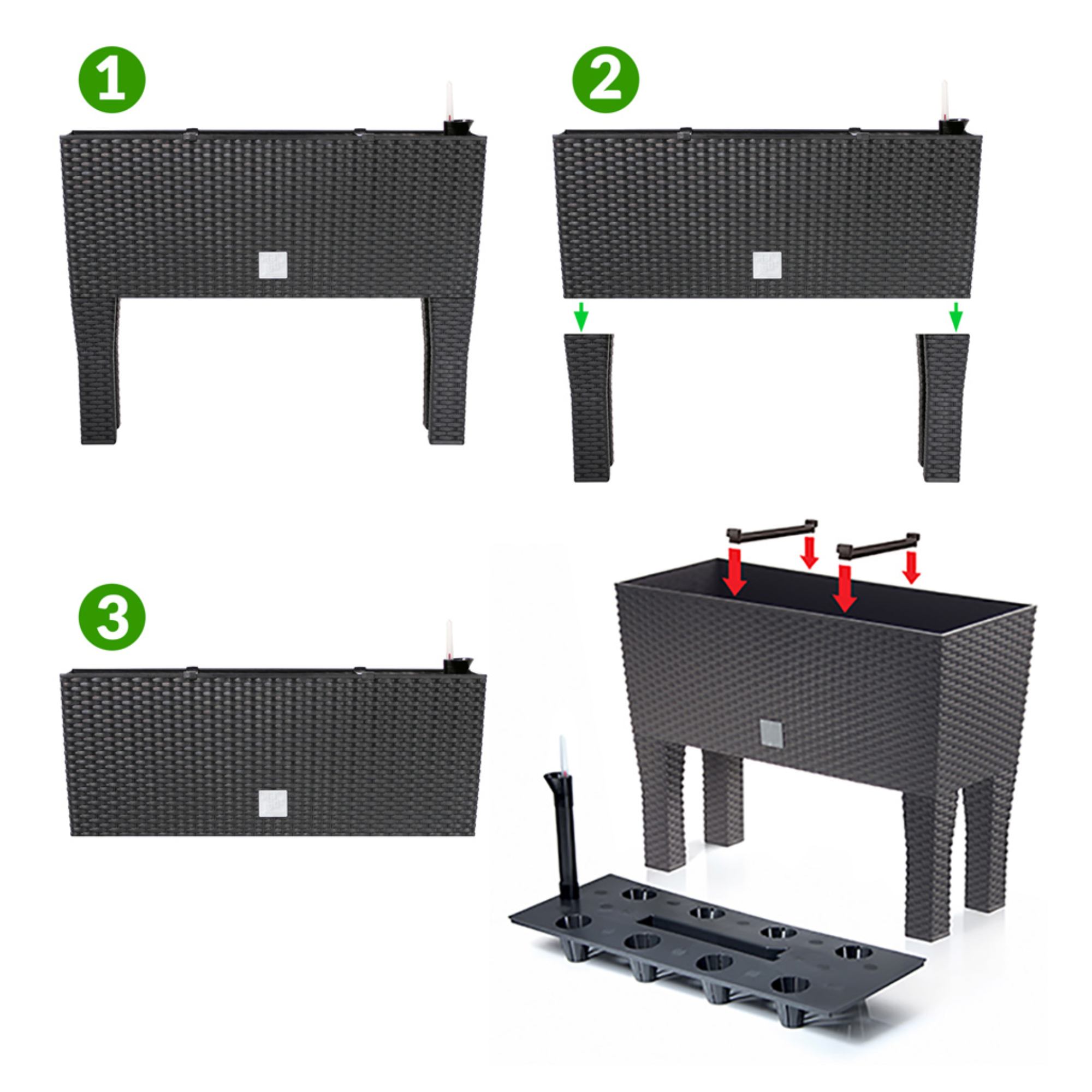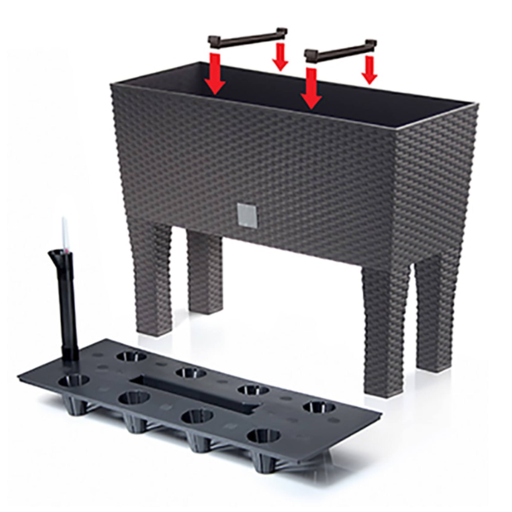 Kvetináč môžete využívať s nožičkami aj bez nich. Jeho súčasťou je zavlažovací systém, ktorý umožňuje reguláciu hladiny vody. Vďaka vnútorným prepážkam je možné kvetináč rozdeliť na 3 oddelené priestory.