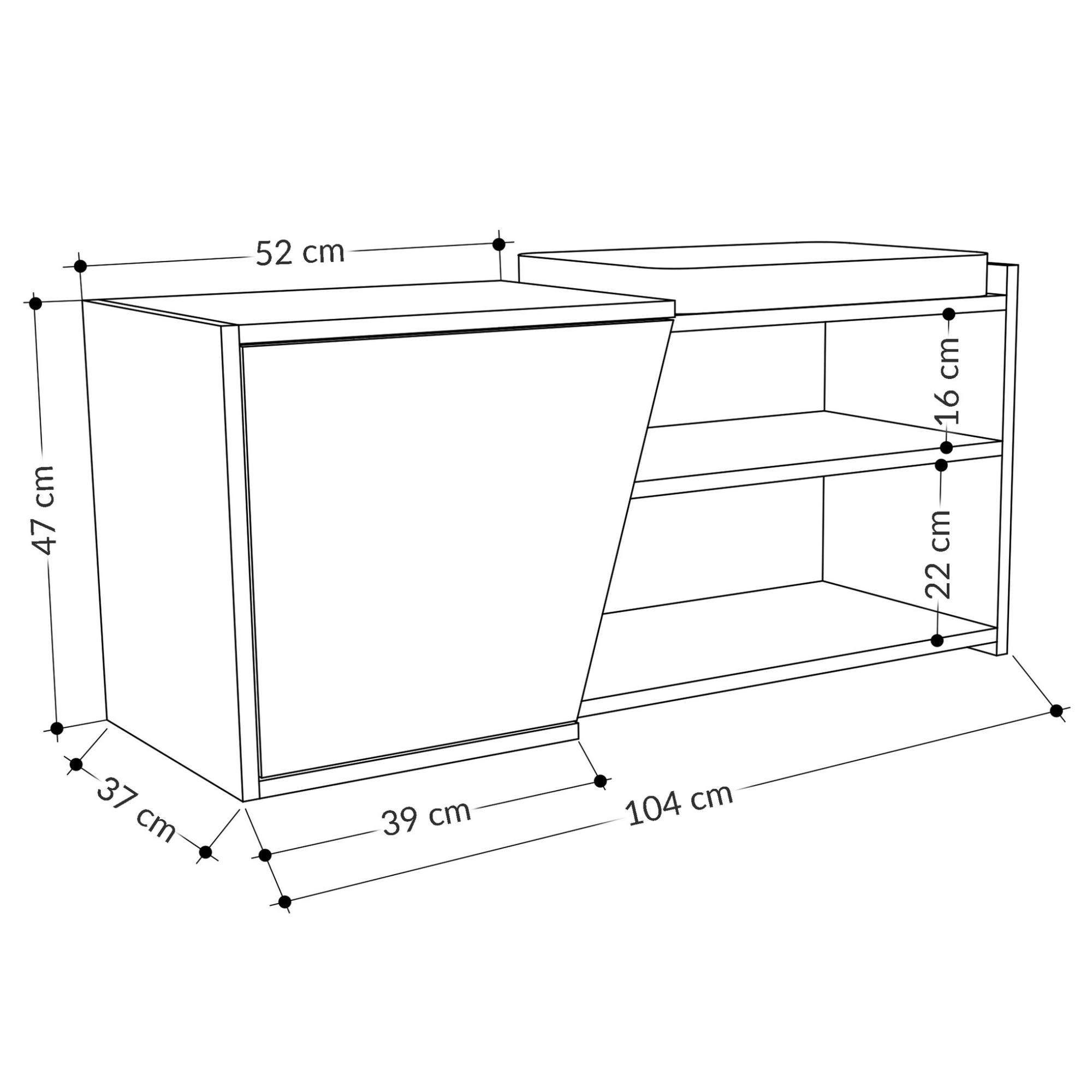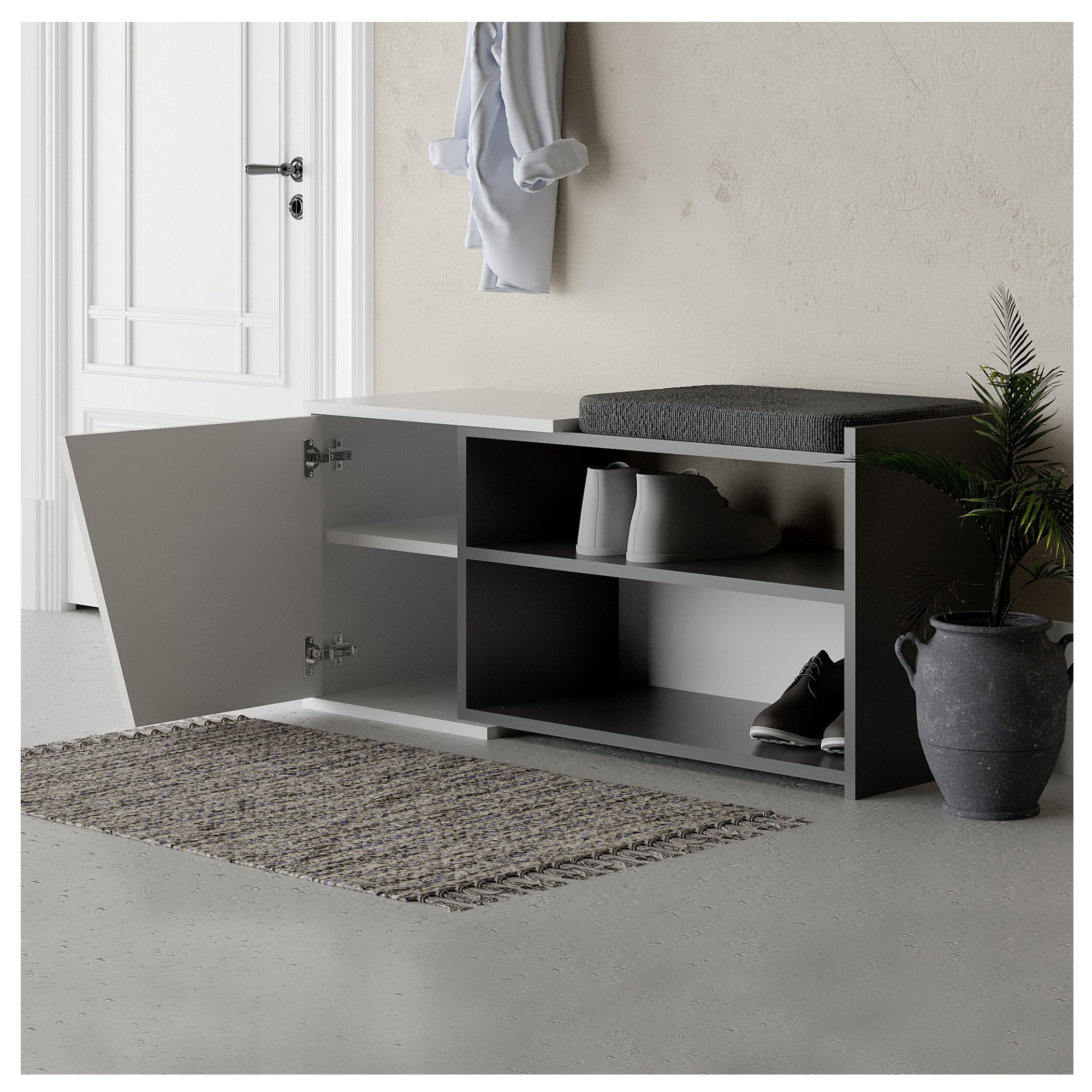 Vyrobená je z laminovanej drevotrieskovej dosky, ktorá sa vyznačuje ľahkou udržiavateľnosťou. Otvorené police poskytujú ľahký prístup k najčastejšie noseným topánkam, zatiaľ čo uzavretá skrinka s 1 vloženou policou umožňuje uloženie ďalších párov topánok a iných doplnkov. Horná časť lavice je vybavená mäkkým sedákom.
