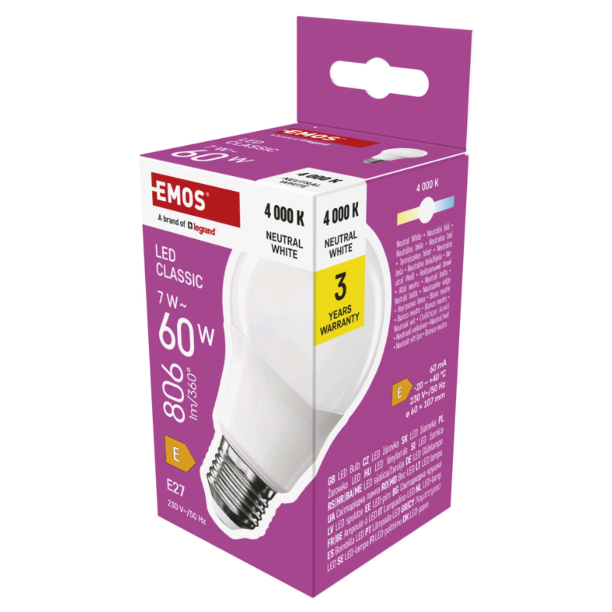 Disponuje objímkou E27 s maximálnym príkonom 7 W. Má svetelný tok 806 lúmenov s teplotou svetla 4000 Kelvinov, ktorá sa označuje ako neutrálna biela, čím imituje denné svetlo. Výhodnou vlastnosťou žiarovky je dlhá životnosť, ktorá poskytuje až 30 000 hodín svietenia.