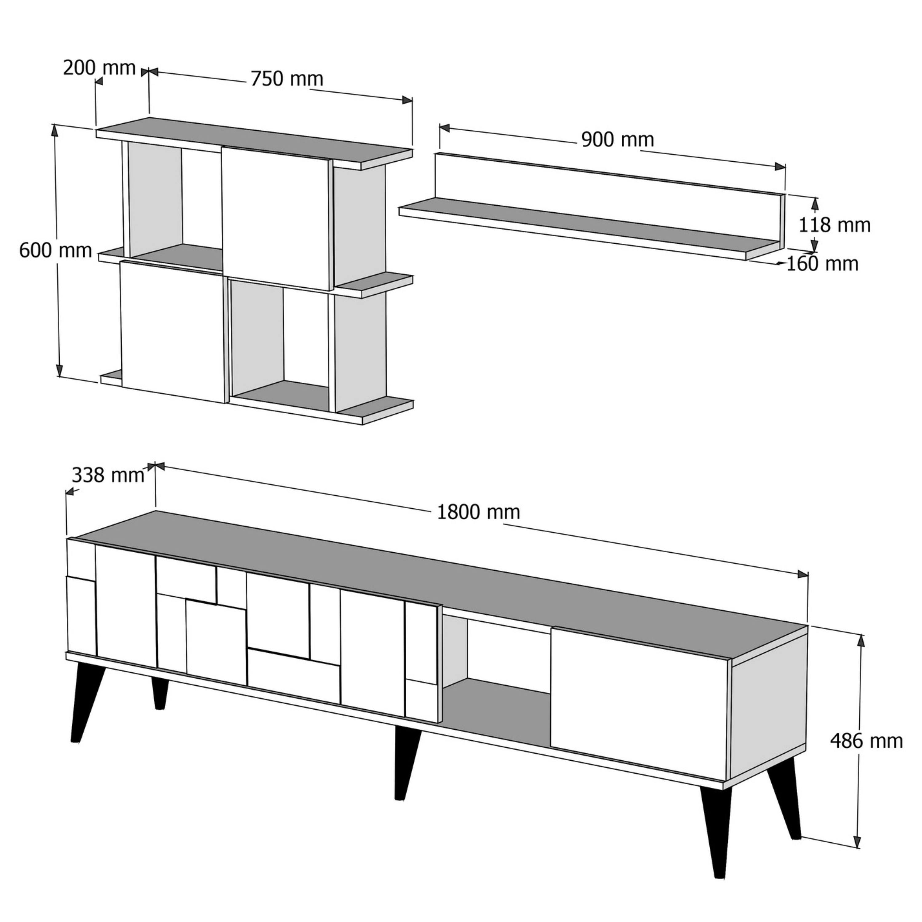 - Skladá sa z: TV komoda, nástenný regál, nástenná polica