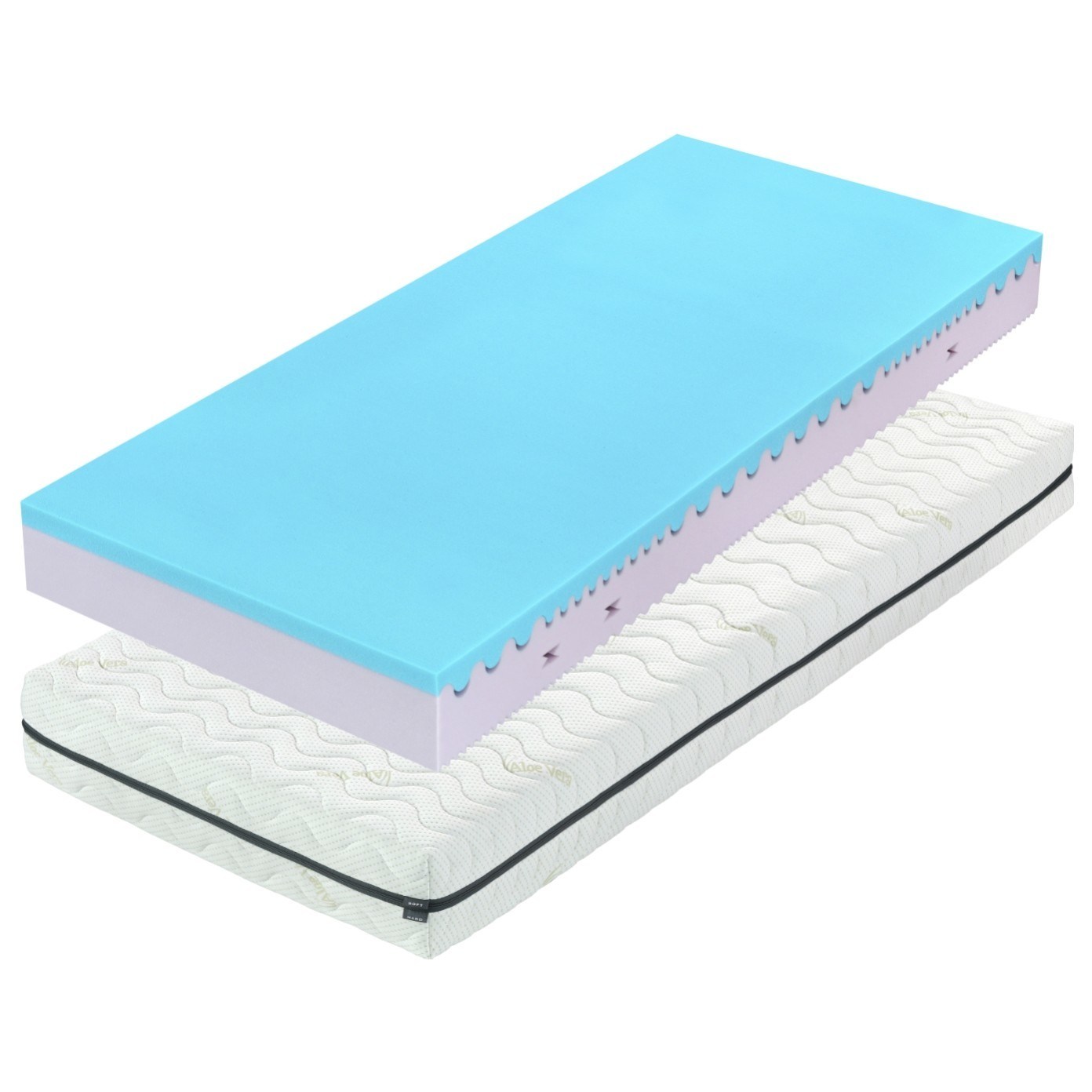 Vrchná časť z visco pamäťovej peny skvele zapadá bez použitia lepidiel do spodnej časti vyrobenej z vynikajúcej peny Flexifoam®, matrac je tak vhodný aj pre alergikov. Farebné vyhotovenie peny sa môže od uvedených fotografií líšiť, avšak jej vlastnosti zostávajú rovnaké. Poťah matraca obsahuje mikrokapsule s prírodným extraktom z Aloe vera, ktoré poťahu dodávajú antiseptické a antialergické účinky a mimoriadnu jemnosť. Poťah je prešívaný dutým vláknom a vďaka dvojdielnej konštrukcii ho tak môžete užívať nepretržite - zatiaľ čo, jednu stranu periete, druhú môžete používať.
