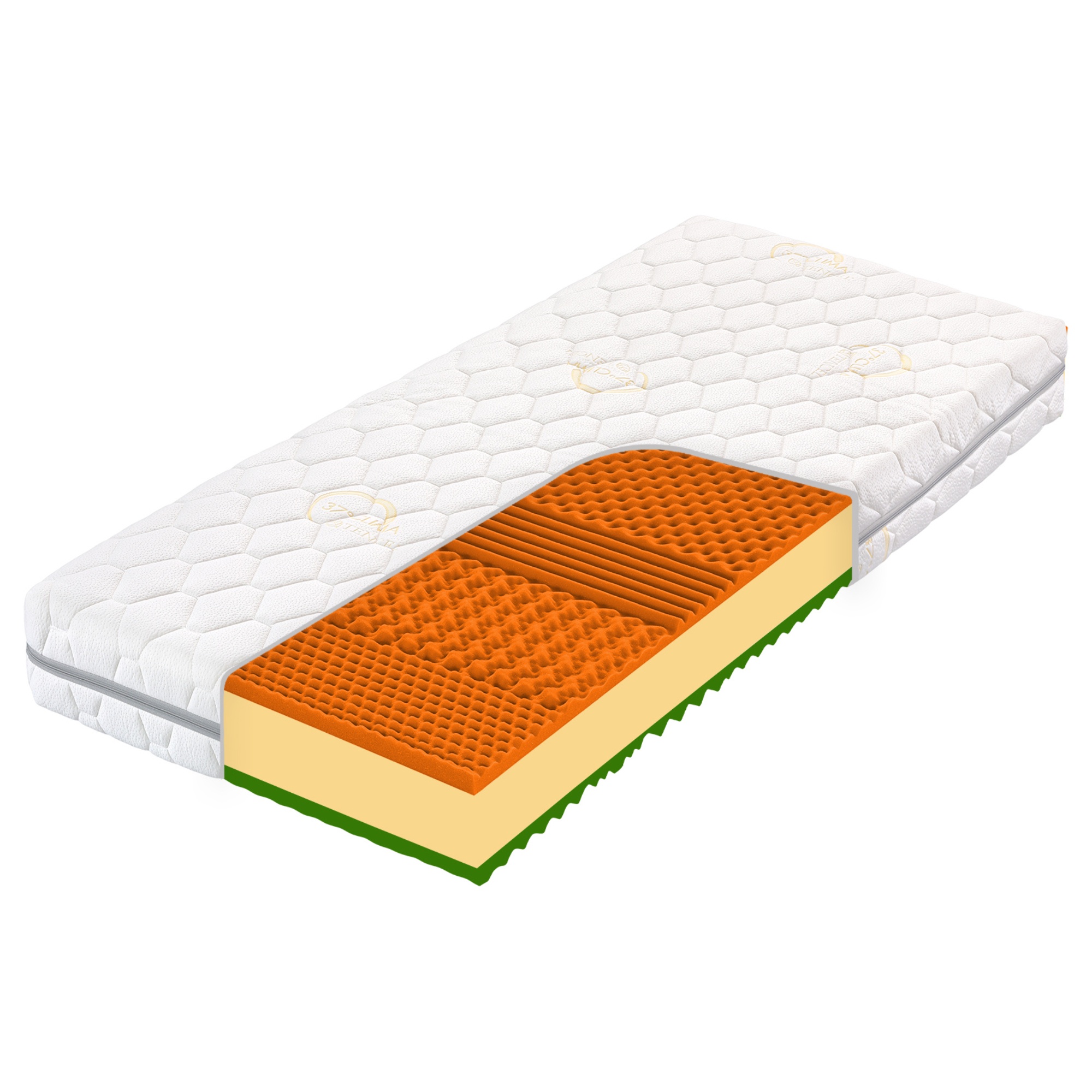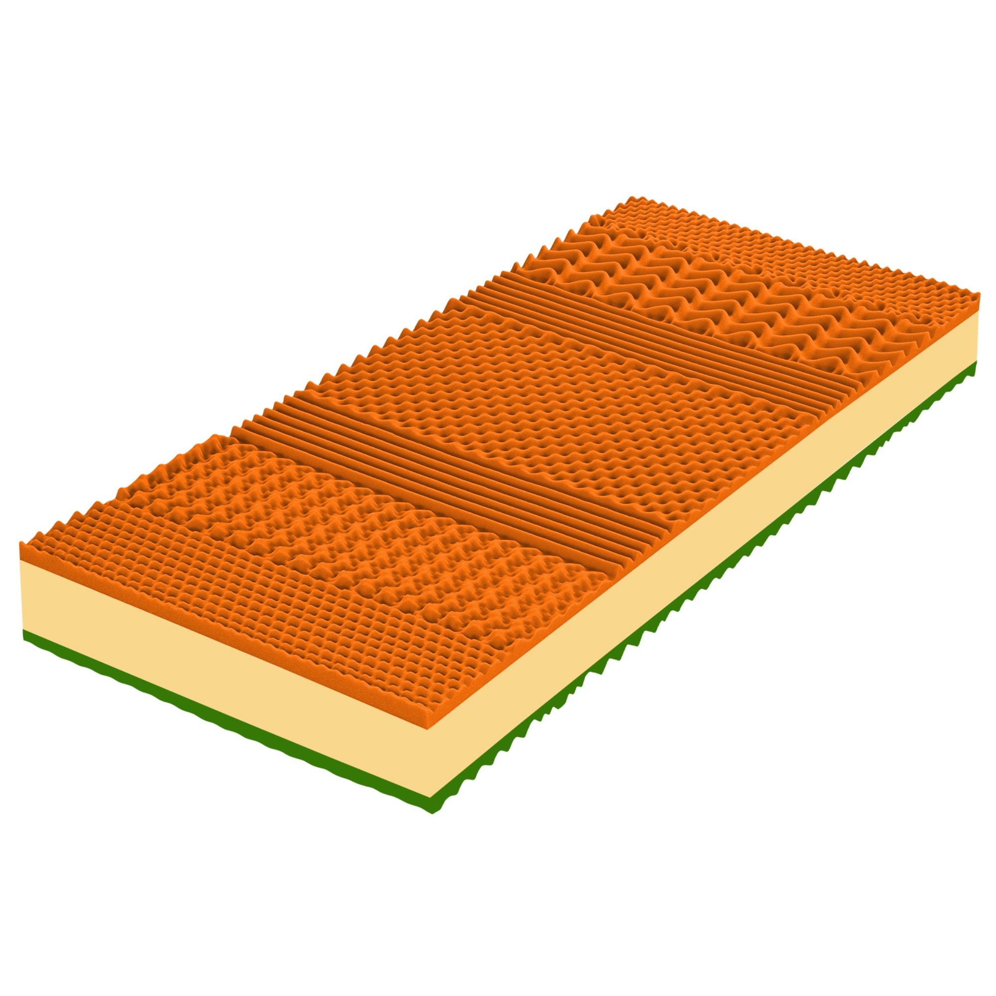 Matrac je obojstranný s rozdielnou tuhosťou. Užívateľ si zvolí tvrdšiu alebo mäkšiu stranu jednoduchým otočením. Odolná stredná vrstva je vyrobená zo studenej pružnej peny Flexifoam® s vyššou objemovou hmotnosťou. 7-zónová masážna 3D profilácia podporuje prekrvenie pokožky a celkovú úľavu svalov. Farebné vyhotovenie jednotlivých penových vrstiev sa môže od uvedených fotografií líšiť, avšak ich vlastnosti zostávajú rovnaké.