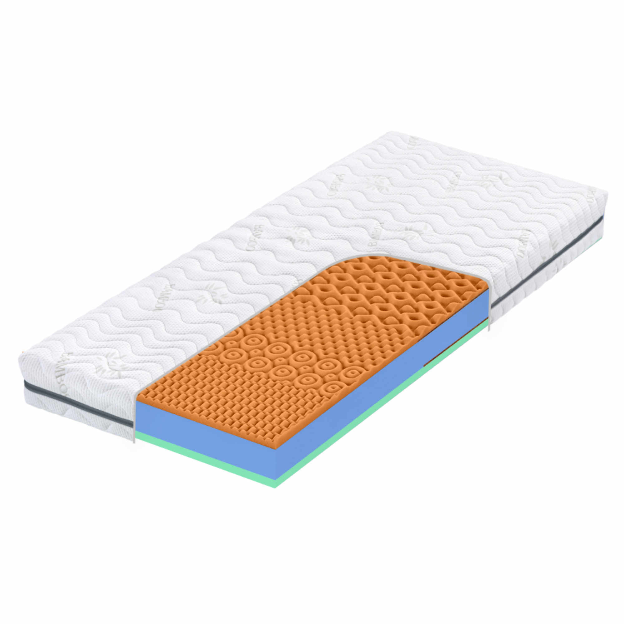 Zdravý odpočinok podporia panvové výstuhy z kokosových vlákien a tiež 3D 7-zónový profil s masážnou funkciou. Stredová časť matraca je vyrobená zo studenej extra pružnej peny Flexifoam®. Farebné vyhotovenie jednotlivých penových vrstiev sa môže od uvedených fotografií líšiť, avšak ich vlastnosti zostávajú rovnaké. Vďaka svojej poddajnosti je matrac vhodný aj pre mechanicky a motorom polohovateľné lamelové rošty, možno využiť aj na klasické rošty latkové. Odporúčaná nosnosť je do 135 kg na lôžko.