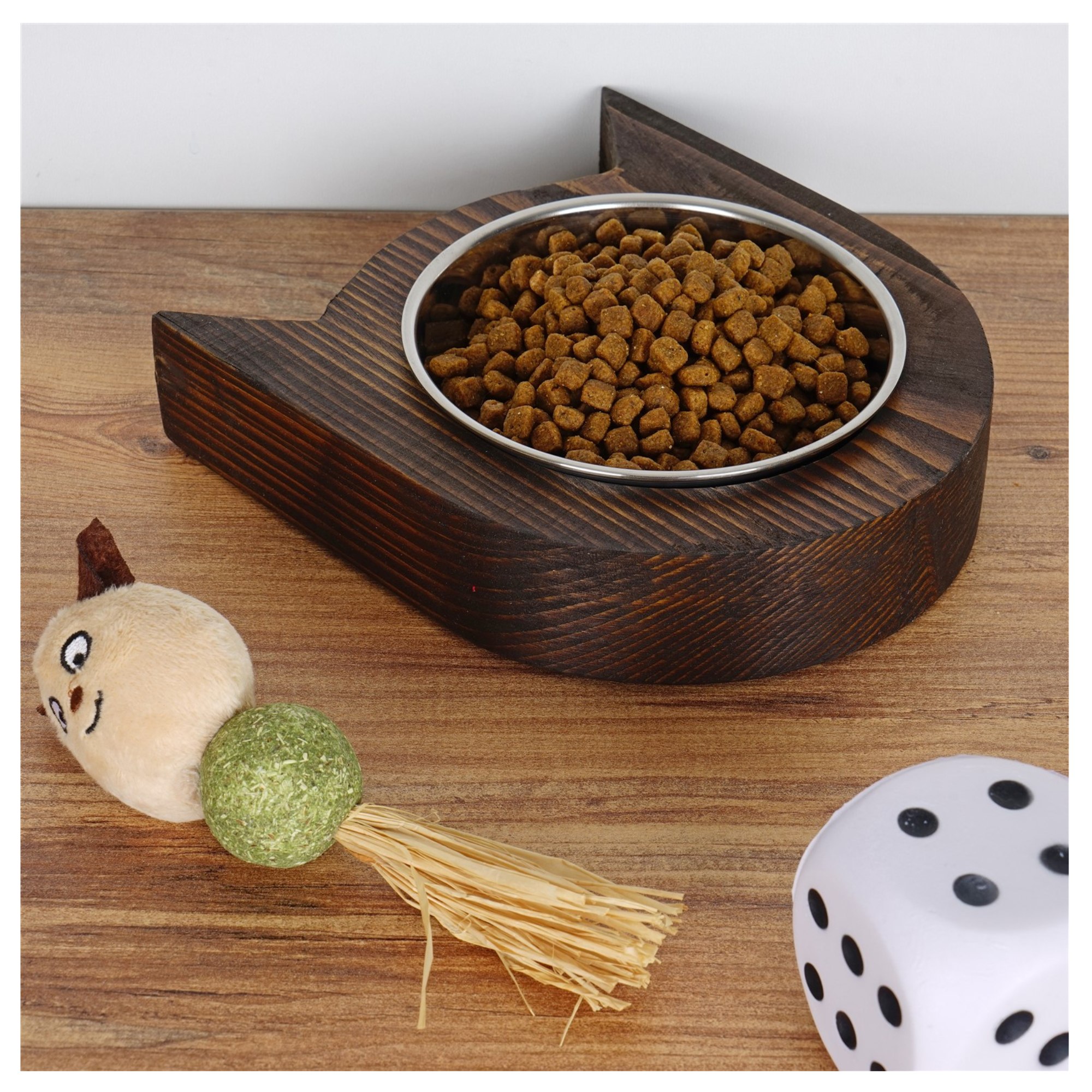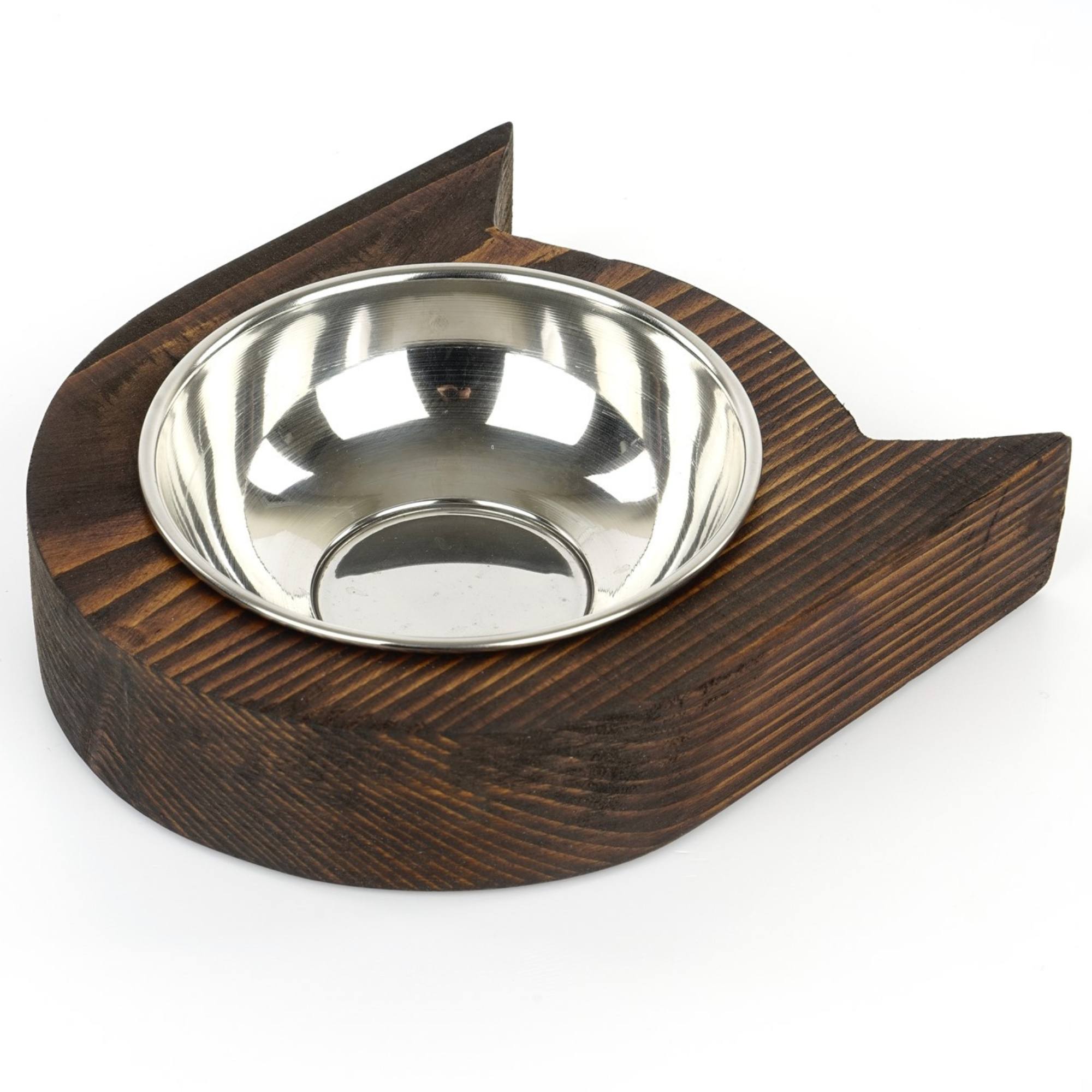 Kovová miska PET 2 v elegantnom drevenom stojane v tvare mačacej hlavy je ideálnou voľbou pre všetkých milovníkov domácich miláčikov.
