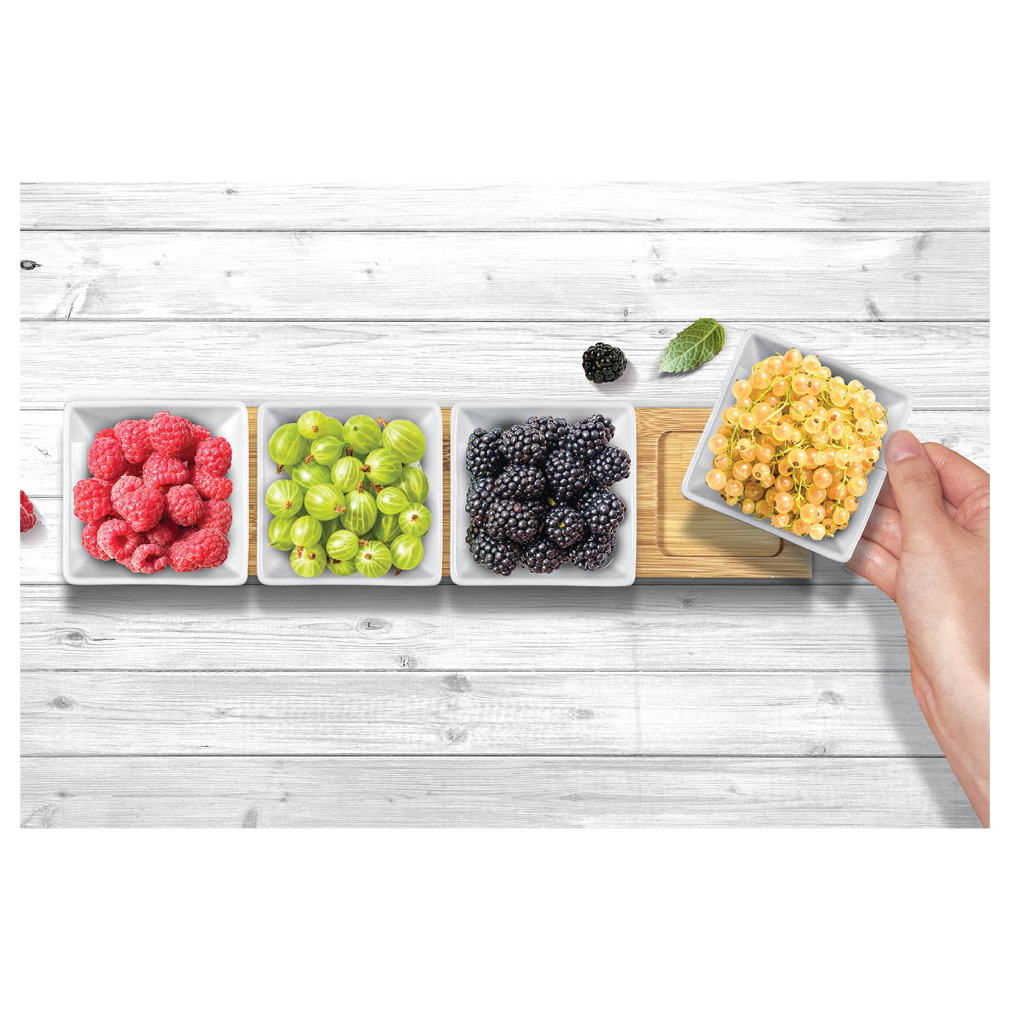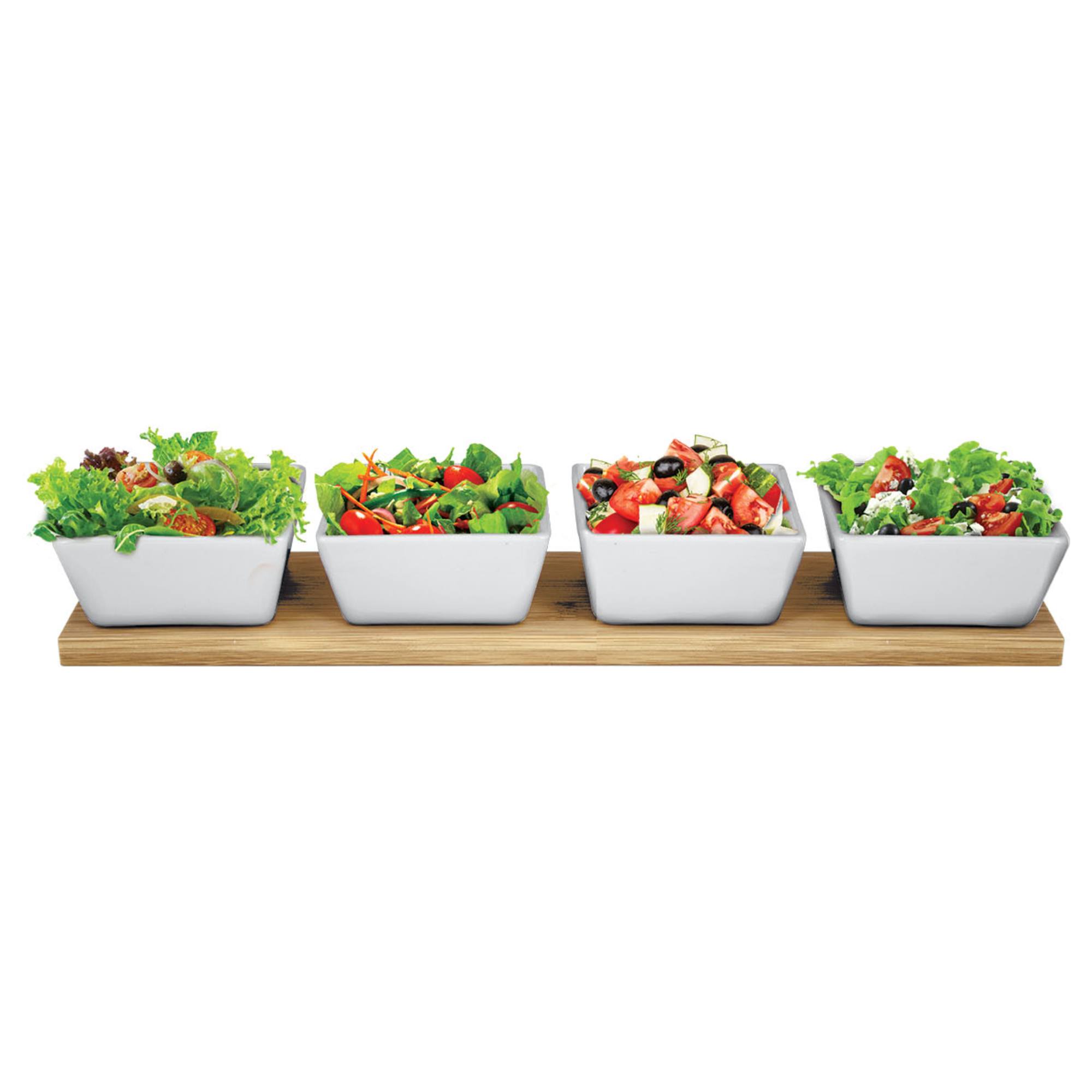 4 identické misky vyrobené z kvalitného porcelánu sú ideálne na komfortné servírovanie najrôznejších pochúťok. Misky sú doplnené o praktickú tácku na ľahkú manipuláciu, ktorá je vyrobená z bambusového dreva.
