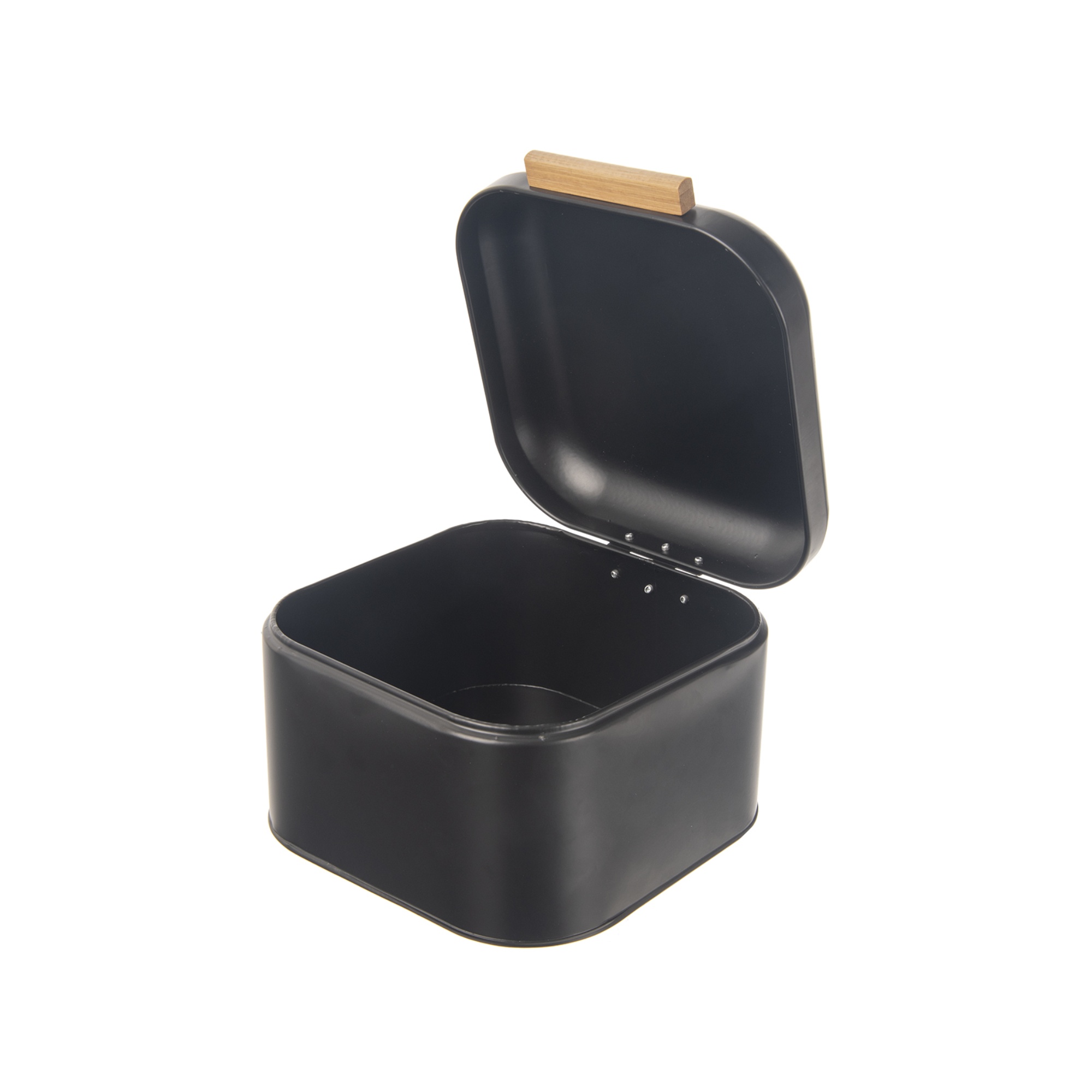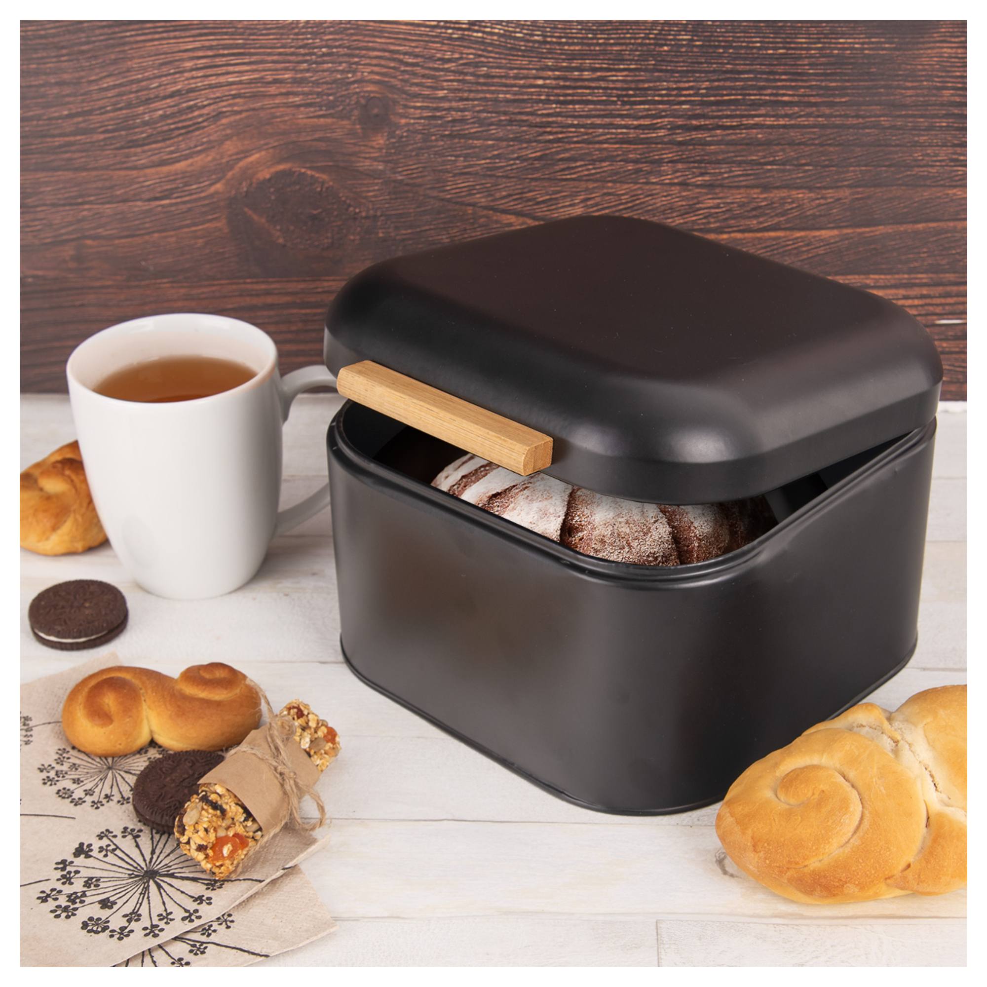 Plechový box v klasickej čiernej farbe disponuje výklopným vekom, vďaka ktorému je uložené pečivo chránené pred vonkajšími vplyvmi. Jednoduchú manipuláciu s vekom zaisťuje kontrastná bambusová rúčka. Vďaka jej minimalistickému dizajnu a výraznej farbe dokonale vynikne v moderne riešených kuchyniach.