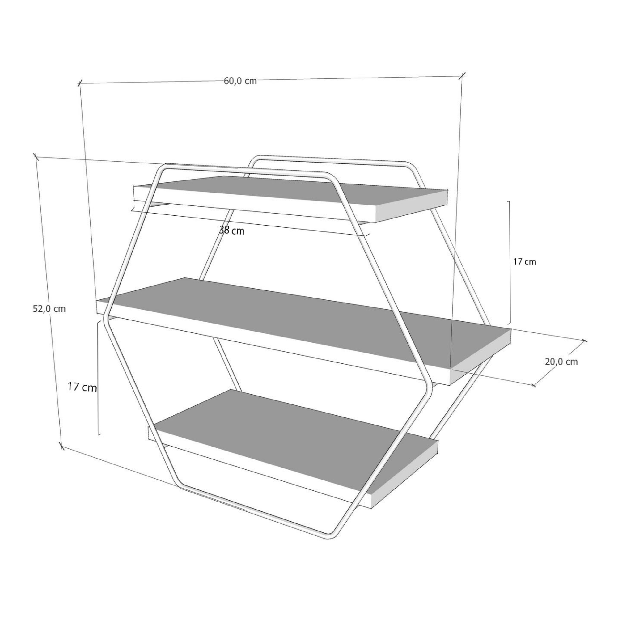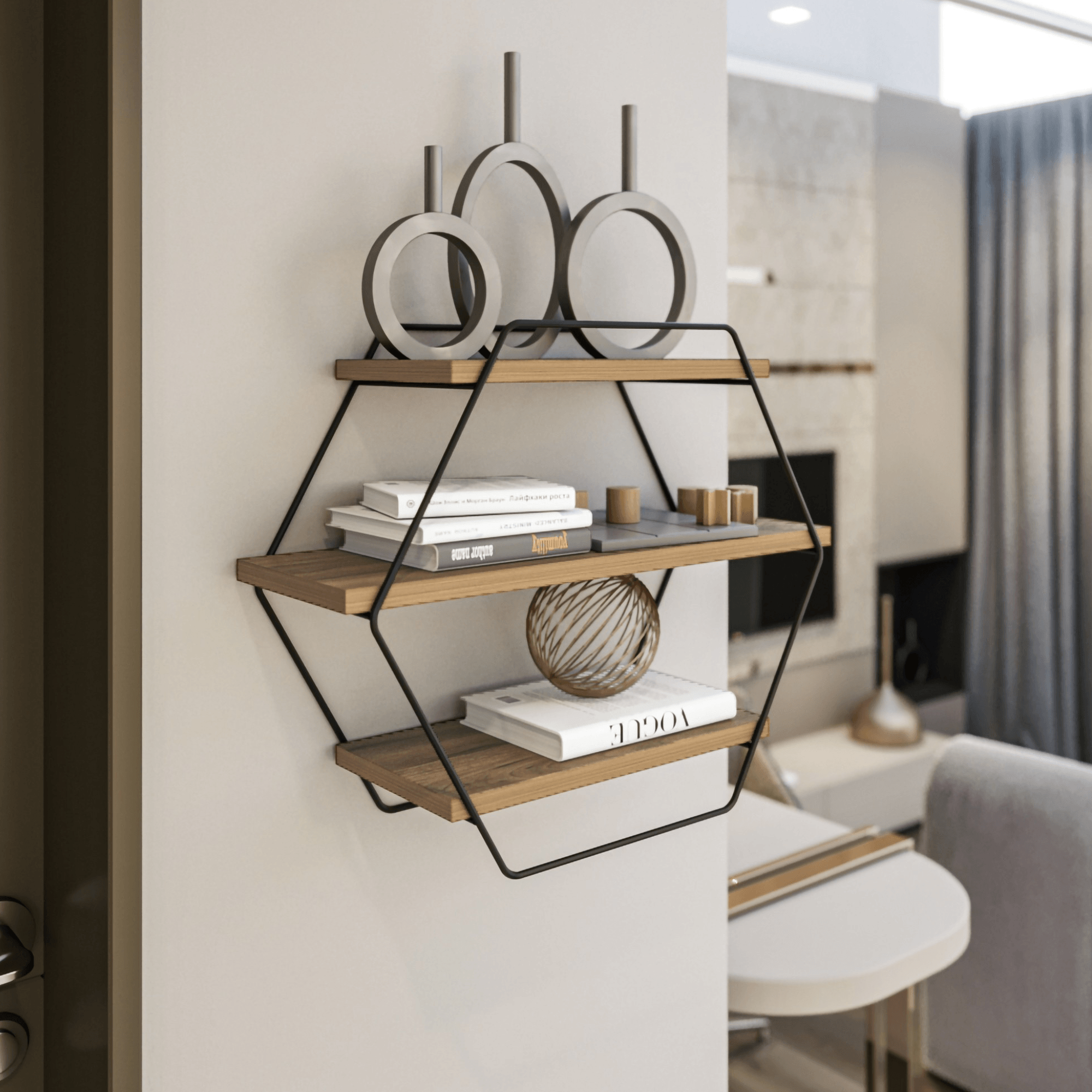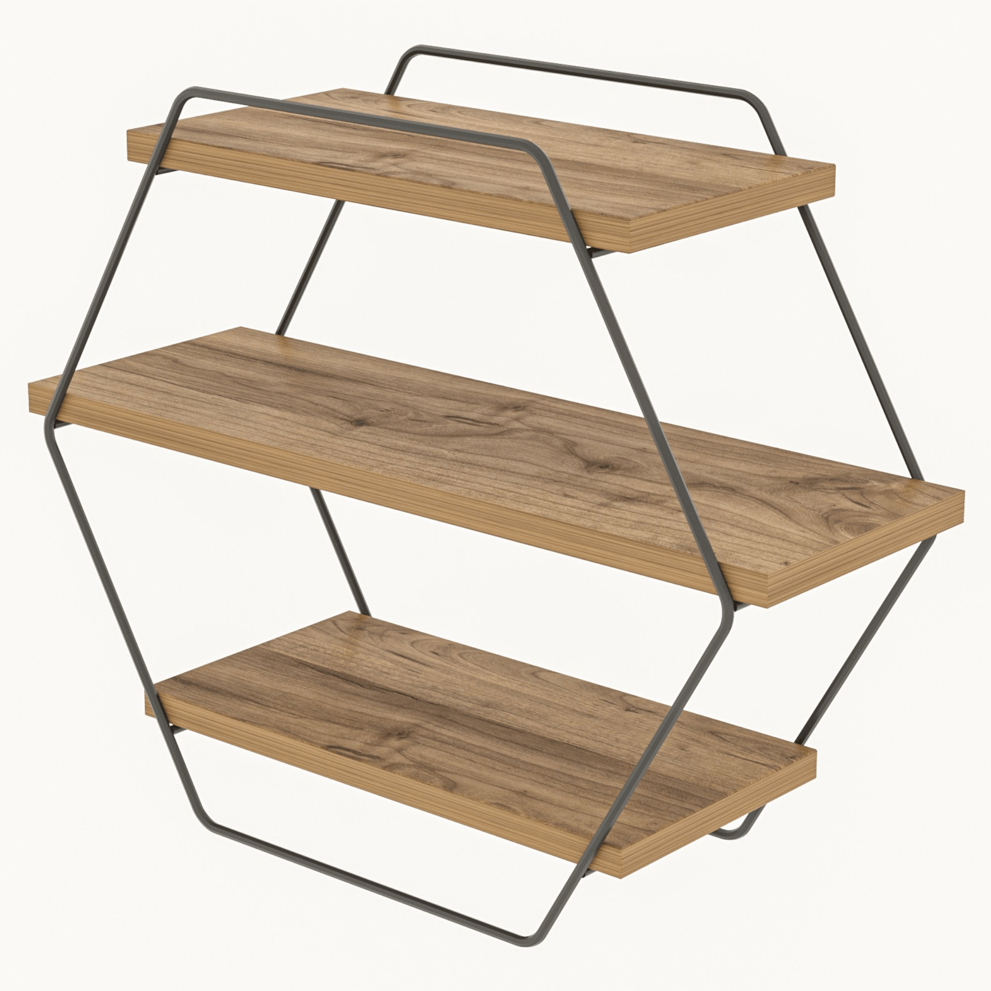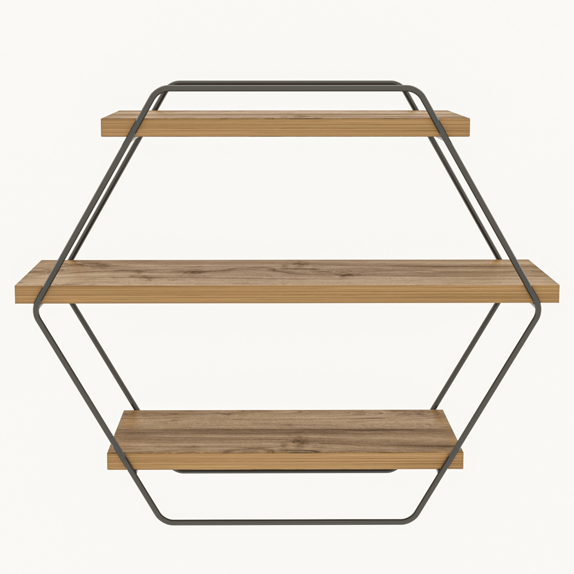 Nástenná polica AZRA vás na prvý pohľad zaujme predovšetkým svojim originálnym tvarom. Skladá sa z čiernej kovovej konštrukcie, do ktorej sú zasadené 3 police z melamínovej drevotrieskovej dosky v drevitom dekore borovice. Najlepšie zapadne do moderne ladených interiérov, ale jej jednoduché vyhotovenie z nej robí veľmi univerzálny kúsok. Vďaka jej multifunkčnému využitiu ju môžete pripevniť prakticky do každej časti vášho domova. Nech už ju umiestnite kamkoľvek, tak výborne poslúži na uloženie kníh, rastlín, fotografií a dlhších dekoračných predmetov.