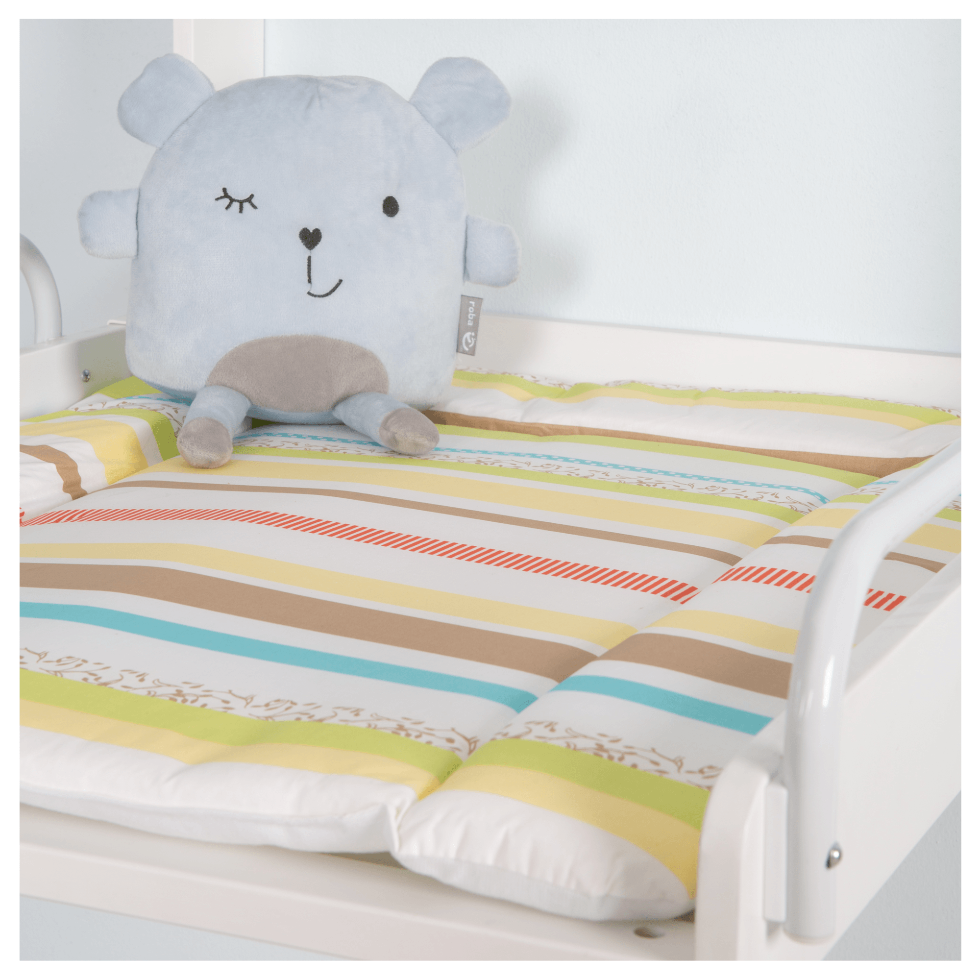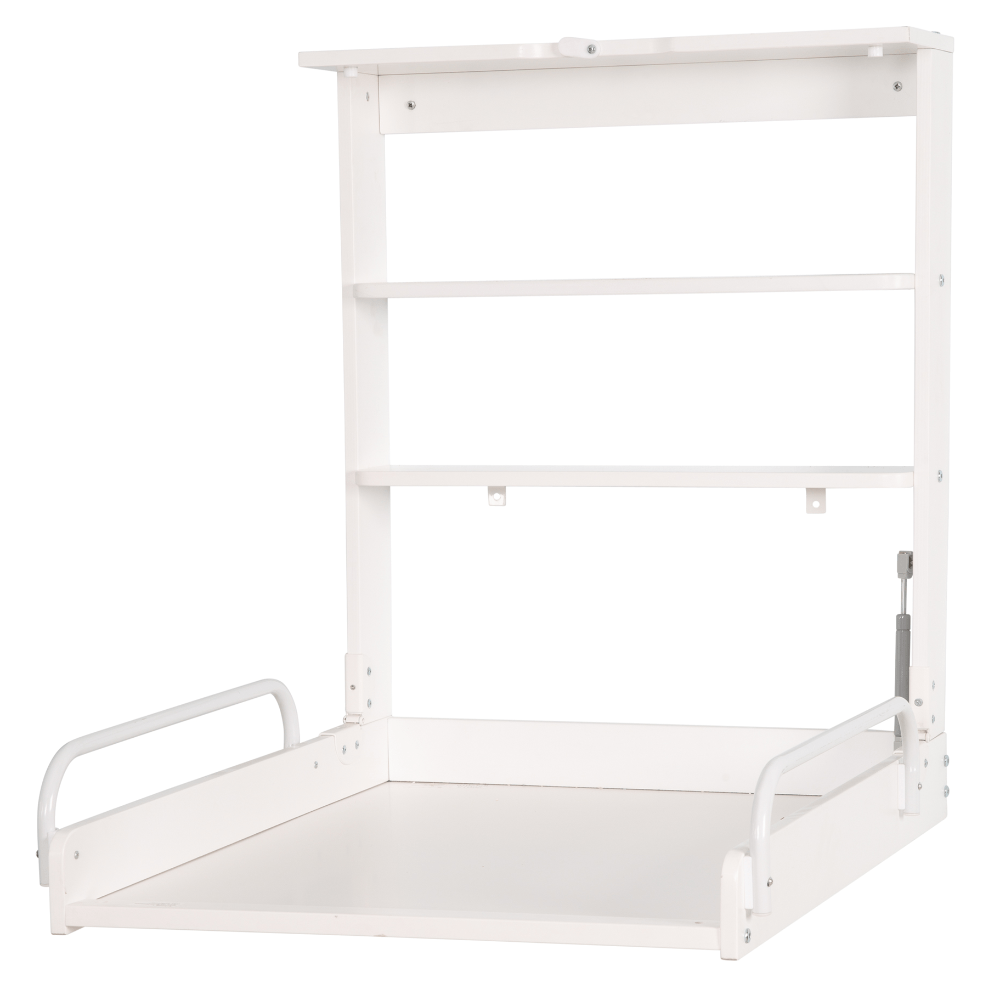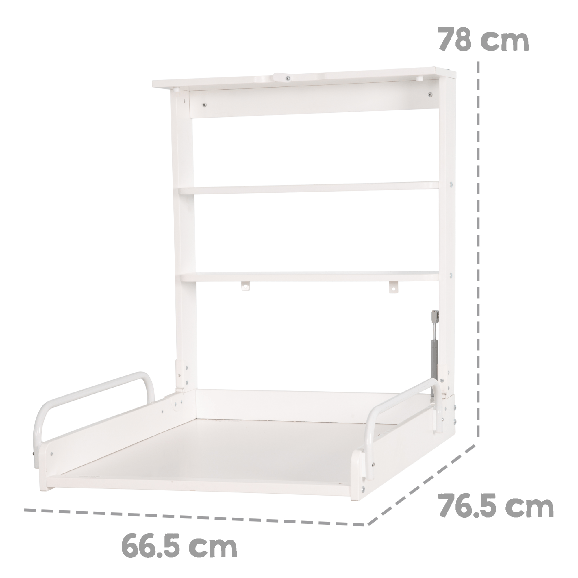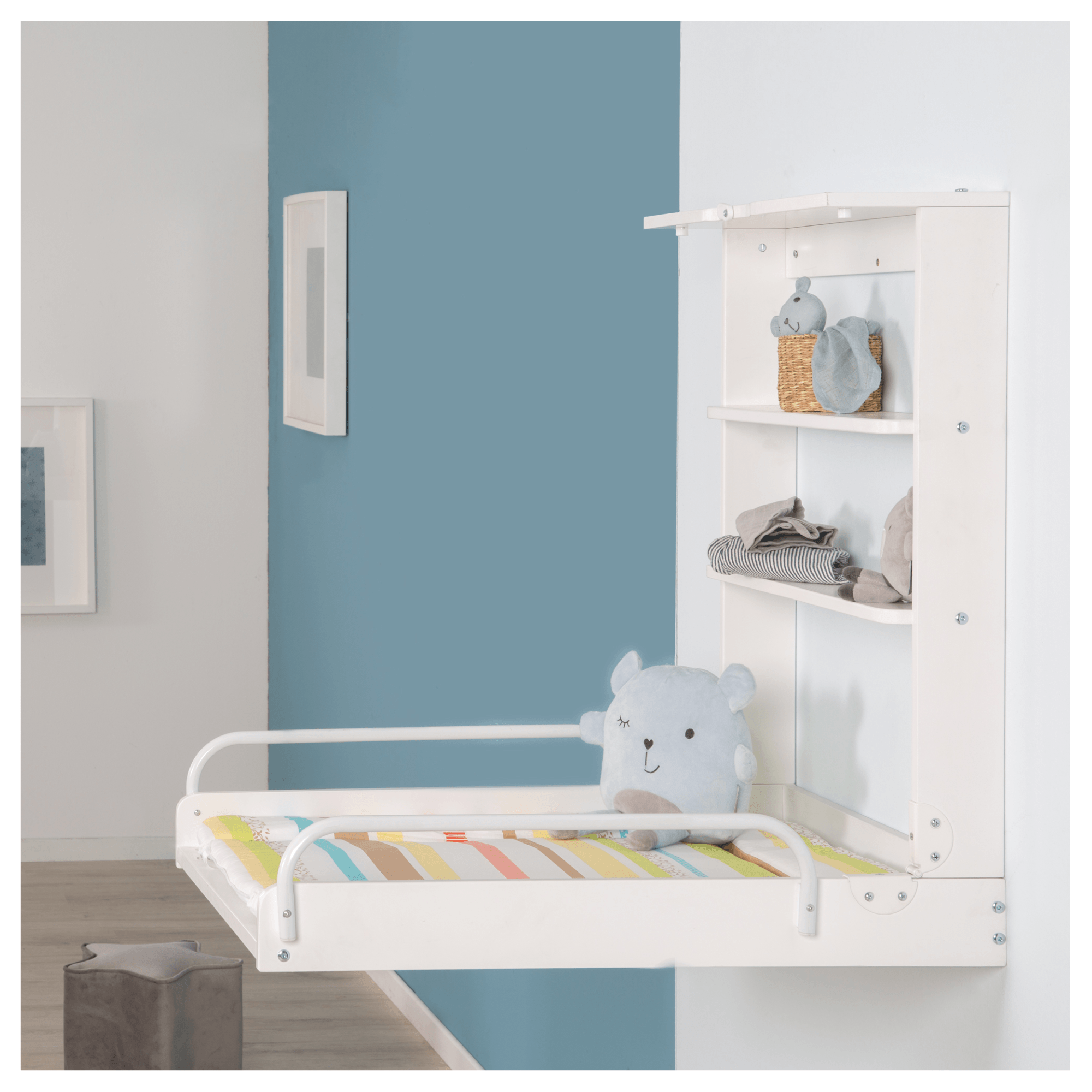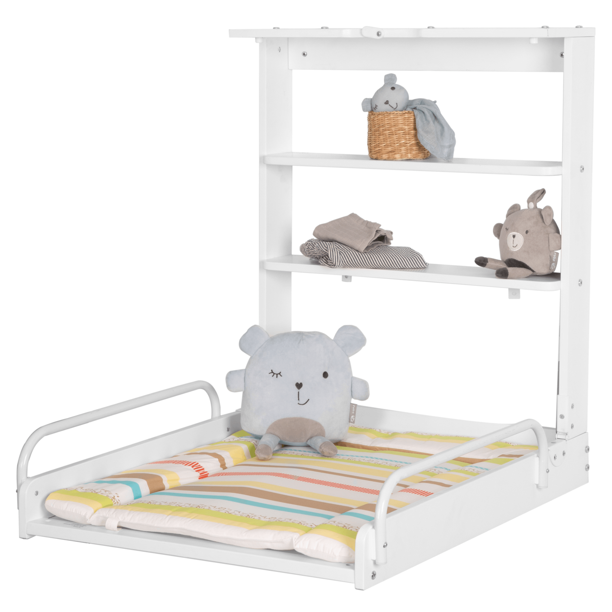 Vyrobená je dreveného materiálu lakovaného bielou farbou, ktorá vytvára jednoduchý vzhľad a zároveň je šetrná k detskej pokožke. Praktické nástenné vyhotovenie s výklopným pultom šetrí váš chrbát a zároveň nezaberá cenné miesto v interiéri. Súčasťou výklopnej časti, ktorú bez problémov otvoríte jednou rukou, sú bezpečnostné bočné zábrany, ktoré zaisťujú väčšiu bezpečnosť počas starostlivosti o bábätko. Obsahuje aj 2 vnútorné police, ktoré sú ideálne na uloženie hračiek, detskej kozmetiky a ďalších nevyhnutností. Súčasťou dodávky je aj prebaľovacia podložka vo veľkosti 59x72 cm vyrobená zo zmesi bavlny a polyesteru a potiahnutá polyuretánom, ktorý je ľahko umývateľný, príjemný k pokožke a neobsahuje ftaláty.