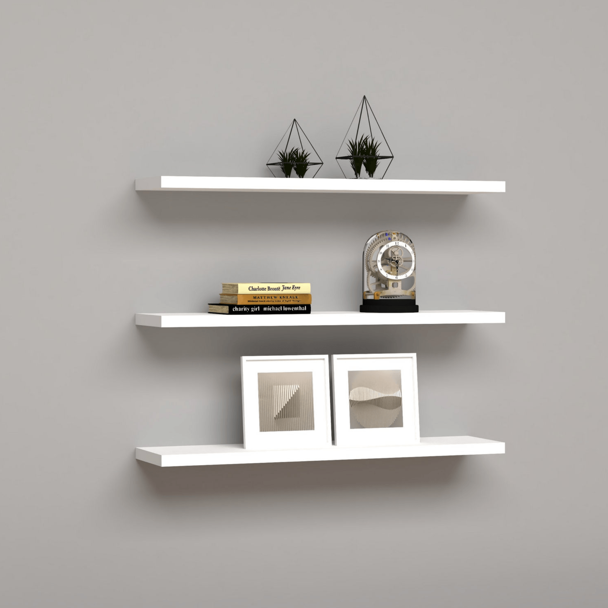 Súčasťou sady sú tri kusy rovnakej veľkosti, ktoré vám pomôžu dotvoriť domov podľa vašich predstáv. Hravo doplnia nudné a prázdne steny. Vďaka ich multifunkčnému využitiu ich môžete umiestniť prakticky do každej časti vášho domova. Nech už ich umiestnite kamkoľvek, tak výborne poslúžia na umiestnenie kníh, rastlín, fotografií a dlhších dekoračných predmetov. Vyrobené sú z dreveného materiálu potiahnutého melamínom.