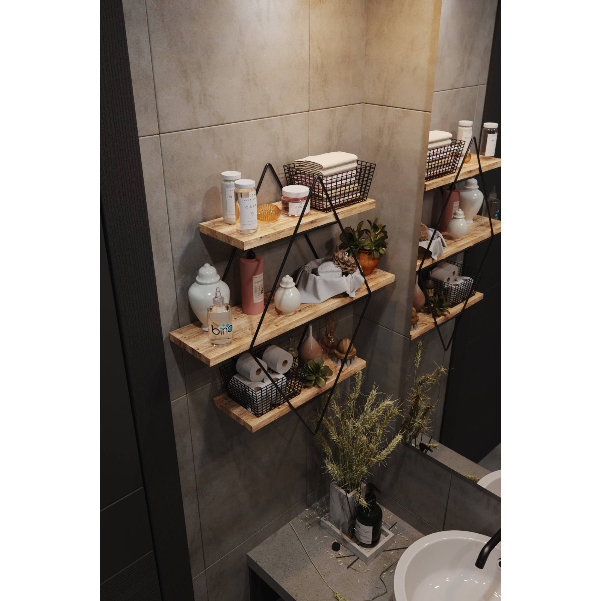 - Kombinácia lakovaného kovu a políc v dekore dreva