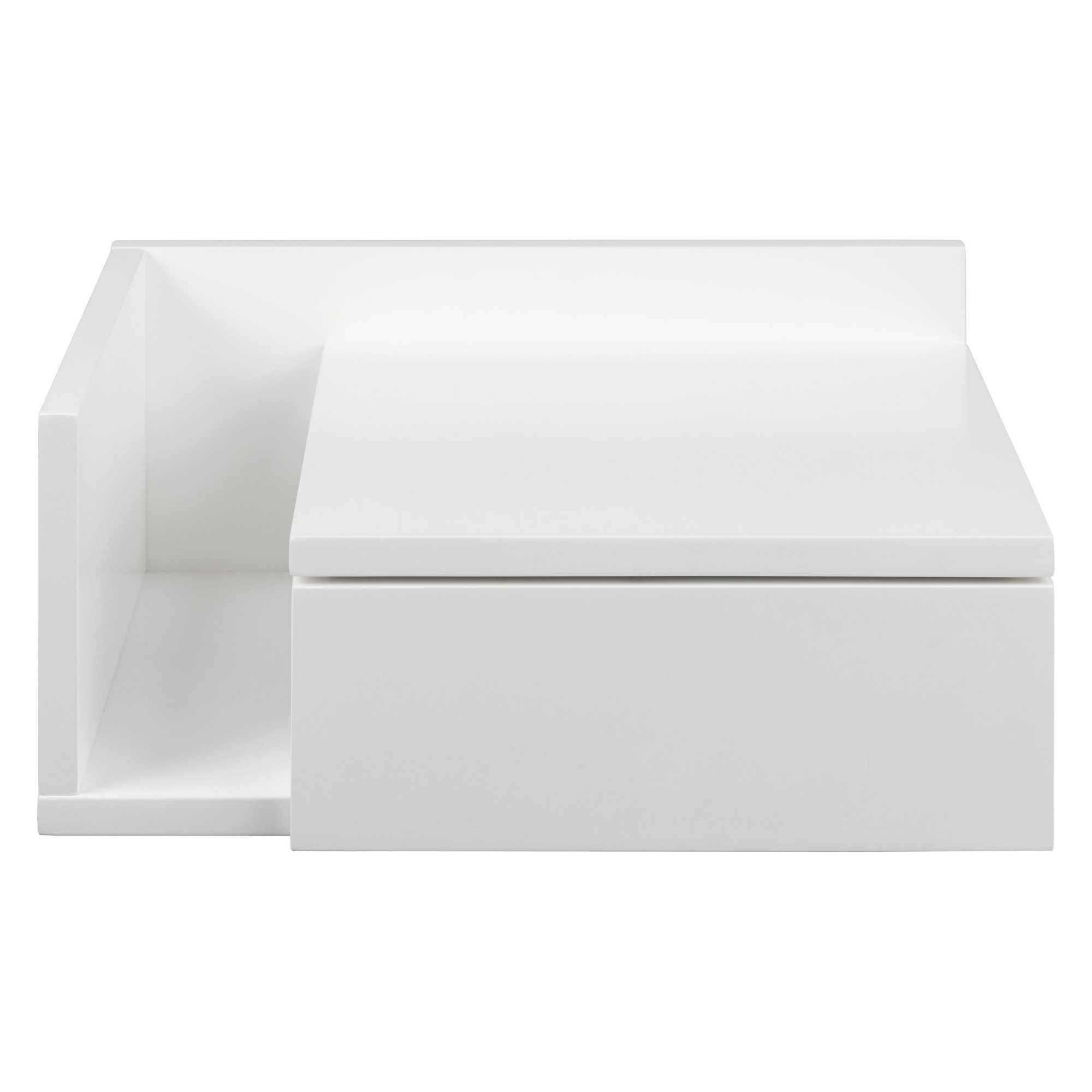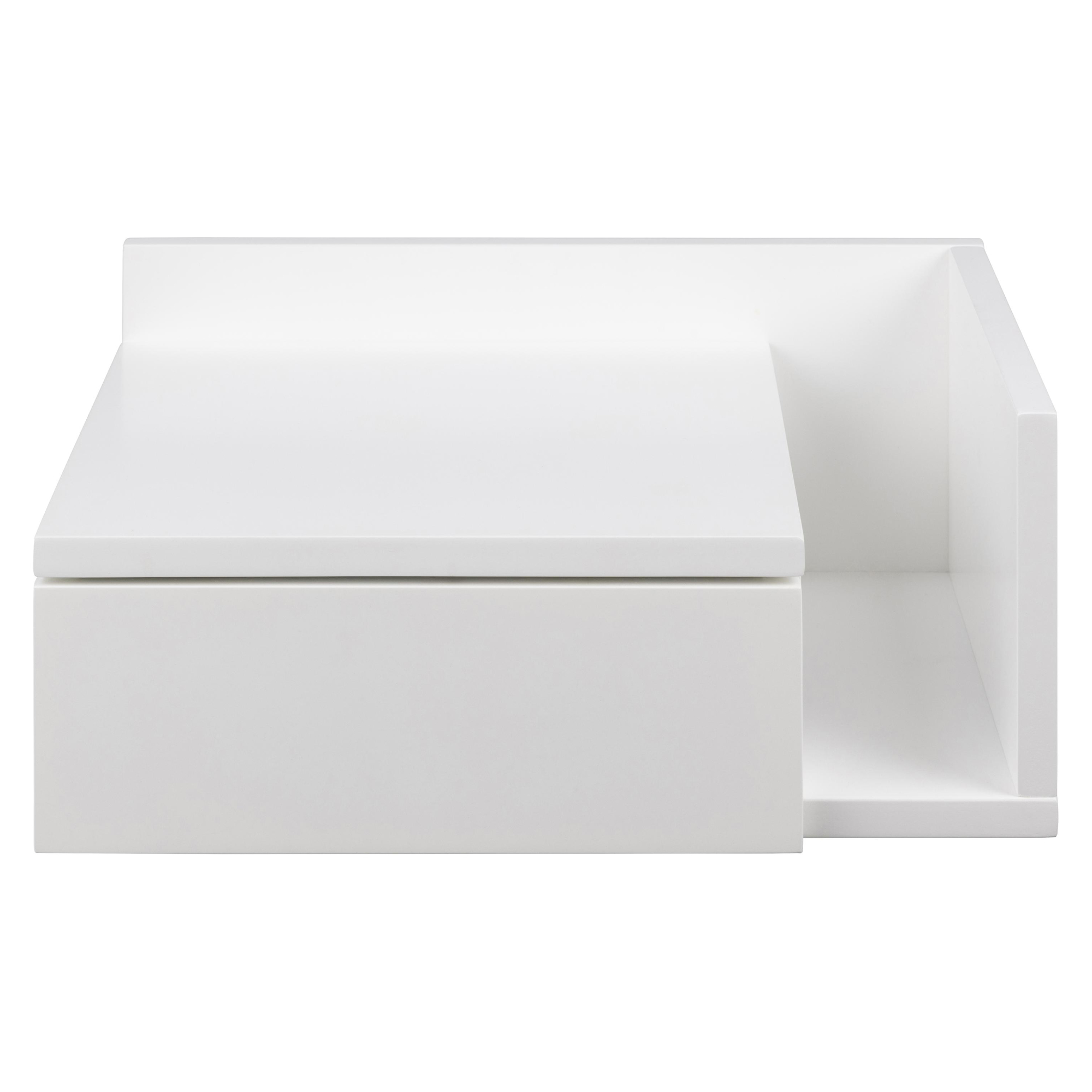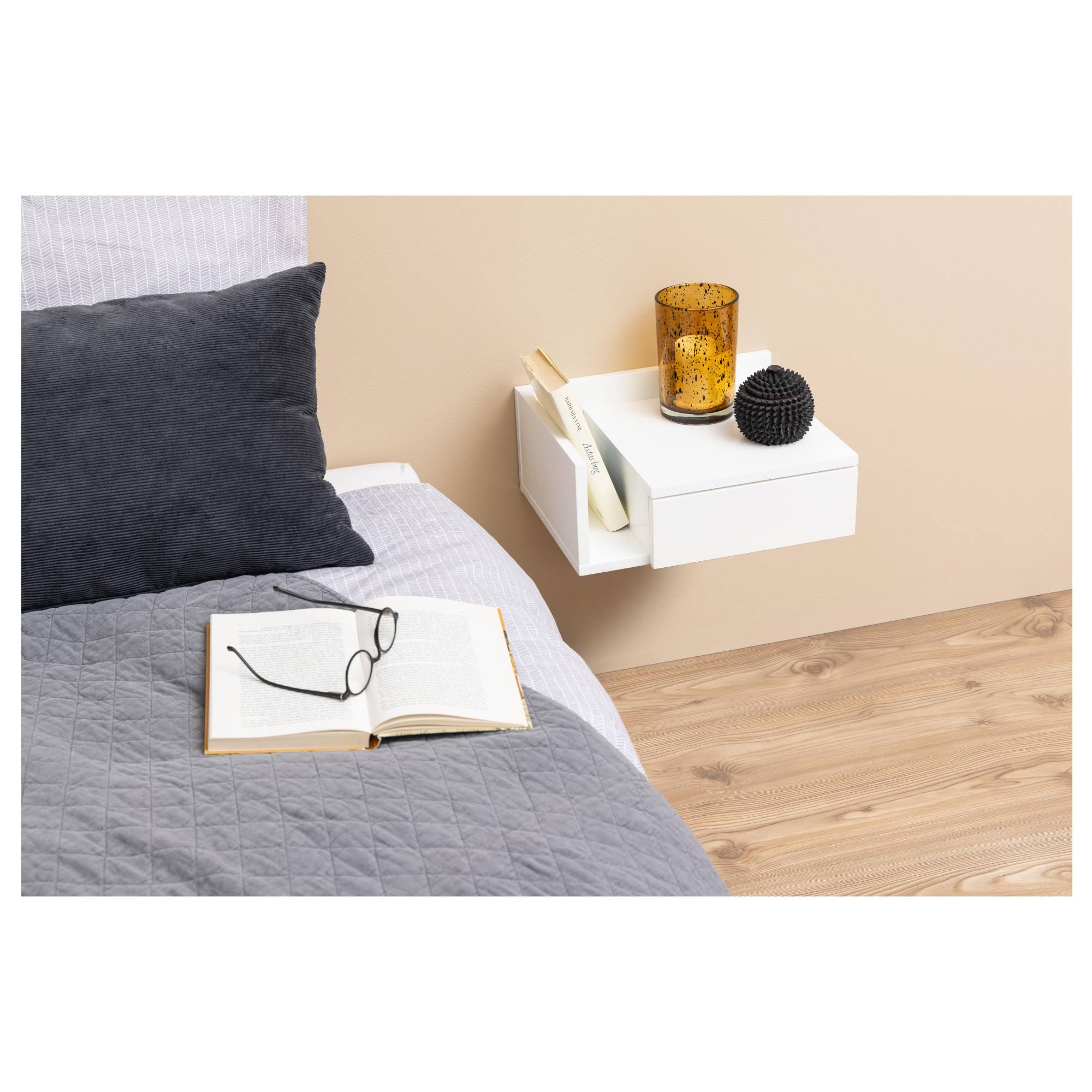 Tento nočný stolík v jednofarebnom vyhotovení s čistými líniami dodá vašej spálni na funkčnosti a prirodzenom vzhľade. Primontujte ho na stenu vedľa postele do vami preferovanej výšky a užite si jeho funkčné prvky. Stolík obsahuje zásuvku s bezrúčkovým otváraním a kovovými koľajničkami, ktoré umožňujú plný výsuv. Vedľa zásuvky stolík ponúka aj otvorenú priehradku, ktorá môže byť na ľavej alebo pravej strane podľa vašej preferencie počas montáže. Na odloženie mobilného telefónu, budíka a ďalších nevyhnutností môžete samozrejme využiť aj vrchnú dosku.
