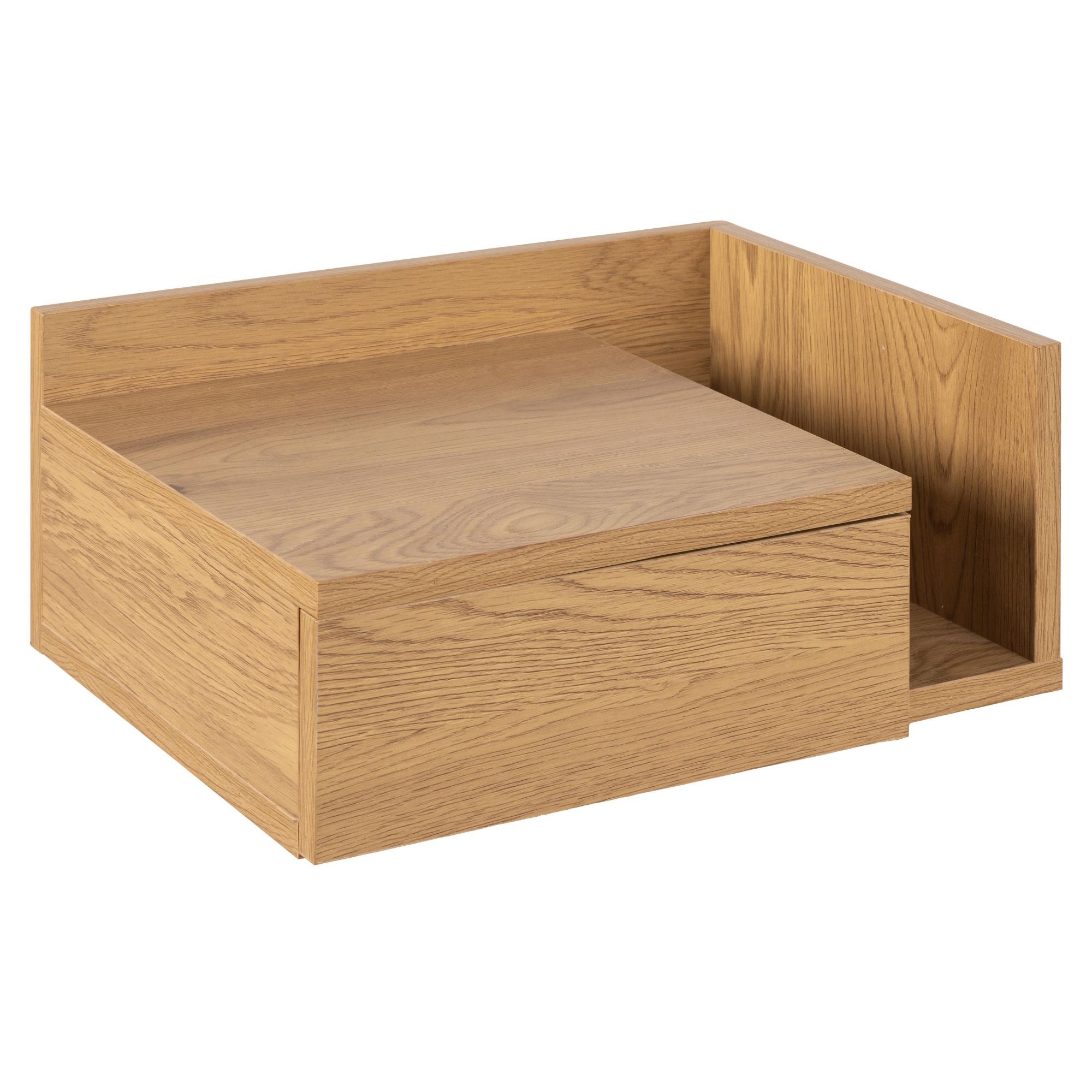 Tento nočný stolík v jednofarebnom vyhotovení s čistými líniami dodá vašej spálni na funkčnosti a prirodzenom vzhľade. Primontujte ho na stenu vedľa postele do vami preferovanej výšky a užite si jeho funkčné prvky. Stolík obsahuje zásuvku s bezrúčkovým otváraním a kovovými koľajničkami, ktoré umožňujú plný výsuv. Vedľa zásuvky stolík ponúka aj otvorenú priehradku, ktorá môže byť na ľavej alebo pravej strane podľa vašej preferencie počas montáže. Na odloženie mobilného telefónu, budíka a ďalších nevyhnutností môžete samozrejme využiť aj vrchnú dosku.