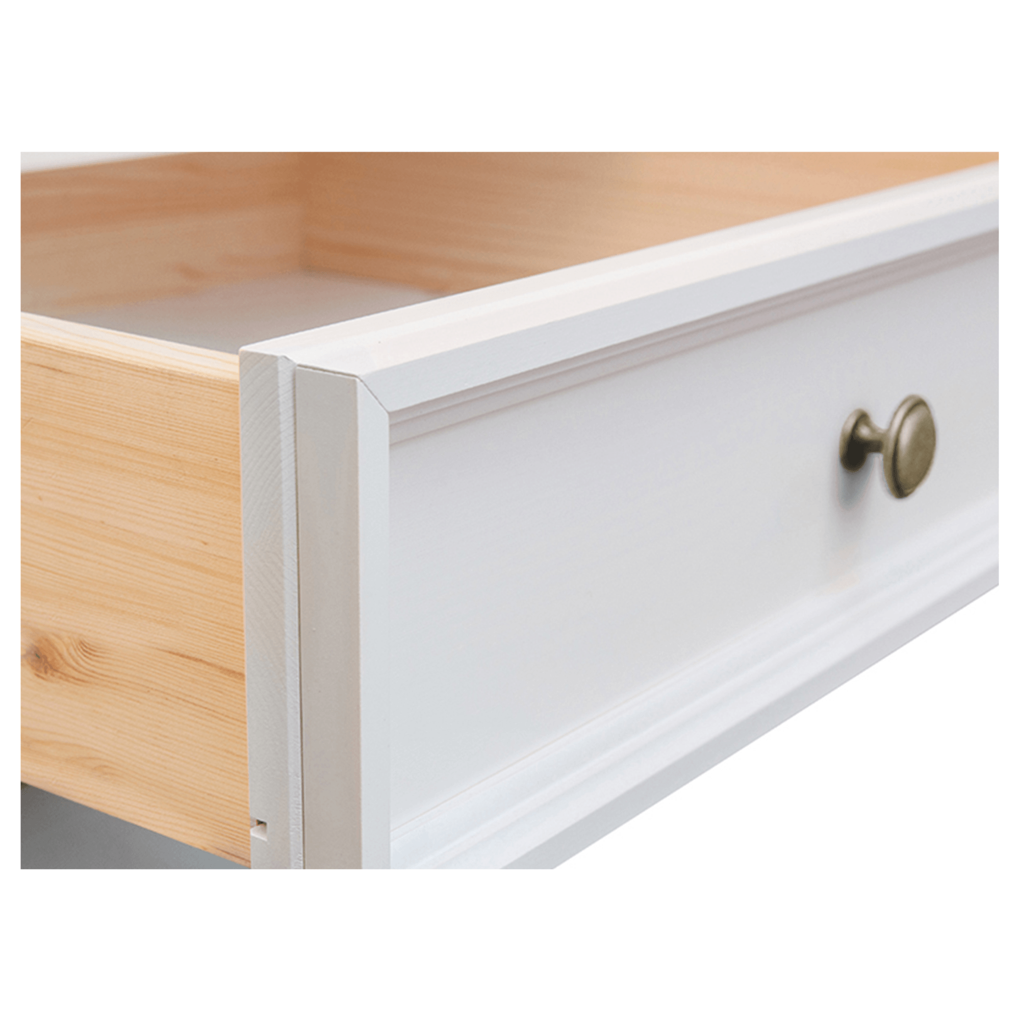 Vyrobený je z masívneho dreva fínskej borovice, ktoré dodáva konštrukcii potrebnú pevnosť, odolnosť a dlhú životnosť. Aj napriek bielej farbe, ktorá dodá miestnosti čistý vzhľad, je poznať originálna kresba dreva. Dekoratívne frézovanie predných plôch a ozdobný pilaster dotvára celkový vidiecky vzhľad s romantickým nádychom. Stolík je vybavený 2 zásuvkami s tichým dovieraním a kovovými rúčkami, ktoré ľahko nahmatáte aj počas noci. Vrchná odkladacia doska sa postará o predmety, ktoré chcete mať po ruke tesne pred spaním a aj hneď po prebudení.