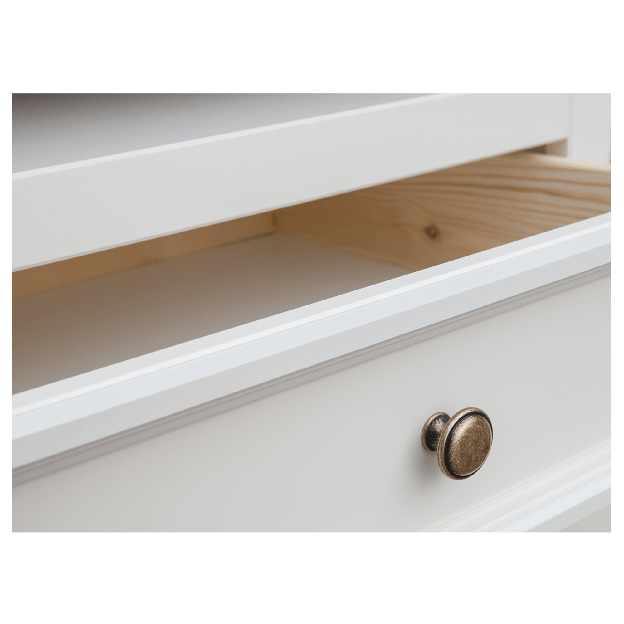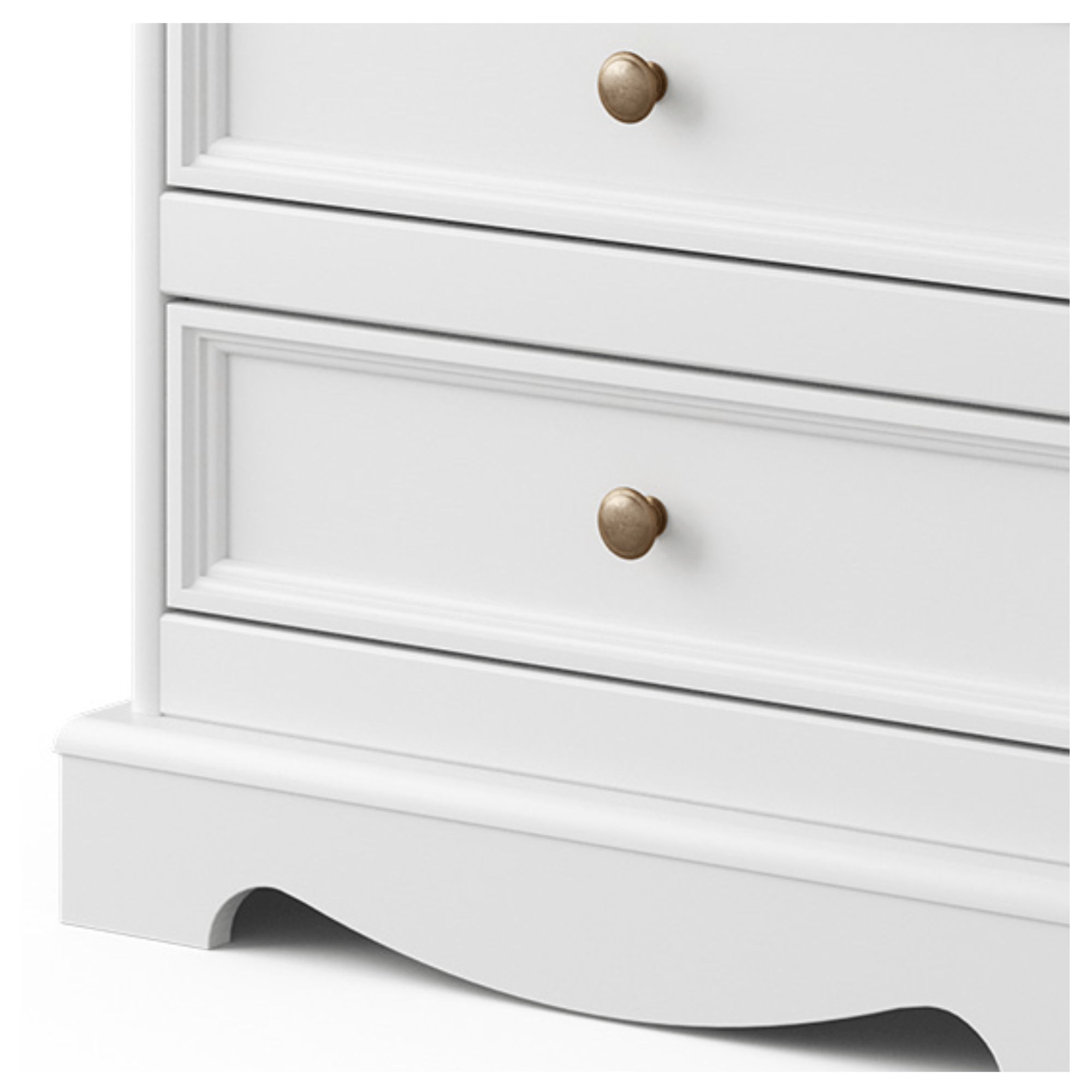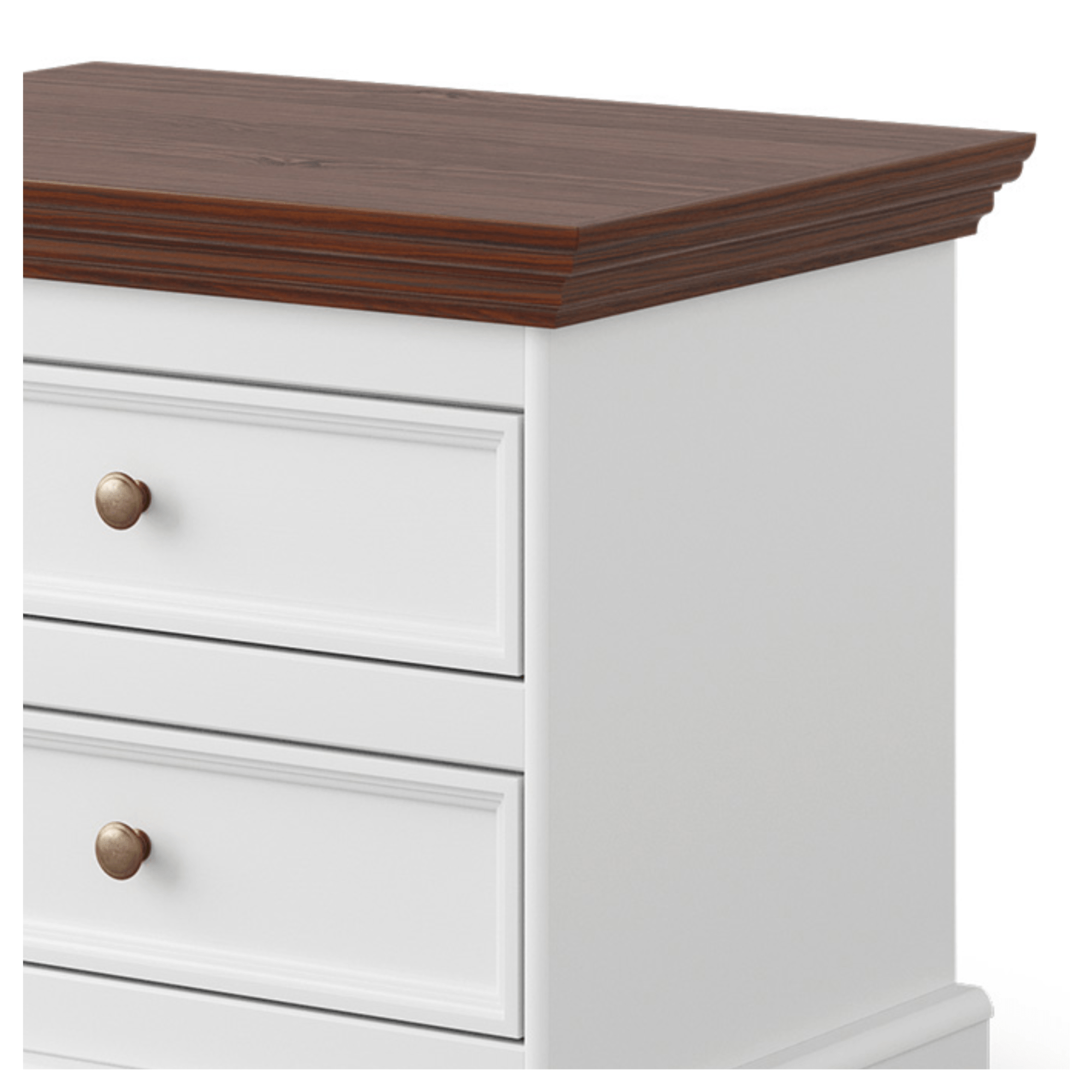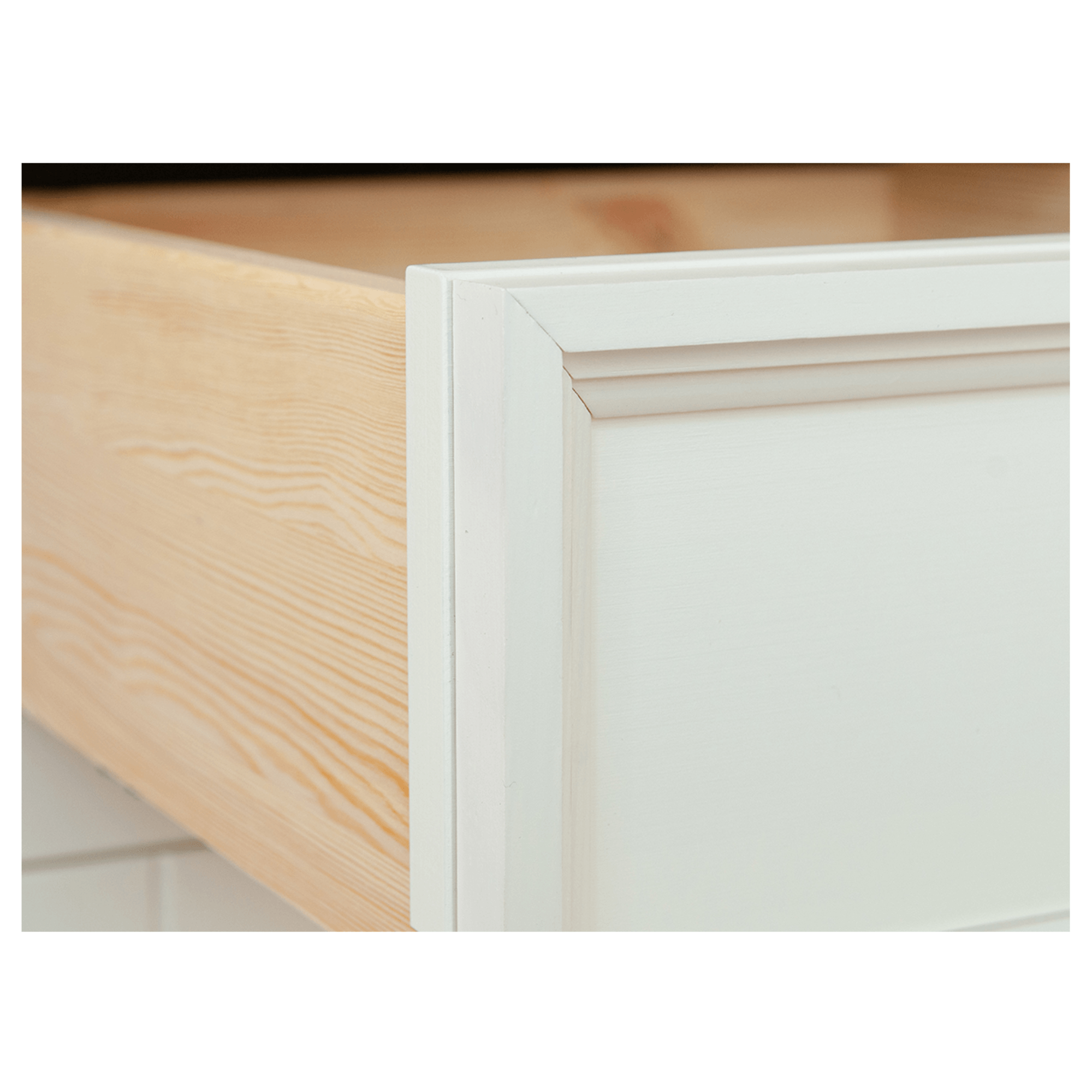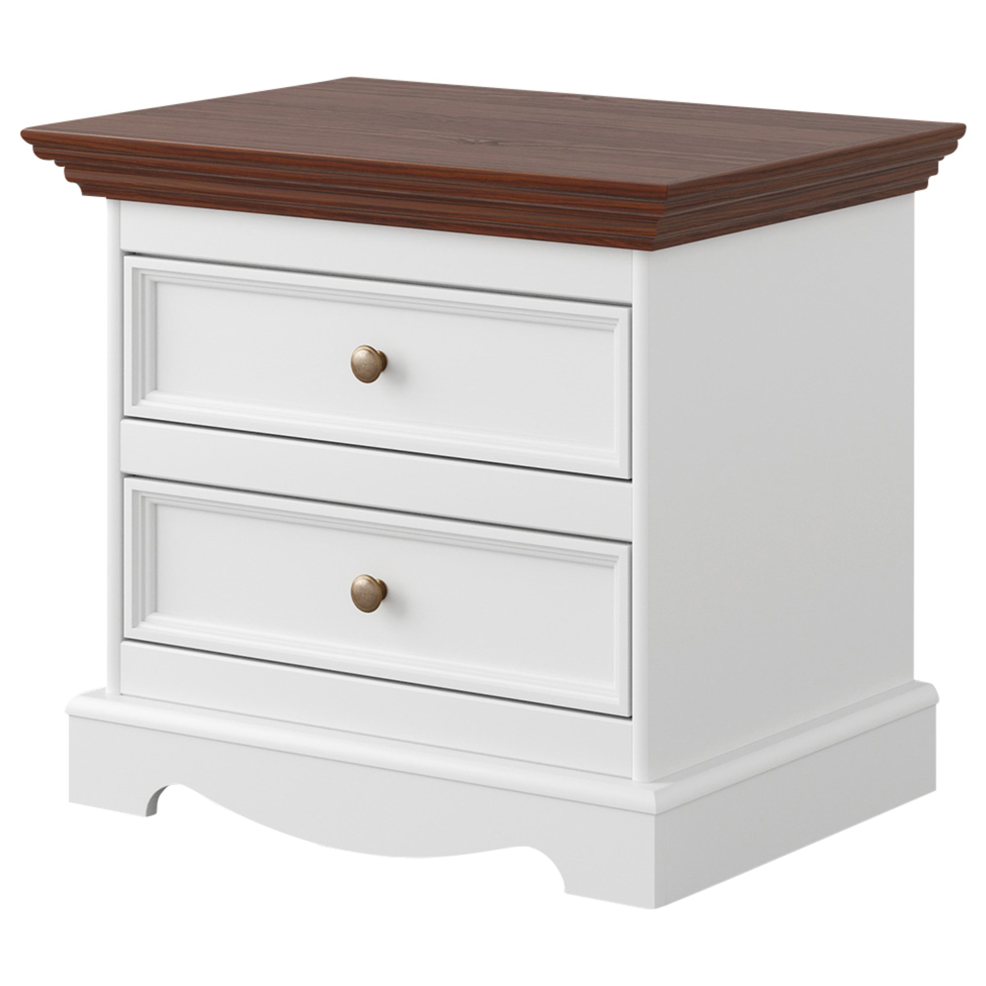 Vyrobený je z masívneho dreva fínskej borovice, ktoré dodáva konštrukcii potrebnú pevnosť, odolnosť a dlhú životnosť. Aj napriek bielej farbe, ktorá dodá miestnosti čistý vzhľad, je poznať originálna kresba dreva. Dekoratívne frézovanie predných plôch a ozdobný pilaster dotvára celkový vidiecky vzhľad s romantickým nádychom. Stolík je vybavený 2 zásuvkami s tichým dovieraním a kovovými rúčkami, ktoré ľahko nahmatáte aj počas noci. Vrchná odkladacia doska sa postará o predmety, ktoré chcete mať po ruke tesne pred spaním a aj hneď po prebudení.