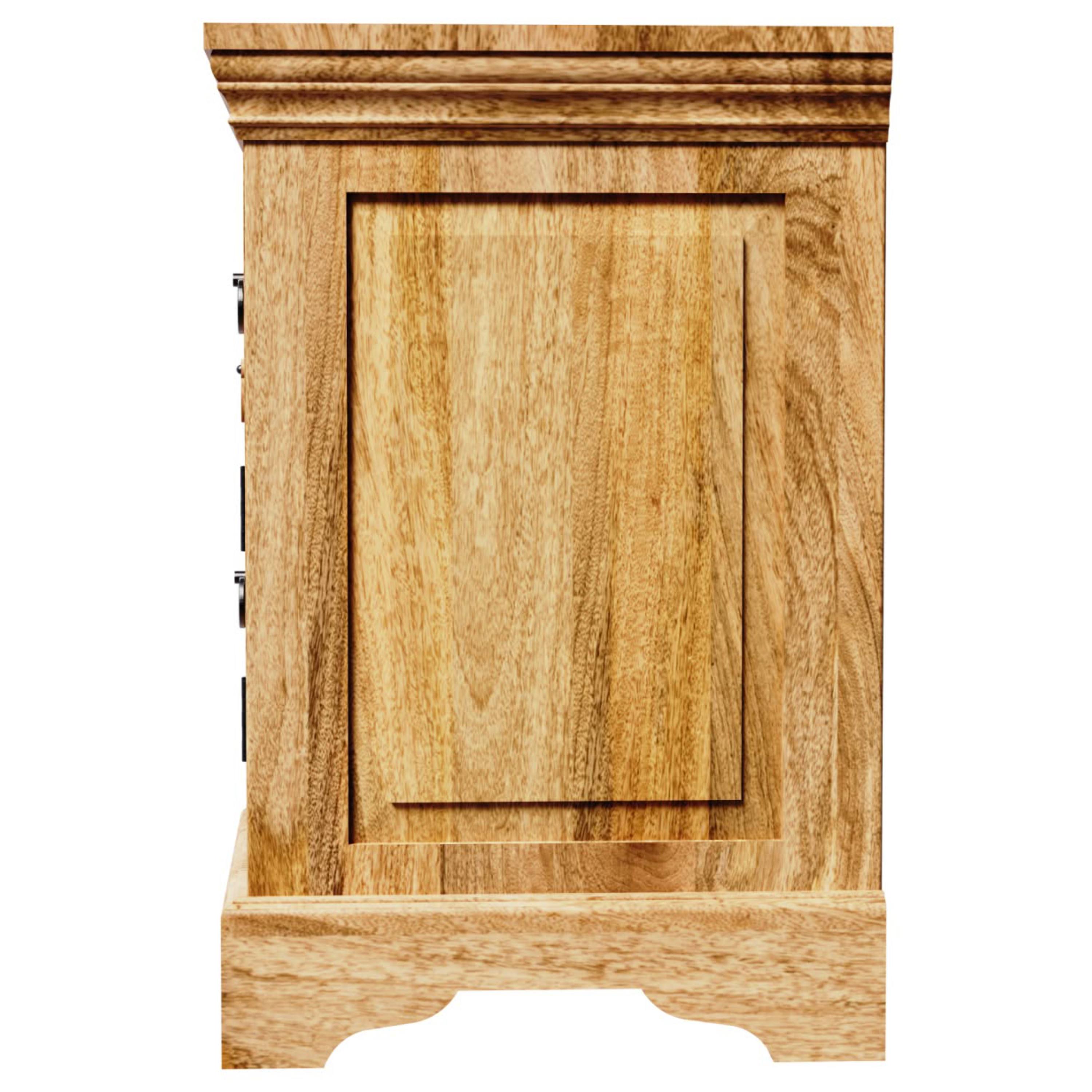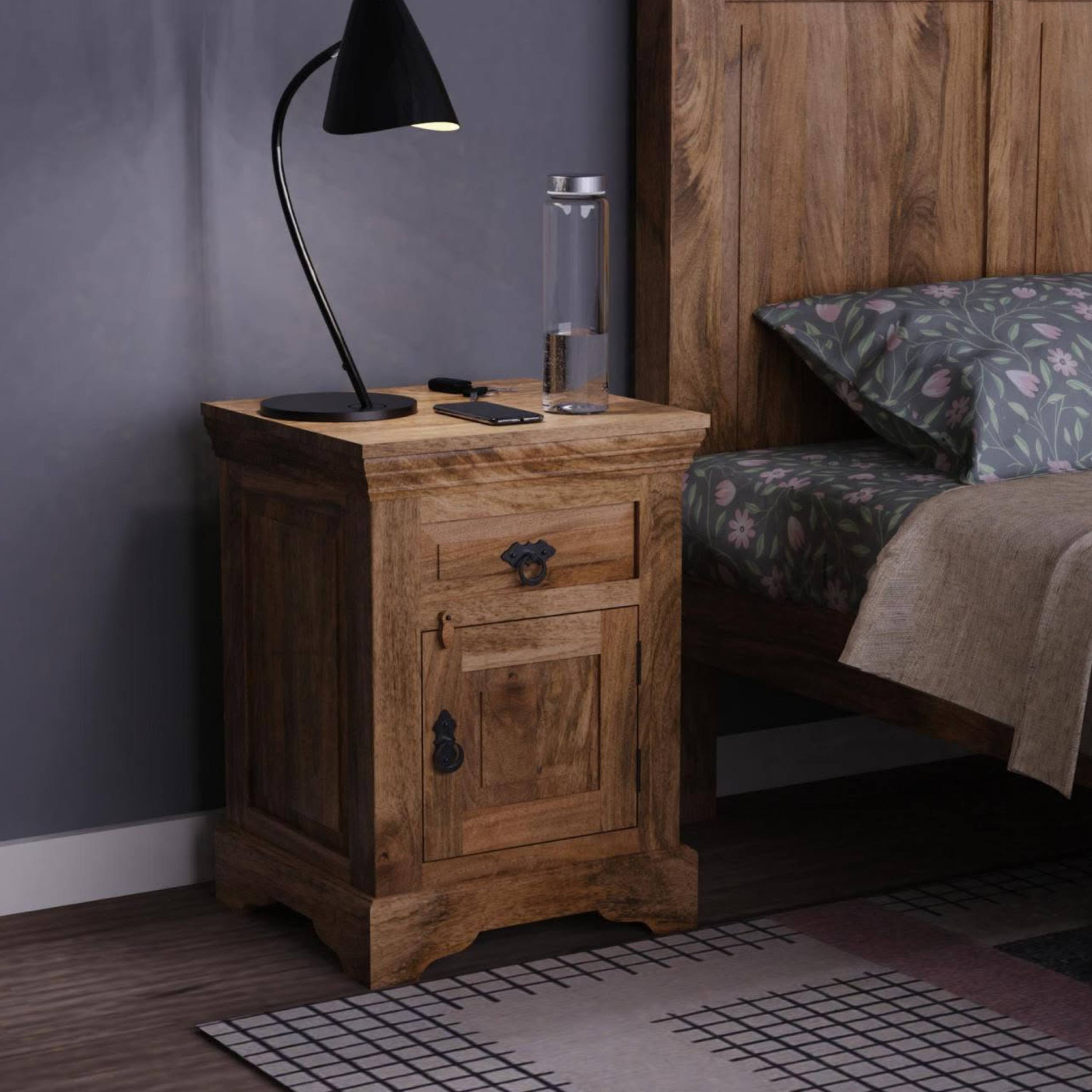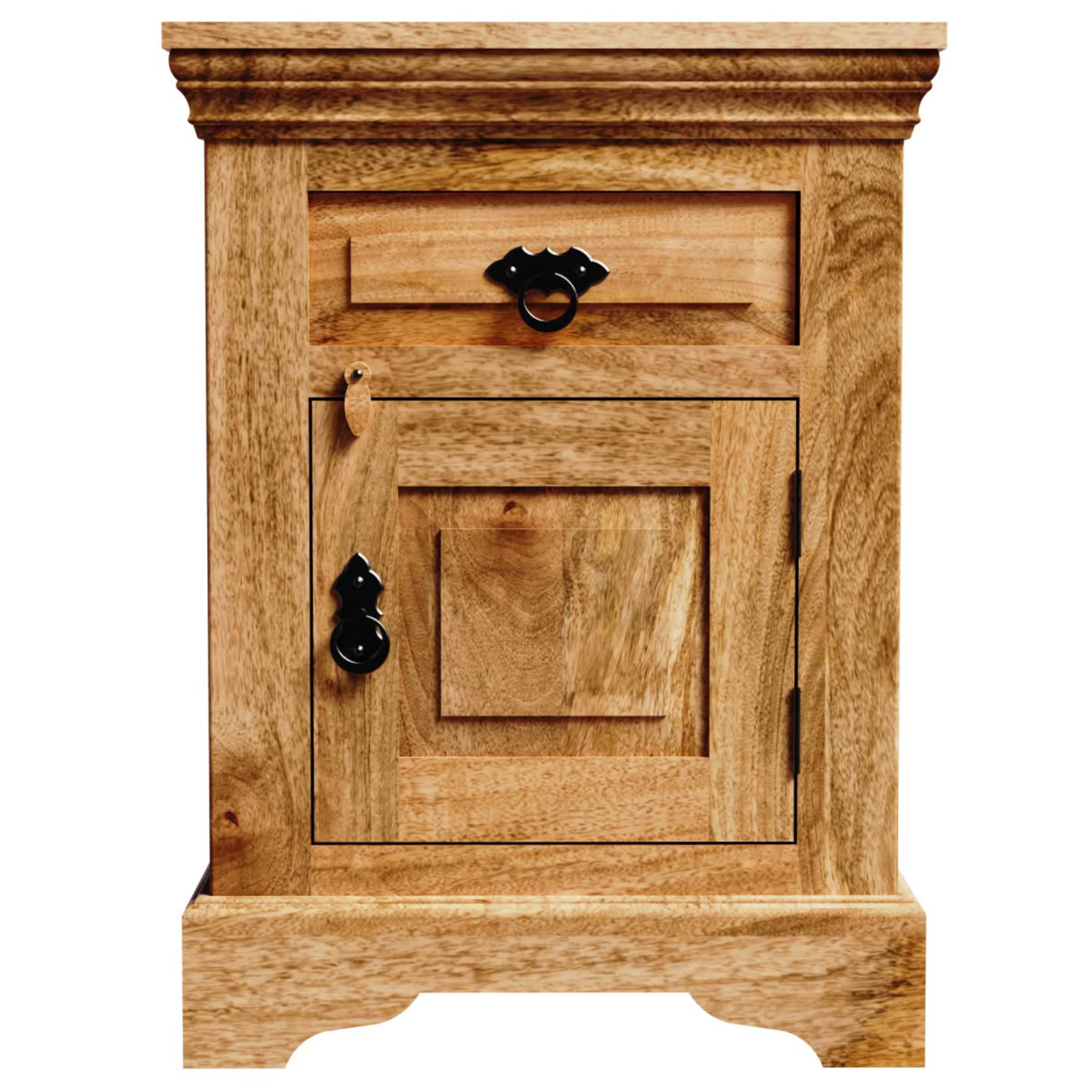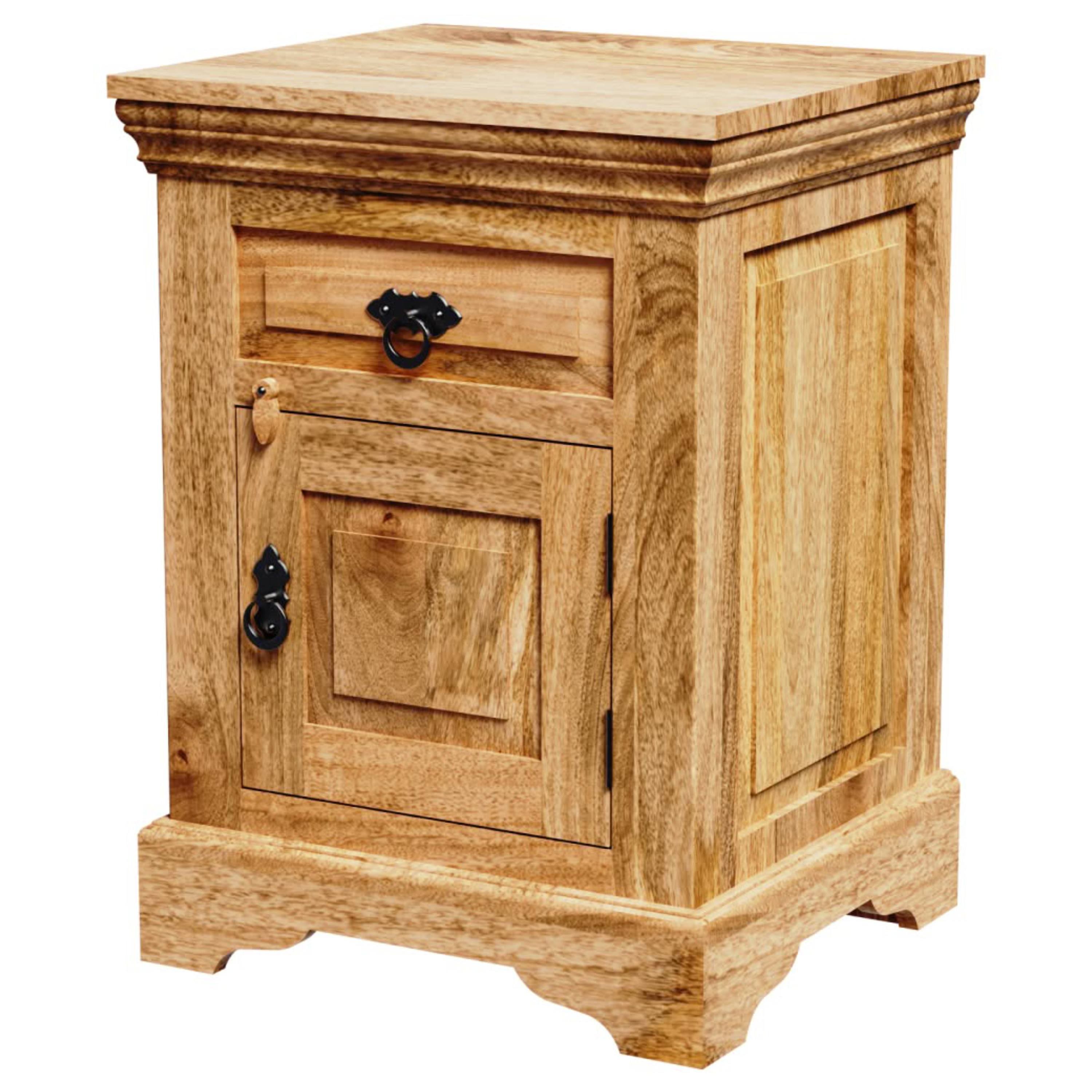 Úložný priestor je rozdelený na priestor za otočnými dverami a praktickú zásuvku na ktorých otváranie slúžia kovové rúčky, ktoré bez problémov nahmatáte aj po tme. Na odloženie predmetov, ktoré chcete mať počas neskorého večera alebo skorého rána po ruke môžete využiť aj vrchnú odkladaciu dosku. Konštrukcia stolíka je vyrobená z masívneho mangového dreva v prírodnom spracovaní bez povrchovej úpravy. Vďaka použitému materiálu je stolík nielen pevný, ale aj odolný proti vode, udržateľný a má dlhú životnosť. Prirodzená kresba dreva, sfarbenie a priznané nedokonalosti dodávajú na jedinečnosti každého kusa.