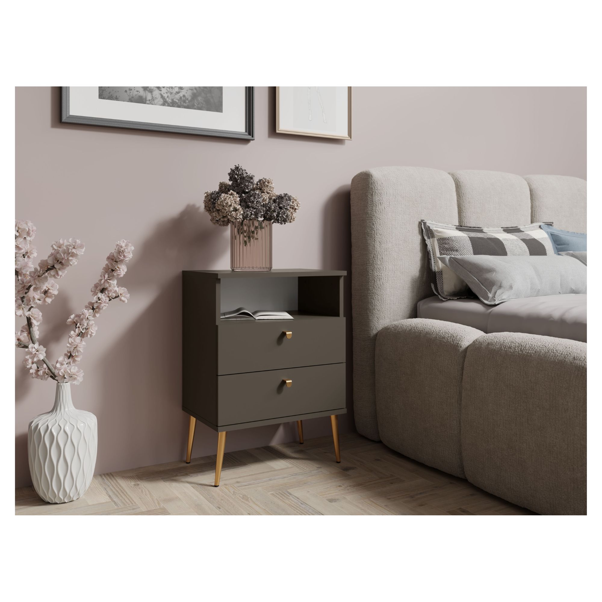 Stolík obsahuje otvorený odkladací priestor a 2 praktické zásuvky doplnené o drobné kovové rúčky, ktoré bez problémov nahmatáte aj po tme. Zásuvky sú ideálnym priestorom na uloženie všetkých nevyhnutných vecí, ktoré chcete mať počas večera a skorého rána poruke, ale nie priamo na očiach. Elegantný vzhľad stolíka zdôrazňujú kónické, kovové nohy vyhotovené v rovnakom zlatom odtieni ako rúčky. Konštrukcia je vyrobená z laminovaného dreveného materiálu s povrchom nenáročným na údržbu.