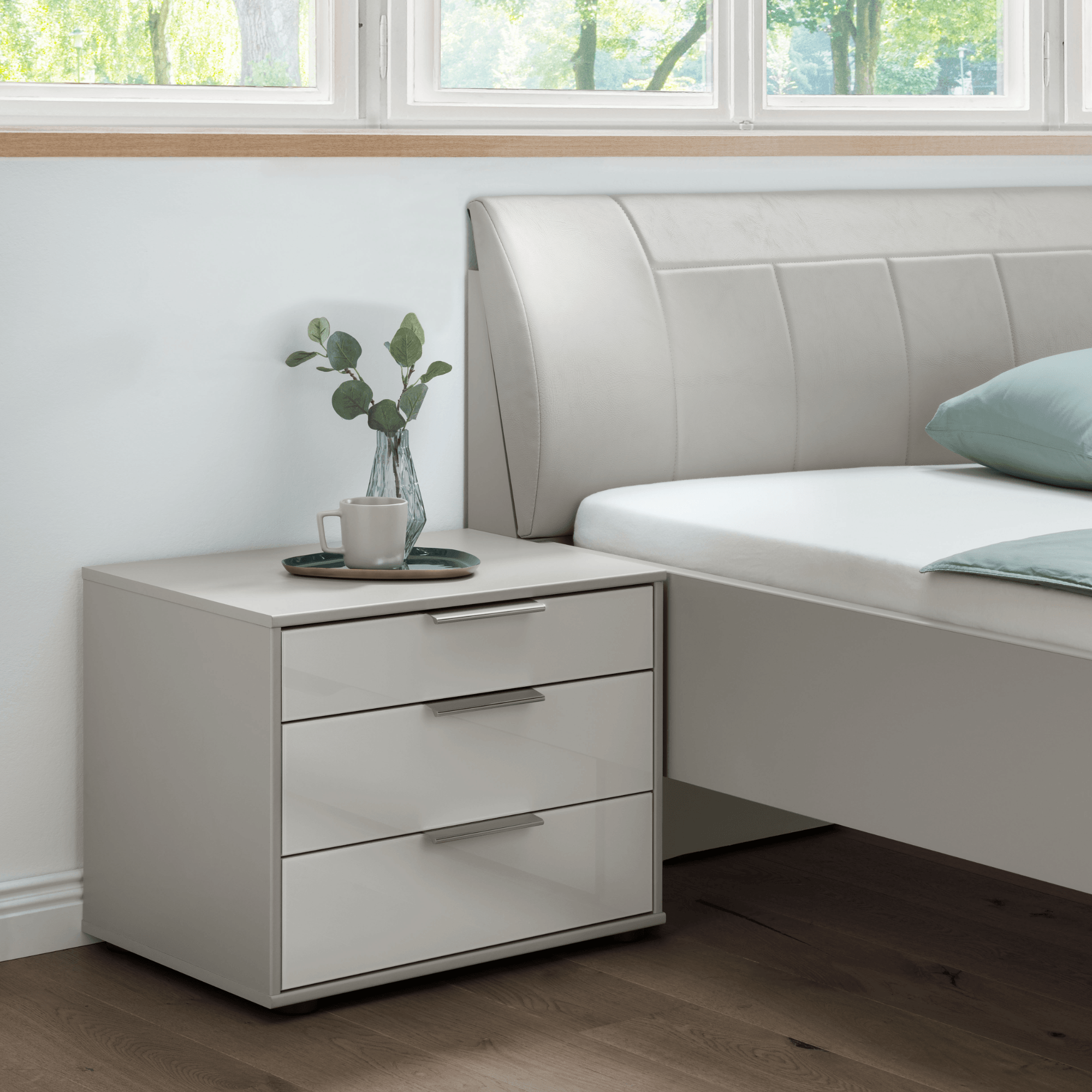 Stolík obsahuje 3 priestranné zásuvky poskytujúce dostatok miesta na uloženie všetkého, čo chcete mať aj počas neskorého večera či skorého rána po ruke. Povrch predných častí je potiahnutý sklenenou vrstvou, ktorá vytvára elegantný vzhľad vo vysokom lesku. Zásuvky sú doplnené o praktické chrómové rúčky zaisťujúce ľahšiu manipuláciu, ktoré ľahko nahmatáte aj po tme. Vďaka vrchnej odkladacej doske už nebudete musieť večer vstávať z postele kvôli odloženiu mobilného telefónu, rozčítanej knihy, okuliarom a ďalších drobností. Celkový dojem dopĺňa štvorica drobných nôh. Stolík je vyrobený z laminovaného dreveného materiálu.