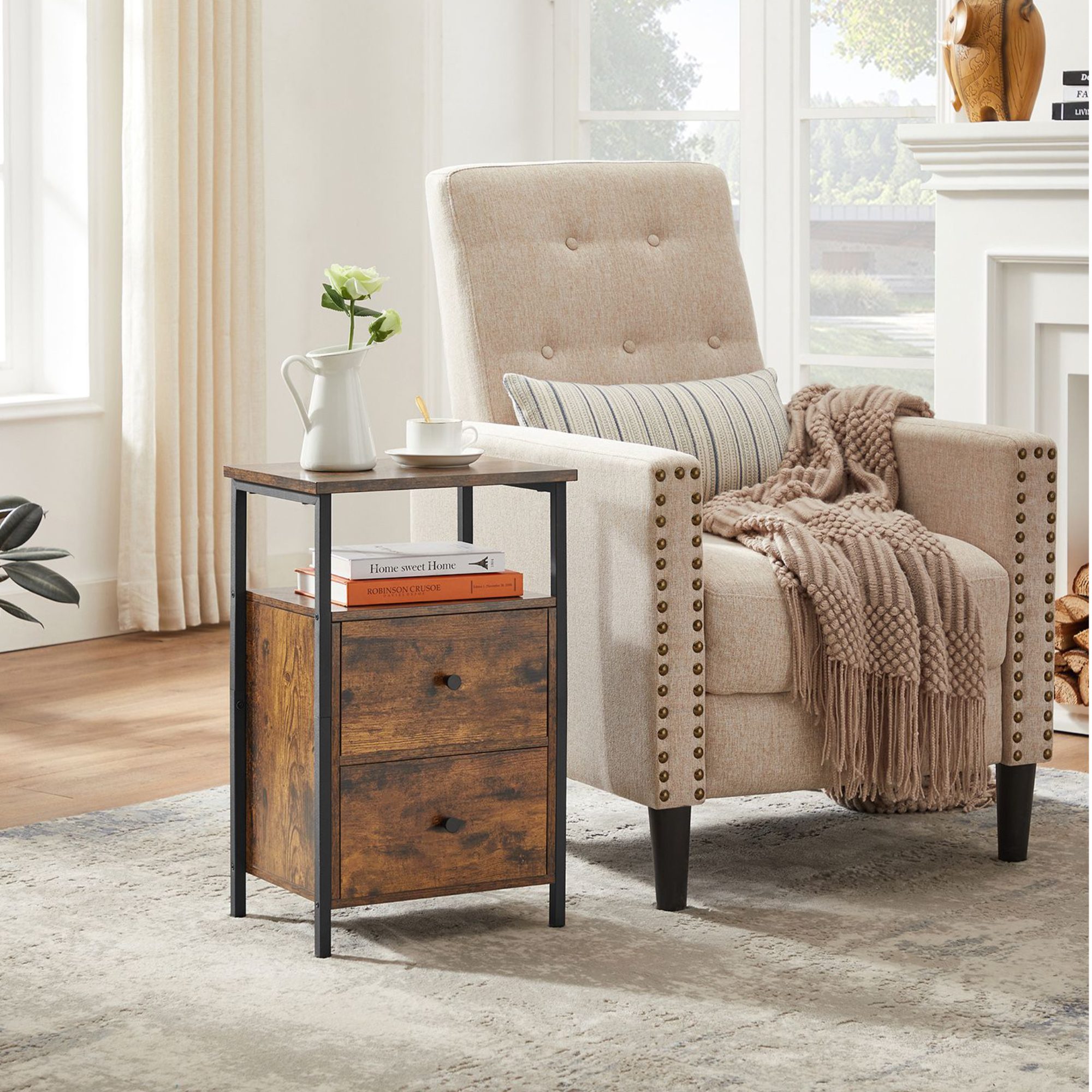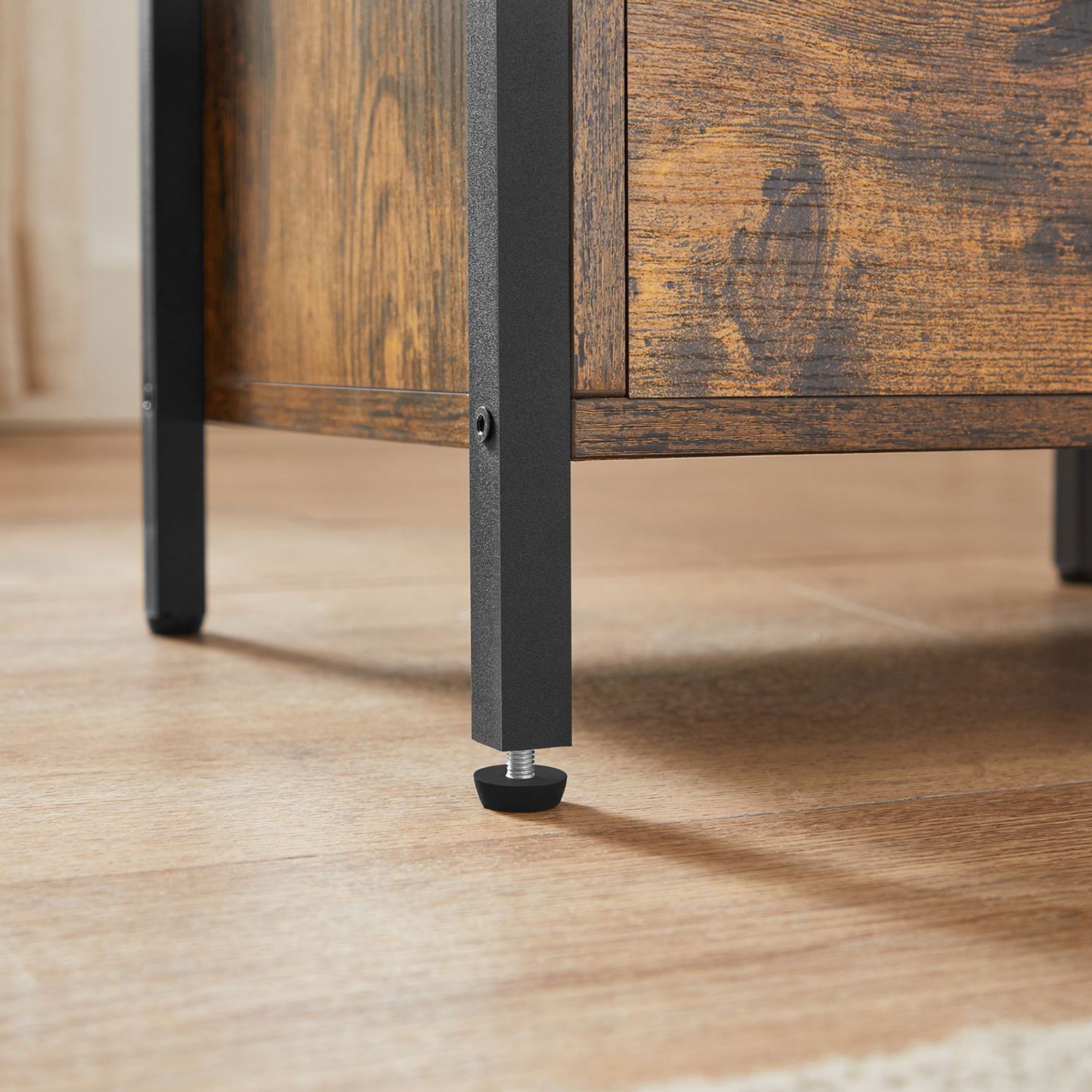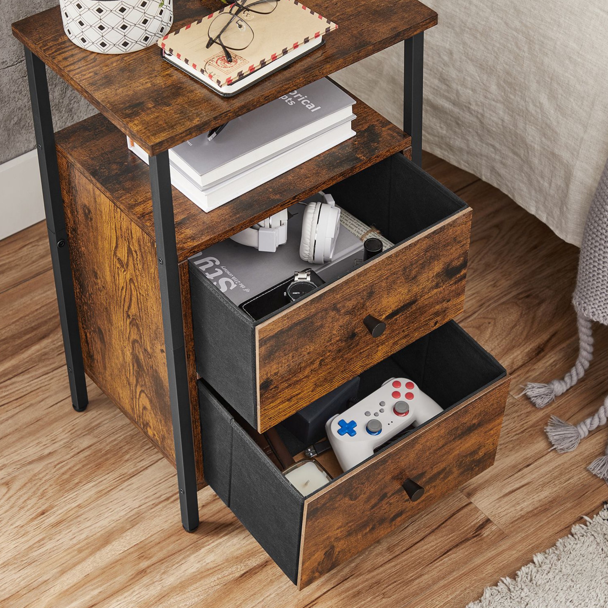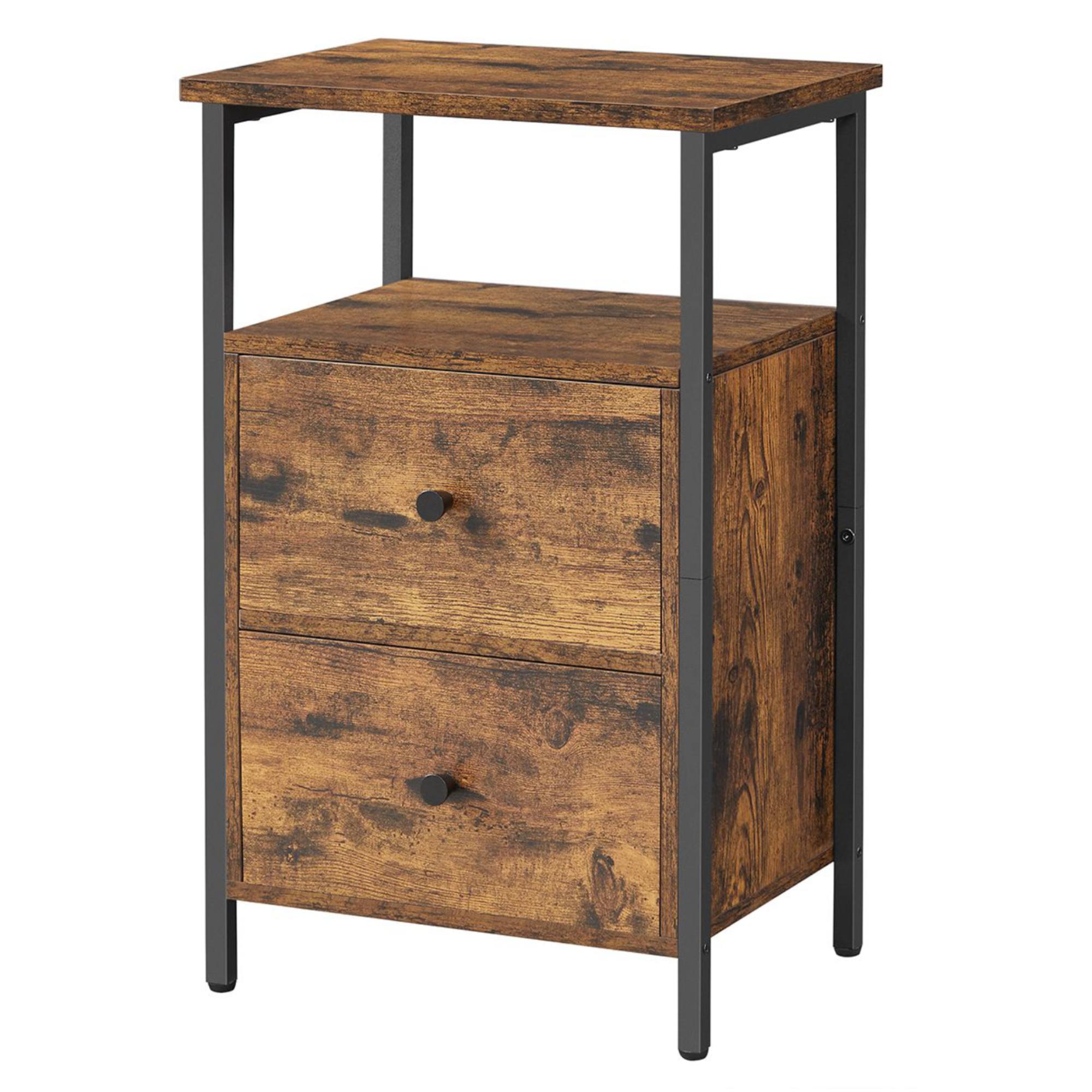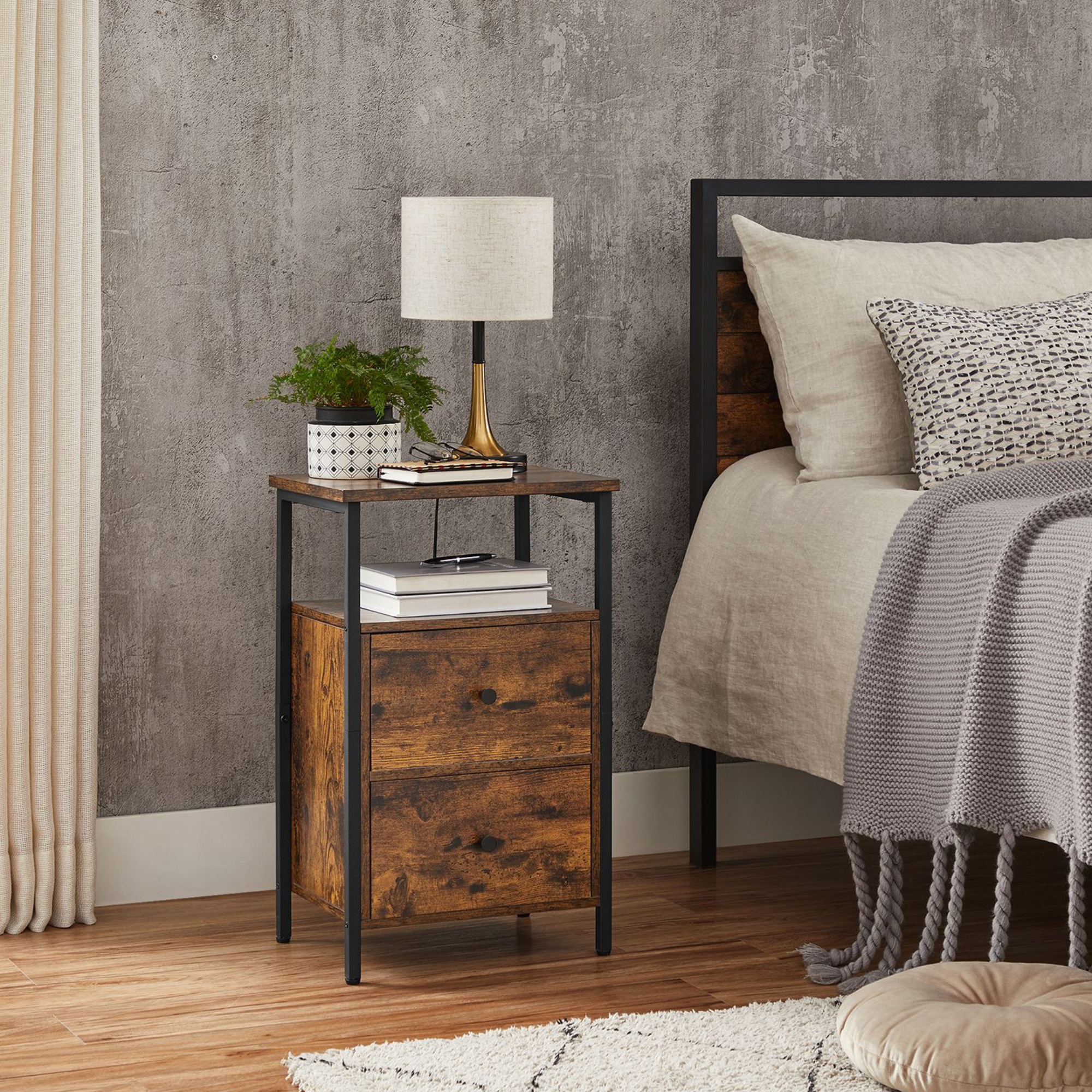 Praktický nočný stolík NIGHT 3 v tmavých tónoch v industriálnom štýle dodá vašej izbe elegantný industriálny vzhľad. Stolík obsahuje 2 zásuvky poskytujúce dostatok priestoru na uloženie všetkých nevyhnutností. Tiché koľajničky umožňujú otvárať zásuvky bez toho, aby ste v noci rušili svojho partnera. Nad nimi sa nachádza ešte jedna otvorená odkladacia doska, ktorá vytvára otvorený odkladací priestor nielen na povrchu, ale aj pod ňou. Veľmi kvalitná drevotrieska a robustný oceľový rám ponúkajú vysokú stabilitu.