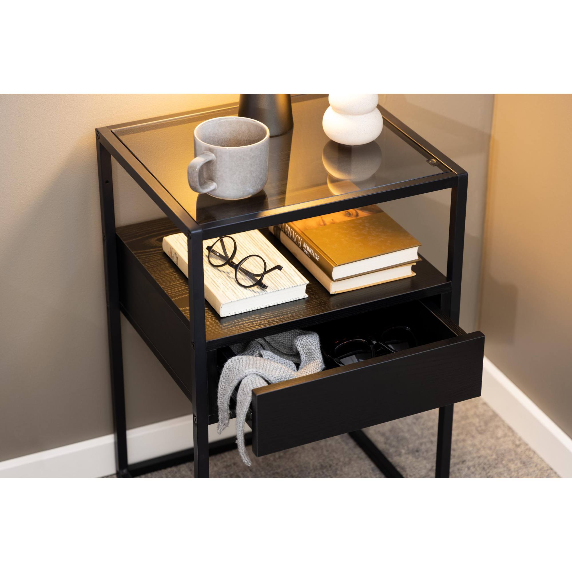 Stolík ponúka priestrannú zásuvku na uloženie najrôznejších predmetov. Vrchná doska poslúži na umiestnenie lampičky a dekorácií. Povrch stolíka sa vyznačuje jednoduchou údržbou.
