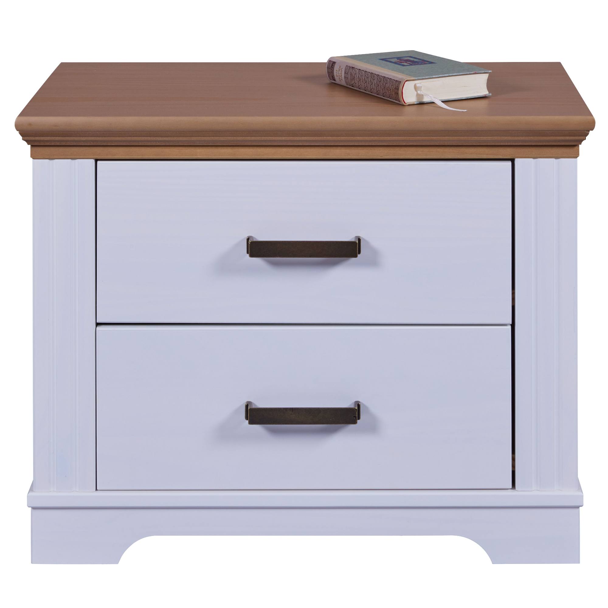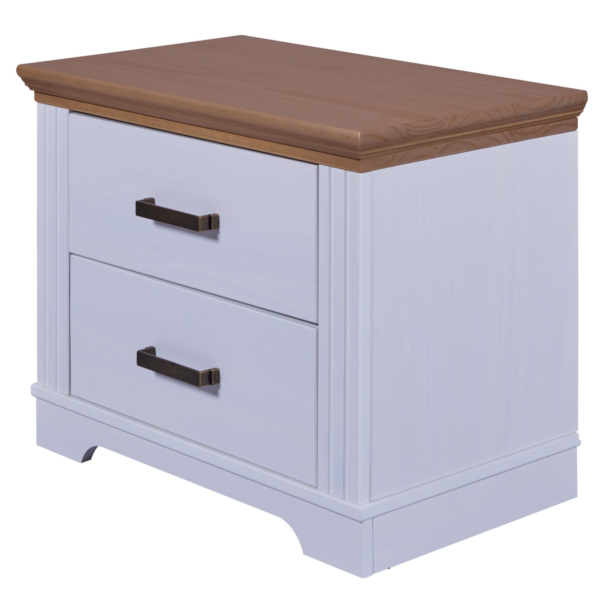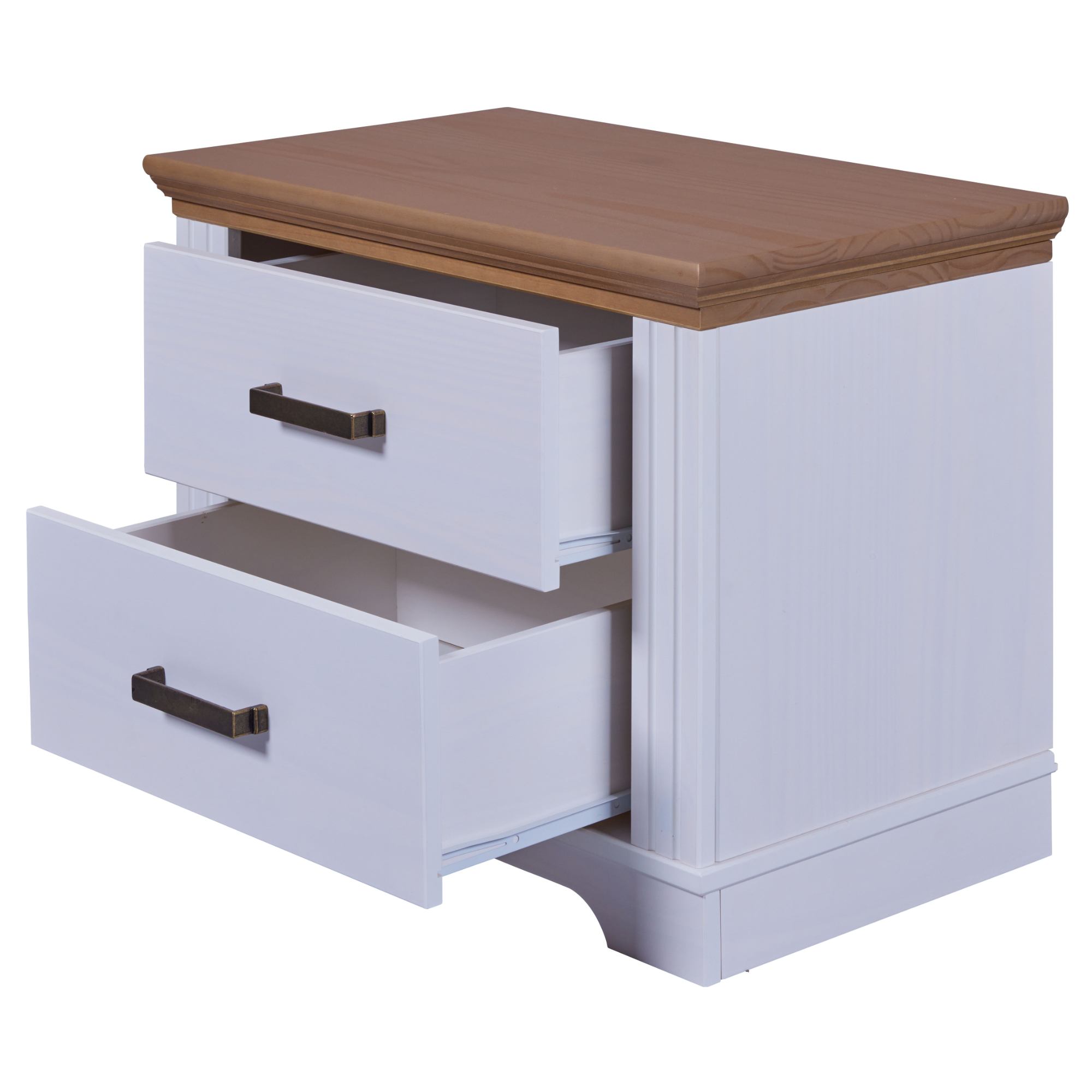 Úložný priestor je rozdelený na 2 samostatné zásuvky na otváranie ktorých slúžia kovové rúčky, ktoré bez problémov nahmatáte aj po tme. Na odloženie predmetov, ktoré chcete mať počas neskorého večera či skorého rána po ruke môžete využiť aj vrchnú odkladaciu dosku. Konštrukcia stolíka je vyrobená z masívneho borovicového dreva, ktoré konštrukcii dodáva potrebnú pevnosť, odolnosť a dlhú životnosť.