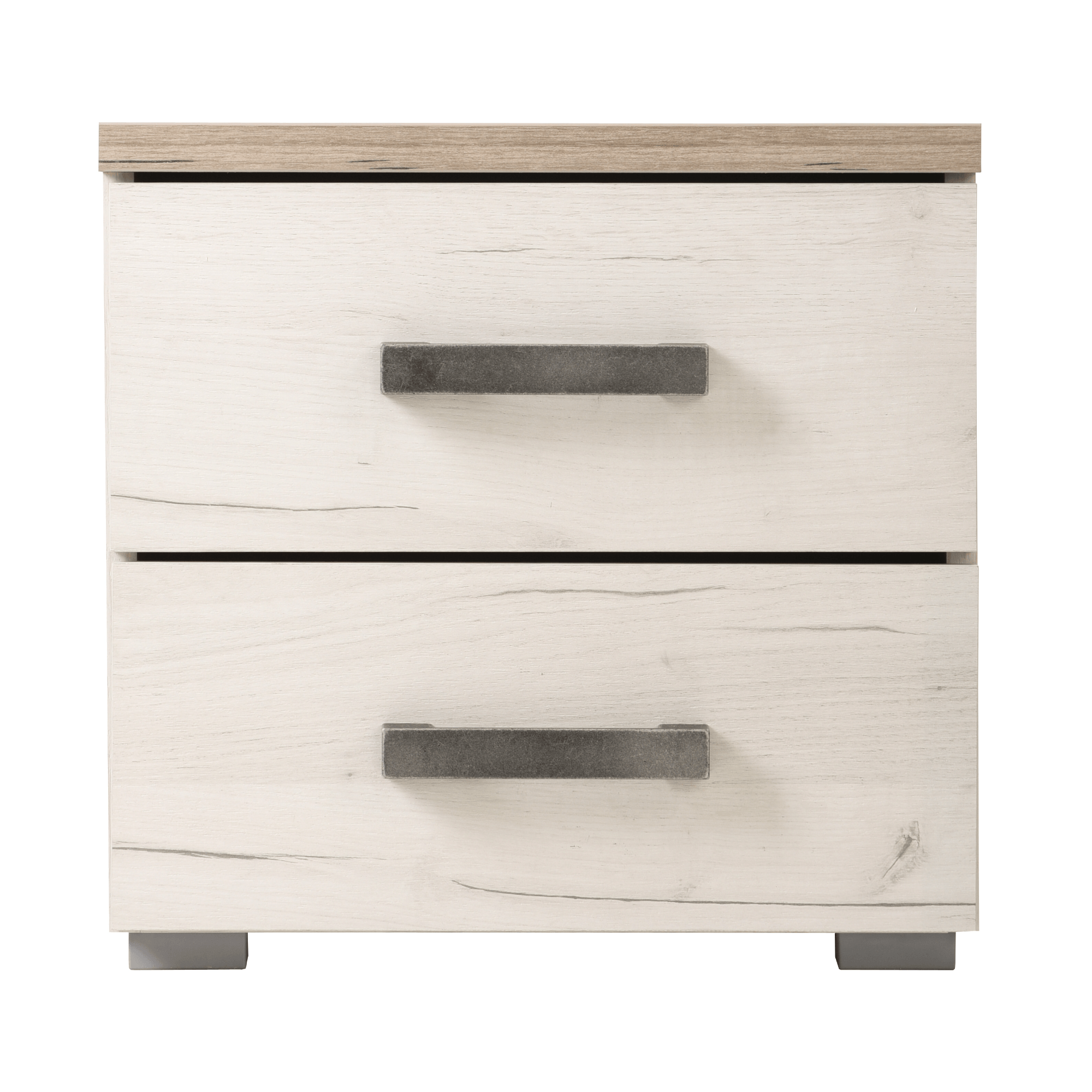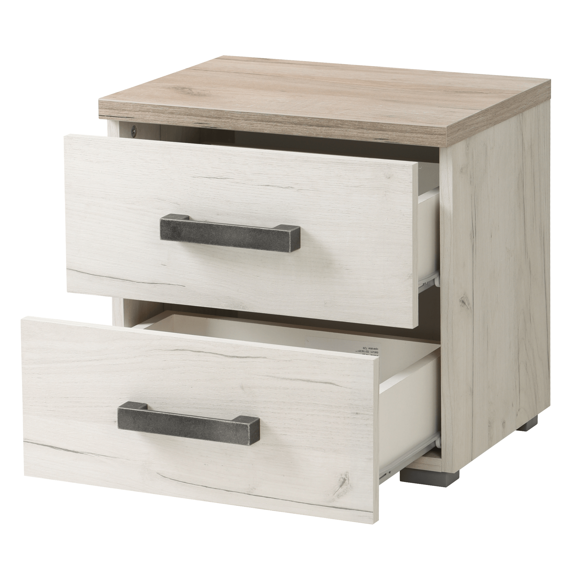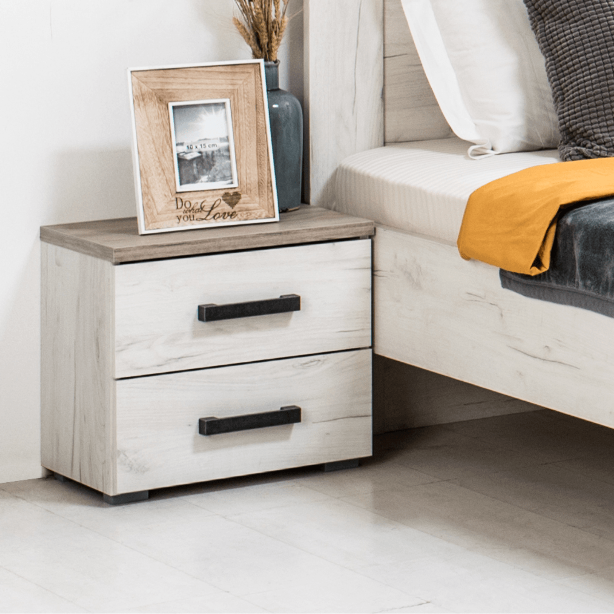 Súčasťou stolíka sú 2 zásuvky poskytujúce dostatok priestoru na uloženie všetkých nevyhnutností. Zásuvky dopĺňajú čierne plastové rúčky, ktoré zaisťujú ľahšiu manipuláciu. Vďaka vrchnej odkladacej doske už nebudete musieť večer vstávať z postele kvôli odloženiu mobilného telefónu, knihy, okuliarov a ďalších drobností. Celkový vzhľad dopĺňajú kontrastné drobné nôžky. Stolík je vyrobený z laminovanej drevotriesky, vďaka ktorej nie je stolík náročný na údržbu.