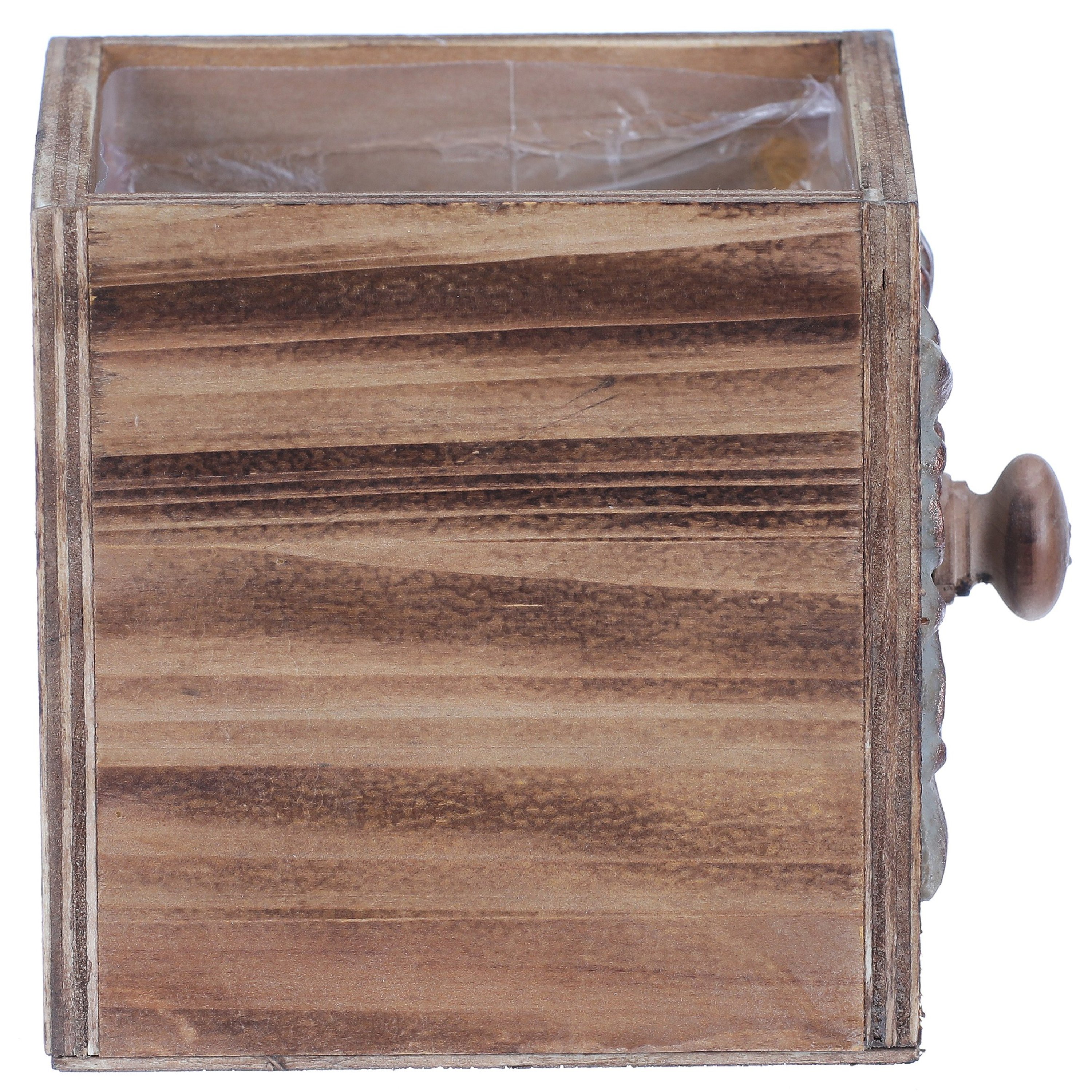 Obal na kvetináč ŠUPLÍK je nielen štýlovým, ale aj praktickým dekoračným doplnkom, ktorý vašim rastlinám dodá jedinečný a originálny vzhľad. Tento obal v tvare šuplíka je vyrobený z dreva a doplnený kruhovou kovovou rúčkou. Ďalej je vybavený praktickou igelitovou vložkou, ktorá účinne zabraňuje presakovaniu vody, chráni povrchy a zároveň udržiava ideálnu vlhkosť pre zdravý rast vašich rastlín.