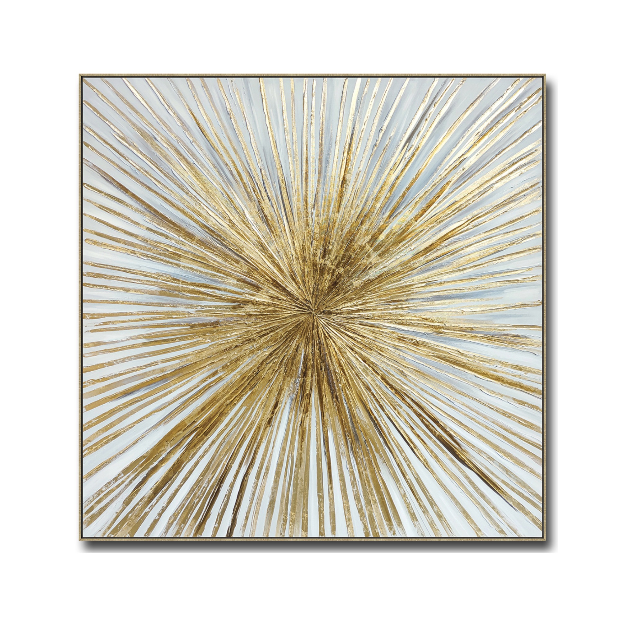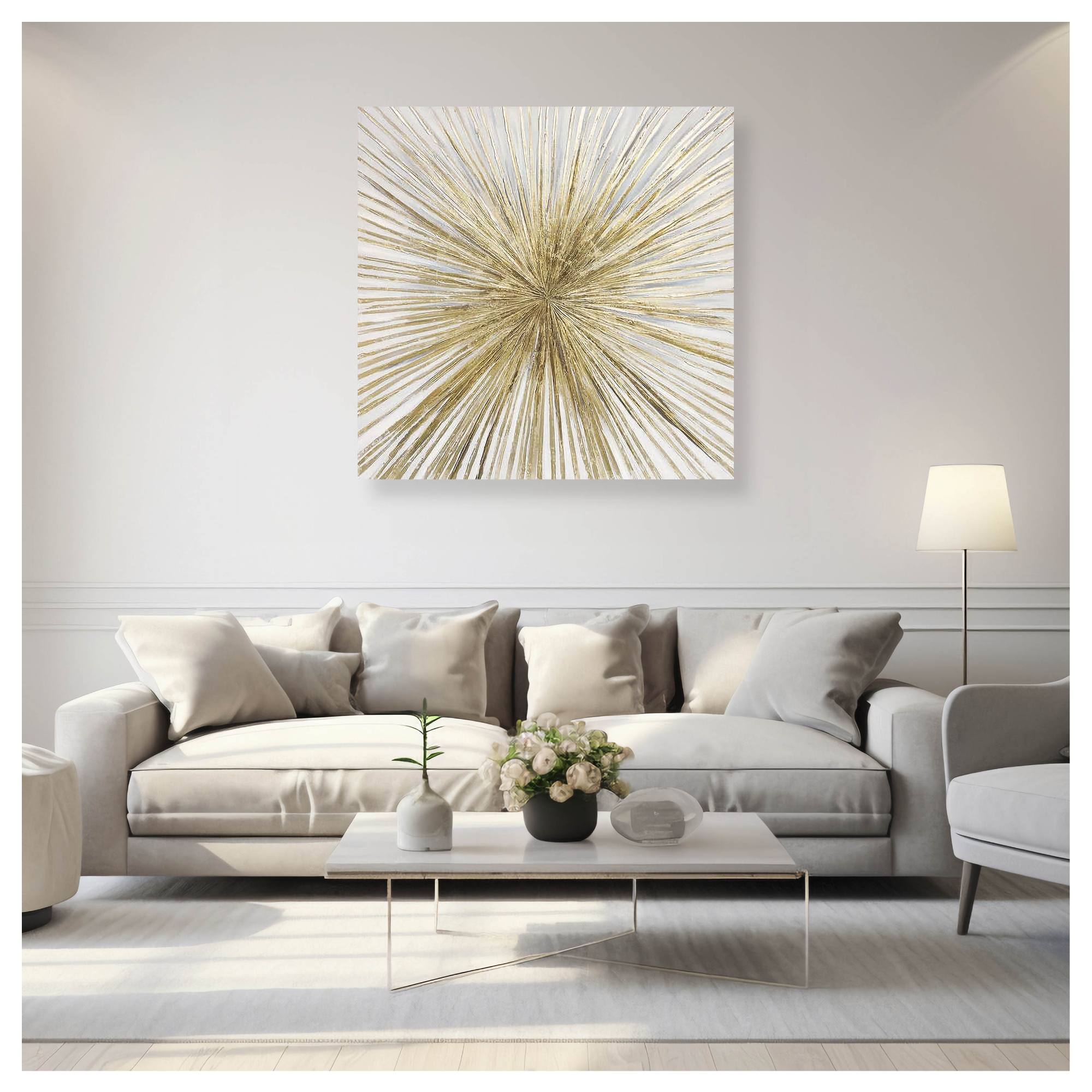 Tento ručne maľovaný obraz na pevnom ráme zaujme nielen svojou originalitou, ale aj precíznym spracovaním. Abstraktný motív kombinuje teplé zlaté tóny s neutrálnymi odtieňmi bielej farby, čím pôsobí elegantne a nadčasovo. Maľba je aplikovaná na maliarske plátno, ktoré je starostlivo napnuté na masívnom drevenom ráme. Tento základ nielenže zaručuje dlhú životnosť obrazu, ale taktiež zaisťuje jeho stabilitu a odolnosť mnoho rokov. Celkový dizajn obrazu dopĺňa zlatý rám.