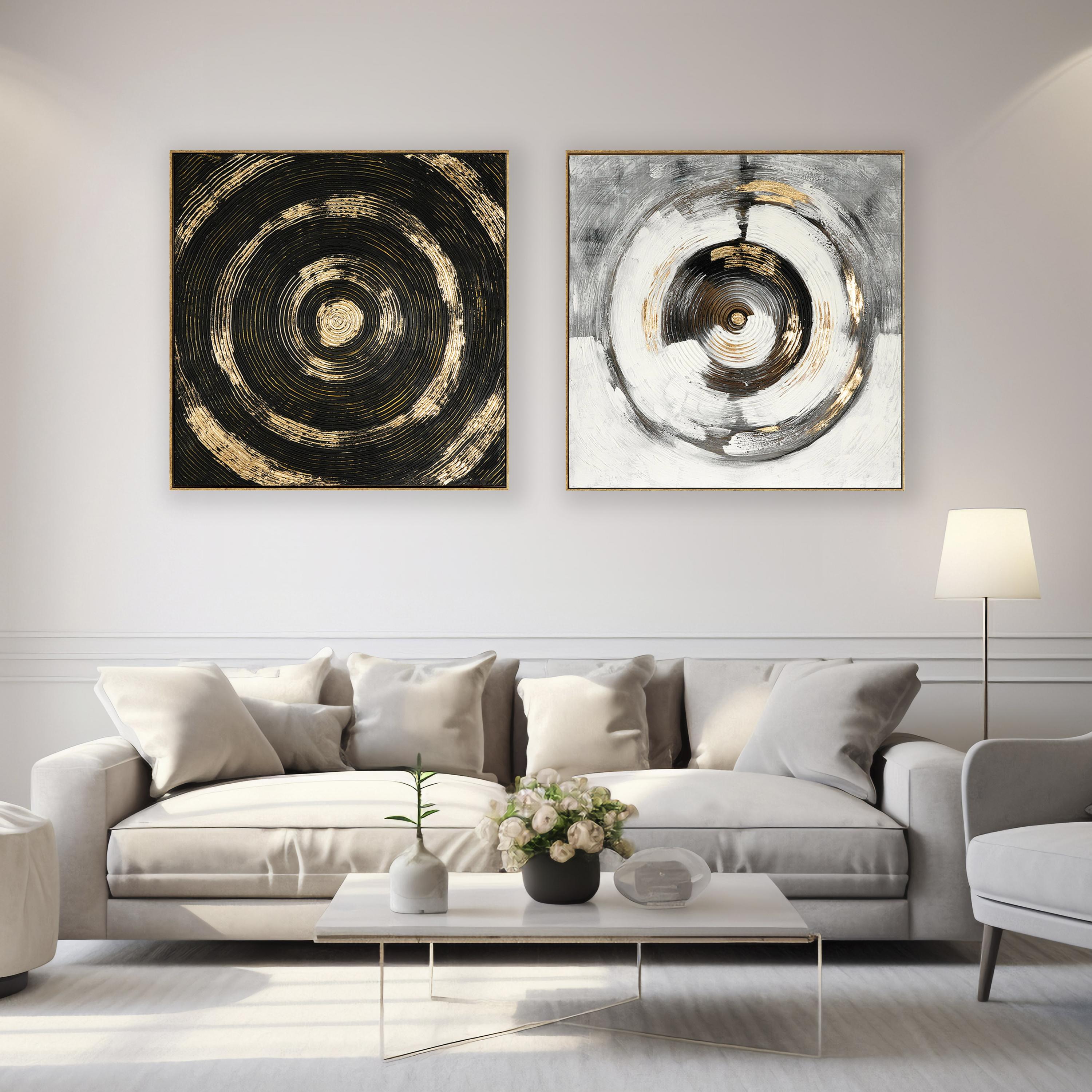 Obrazu dominujú špirály v kontrastnej kombinácii čiernej a zlatej, ktorá celej kompozícii dodáva luxusný a zároveň dramatický nádych. Štruktúrovaný povrch dodáva obrazu autentický umelecký charakter. Je zarámovaný v úzkom zlatom ráme a pripravený na okamžité zavesenie.