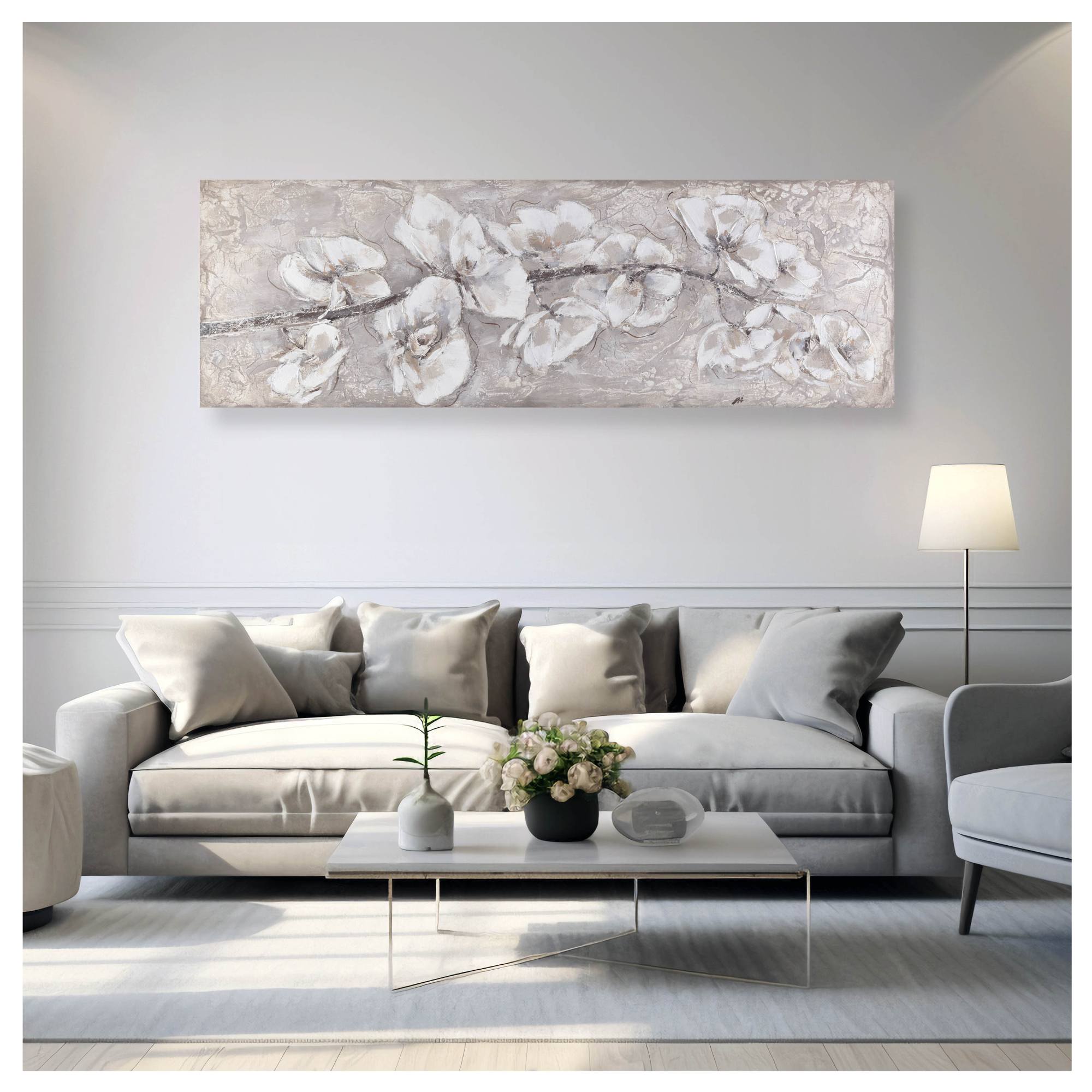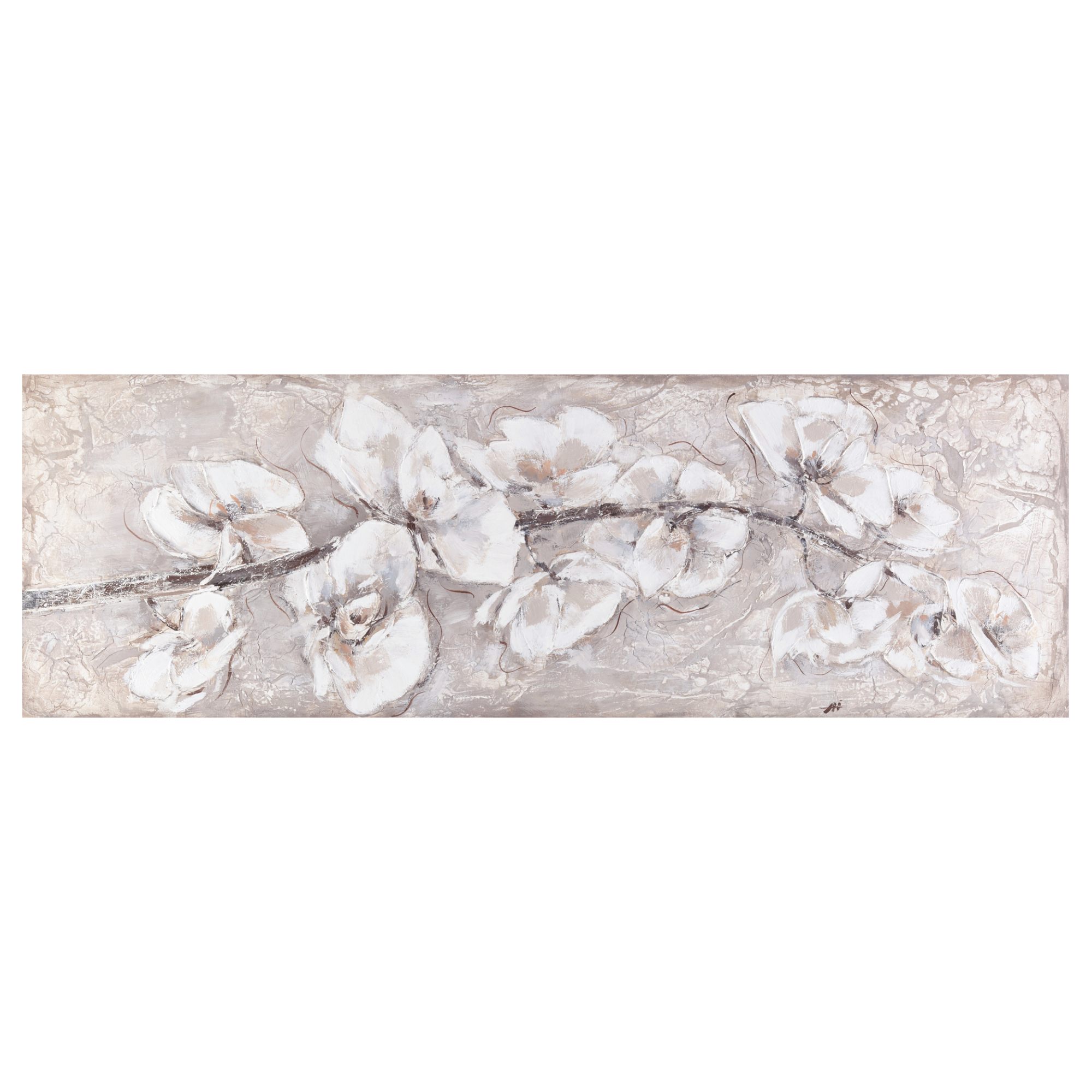 Tento ručne maľovaný obraz na pevnom ráme sa vyznačuje nielen svojou originalitou, ale aj veľmi precíznym spracovaním. Dominantným prvkom sú nádherne stvárnené kvety v jemných odtieňoch bielej, béžovej a hnedej farby. Maľba je aplikovaná na maliarske plátno, ktoré je starostlivo napnuté na masívnom drevenom ráme.