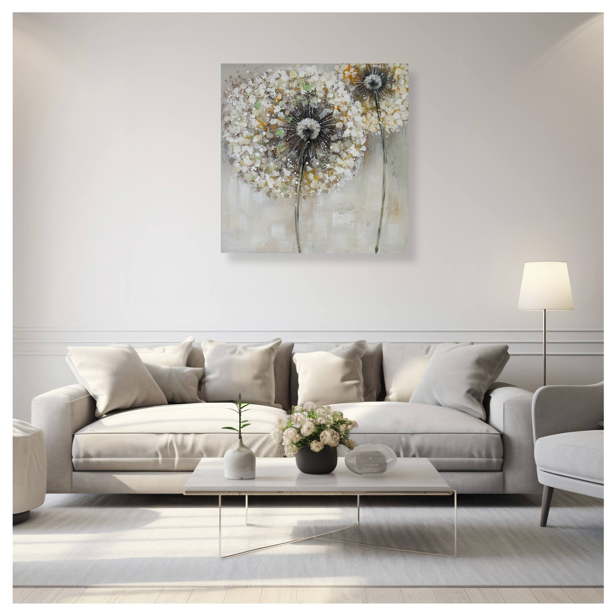Tento ručne maľovaný obraz na pevnom ráme sa vyznačuje nielen svojou originalitou, ale aj veľmi precíznym spracovaním. Hlavným prvkom sú nádherne stvárnené kvety púpavy. Maľba je aplikovaná na maliarske plátno, ktoré je starostlivo napnuté na masívnom drevenom ráme. Tento robustný rám zaisťuje stabilitu obrazu a dlhú životnosť.