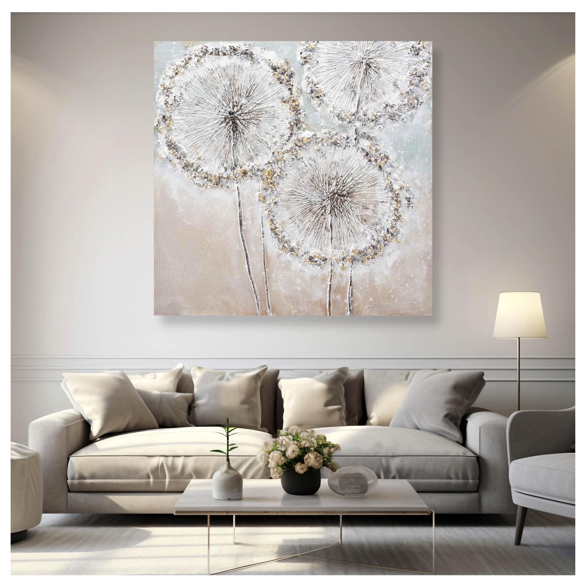 Tento ručne maľovaný obraz na pevnom ráme vyniká jedinečnou originalitou a mimoriadne precíznym spracovaním. Jeho dominantným motívom je jemné páperie púpavy, elegantne doplnené zlatými akcentmi. Maľba je aplikovaná na maliarske plátno, ktoré je starostlivo napnuté na masívnom drevenom ráme. Tento robustný rám zaisťuje stabilitu obrazu a dlhú životnosť.