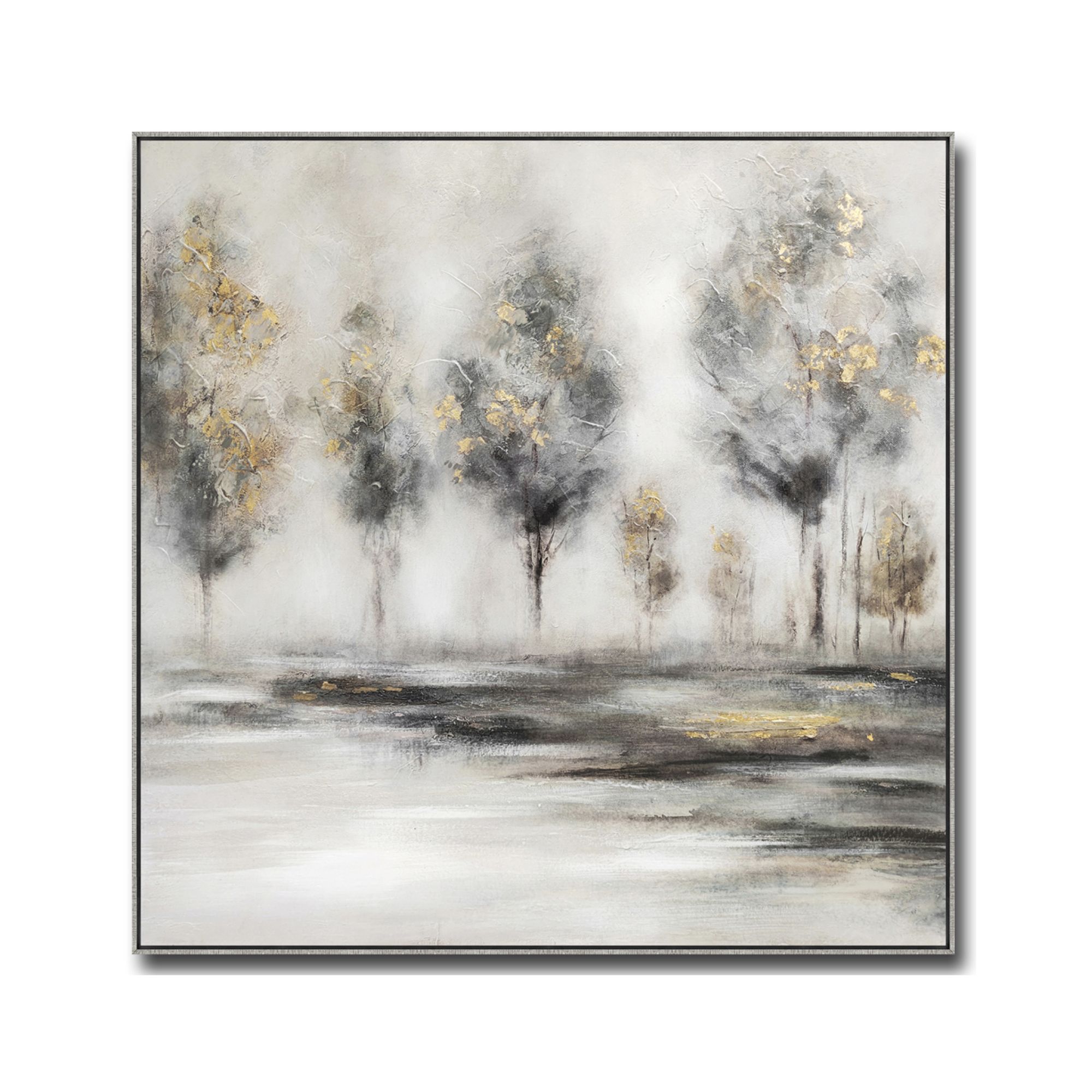 Tento obraz na pevnom ráme upúta nielen svojou originalitou, ale aj precíznym spracovaním. Jedinečné spojenie ručnej maľby a tlače vytvára sofistikovaný vizuálny dojem. Hlavným motívom sú abstraktné stromy, jemne zvýraznené zlatými akcentmi. Maľba je aplikovaná na maliarske plátno, ktoré je starostlivo napnuté na masívnom drevenom ráme. Tento základ nielenže zaručuje dlhú životnosť obrazu, ale taktiež zaisťuje jeho stabilitu a odolnosť mnoho rokov. Celkový dizajn obrazu dopĺňa strieborný rám.