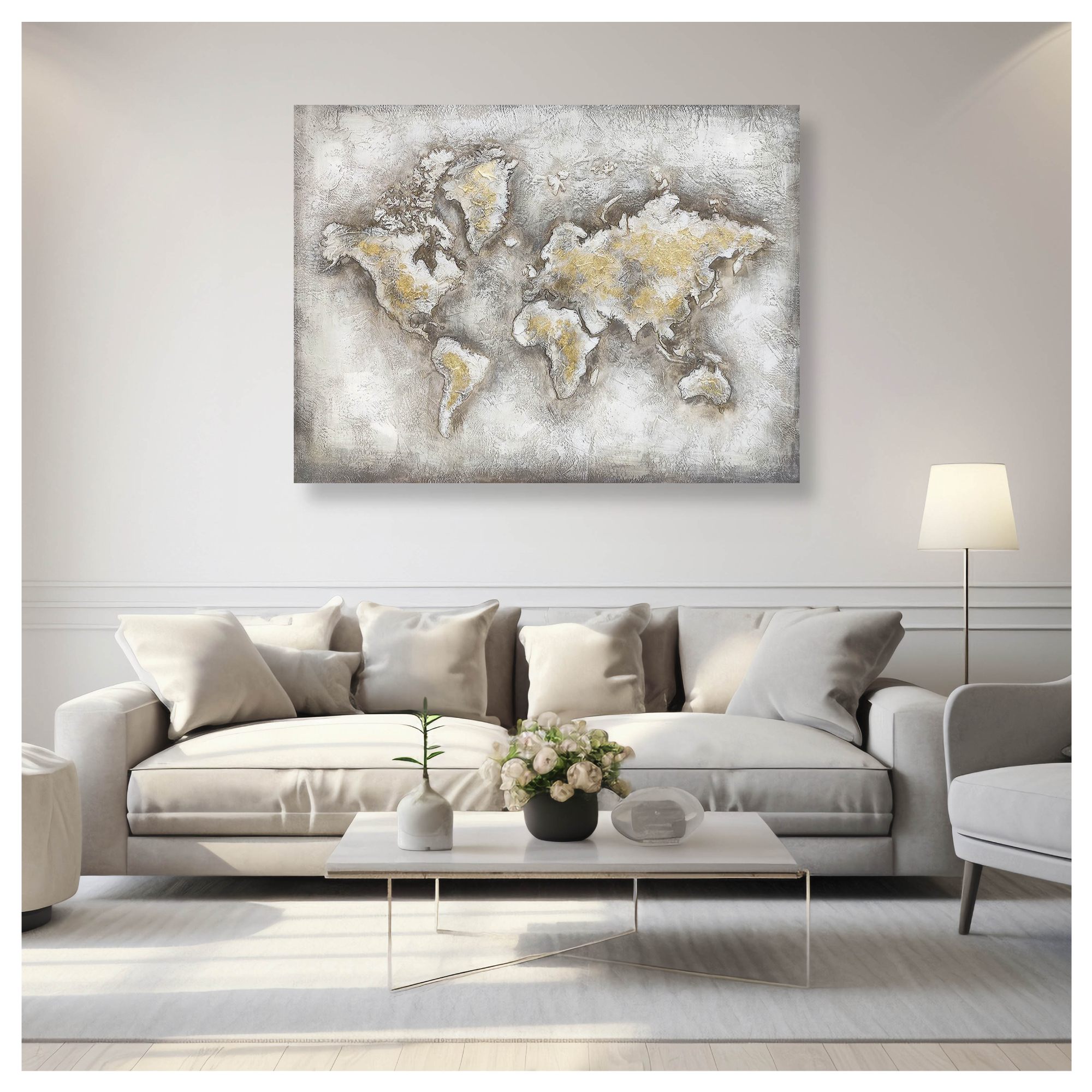 Tento ručne maľovaný obraz na pevnom ráme sa vyznačuje nielen svojou originalitou, ale aj veľmi precíznym spracovaním. Dominantným prvkom je stvárnená mapa sveta, ktorá je doplnená kontrastnými zlatými akcentmi. Maľba je aplikovaná na maliarske plátno, ktoré je starostlivo napnuté na masívnom drevenom ráme. Tento robustný rám zaisťuje stabilitu obrazu a dlhú životnosť.