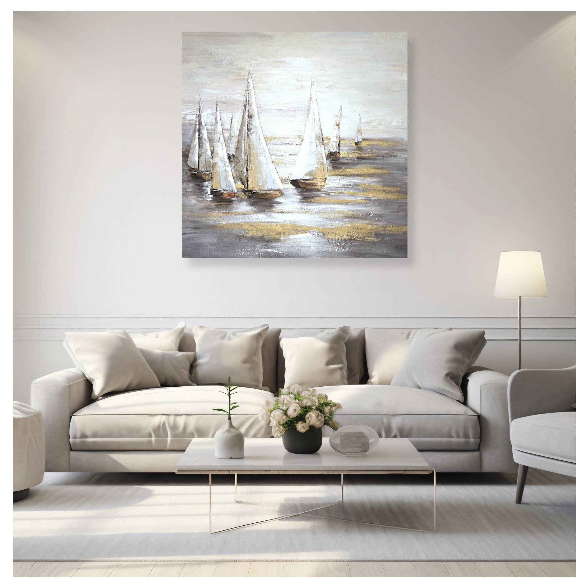 Tento ručne maľovaný obraz na pevnom ráme zaujme nielen svojou originalitou, ale tiež precíznym spracovaním. Dominantou obrazu sú plávajúce plachetnice na mori v jemných tónoch bielej, sivej a béžovej, ktoré sú doplnené o zlaté akcenty. Maľba je aplikovaná na maliarske plátno, ktoré je starostlivo napnuté na masívnom drevenom ráme. Tento základ nielenže zaručuje dlhú životnosť obrazu, ale tiež zaisťuje jeho stabilitu a odolnosť mnoho rokov.