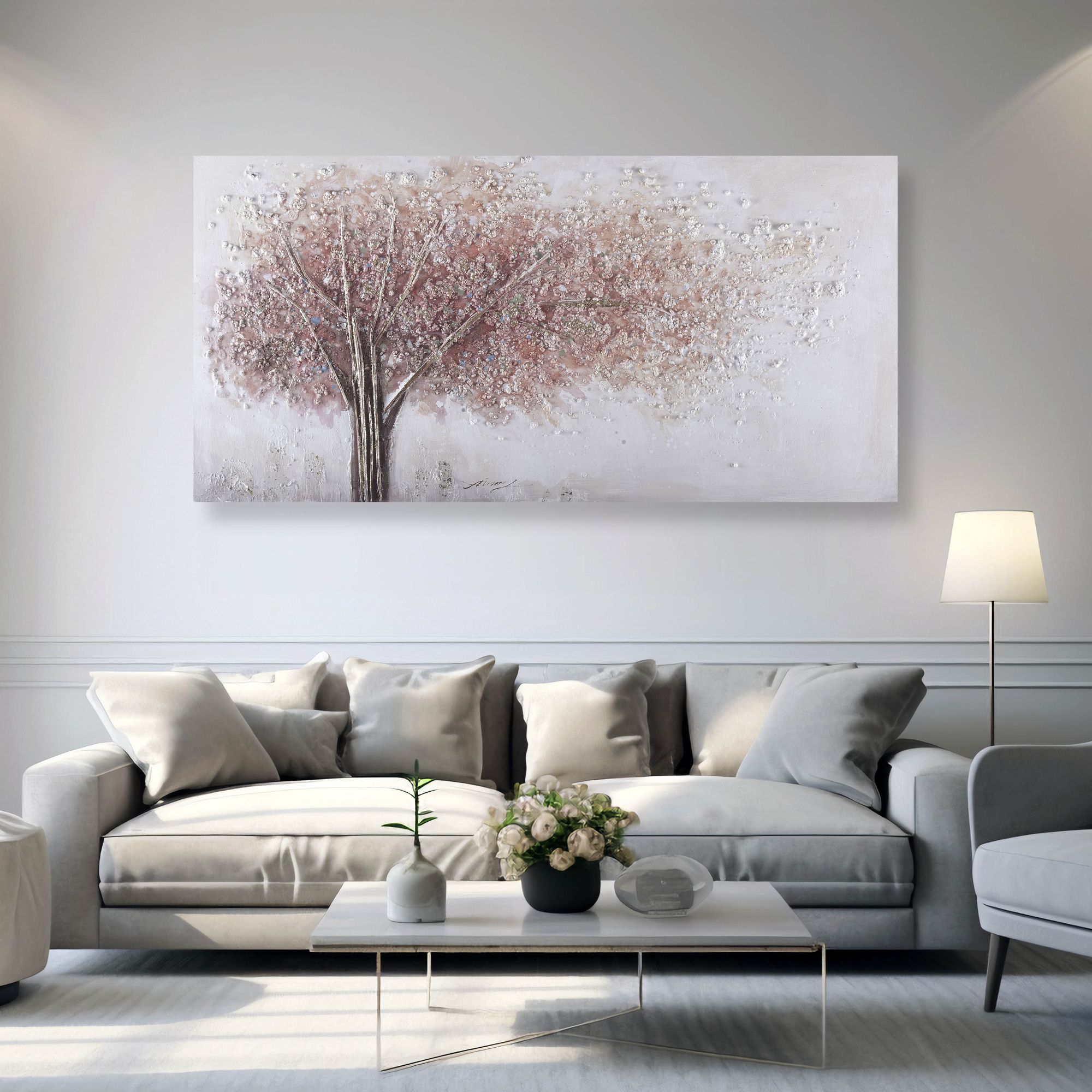 Obraz je ručne maľovaný. Farebné tóny ružovej, perleťovo bielej, striebornej a jemnej sivej vytvárajú harmonický dojem a vnesú do interiéru pokoj a jemnú poetiku.