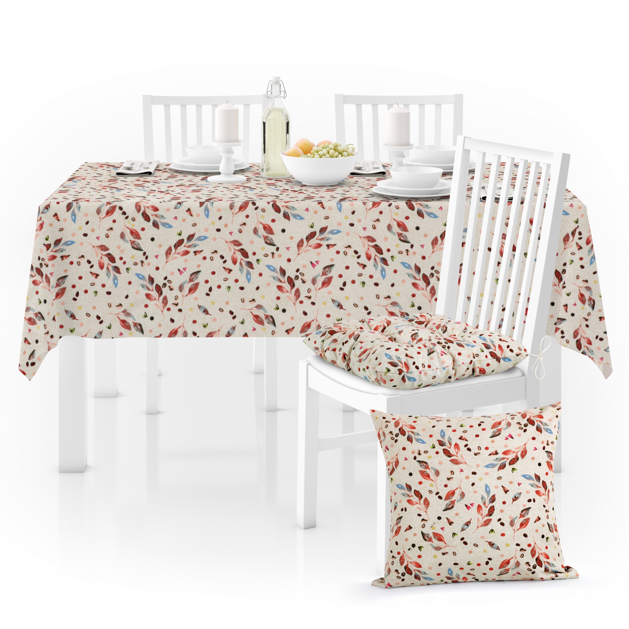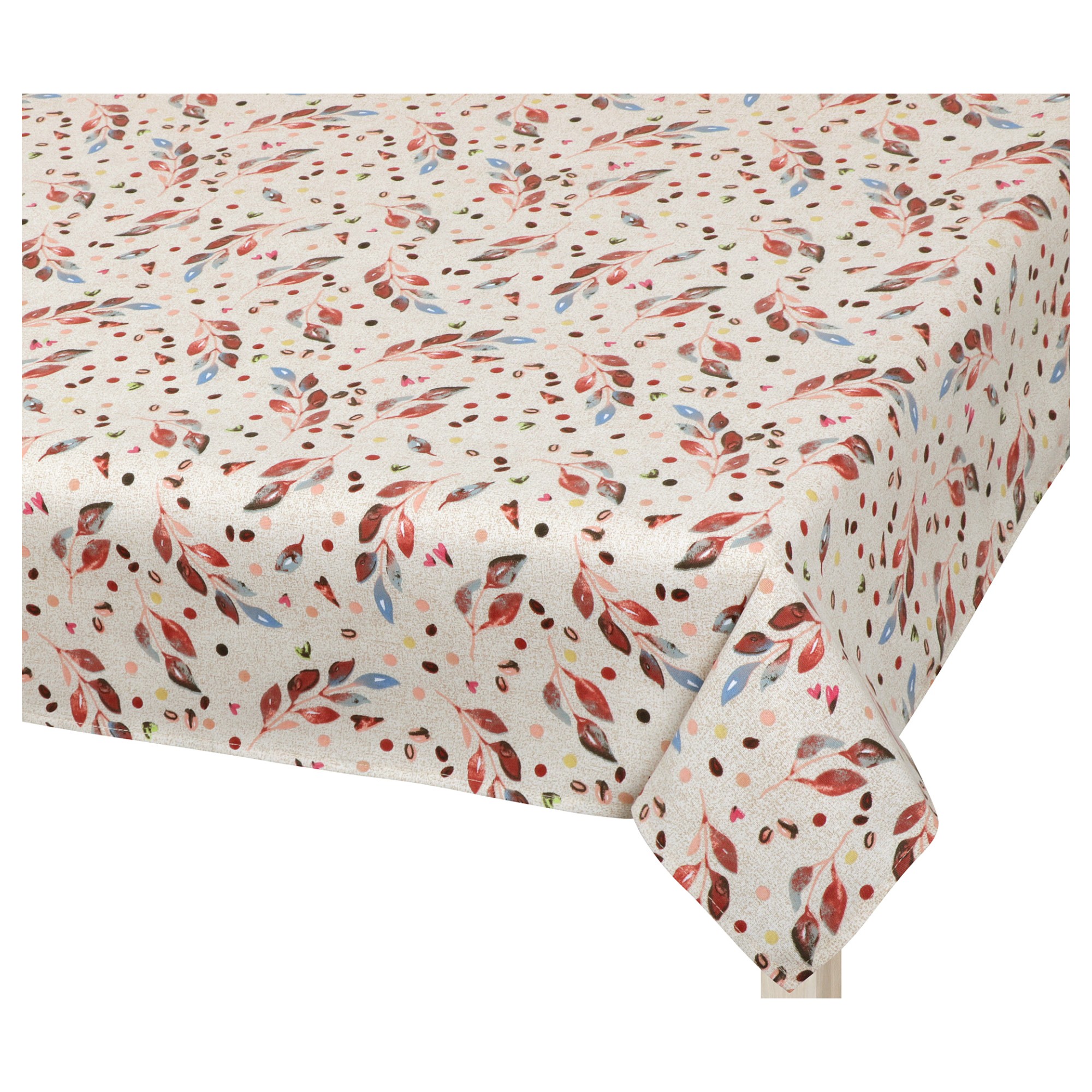 Obrus LÍSTOČKY FAREBNÉ s elegantným rastlinným motívom vkusne doplní stôl ako pri domácich, tak aj vonkajších posedeniach s priateľmi a rodinou. Jedná sa o dekoratívny prvok, ktorý tiež spoľahlivo ochráni dosku stola pred znečistením aj mechanickým poškodením. Vyrobený je z plátna zloženého z 50 % bavlny a 50 % polyesteru. Obrus LÍSTOČKY FAREBNÉ je ideálny na kombinovanie s ďalším textilom v rovnakom dizajne.