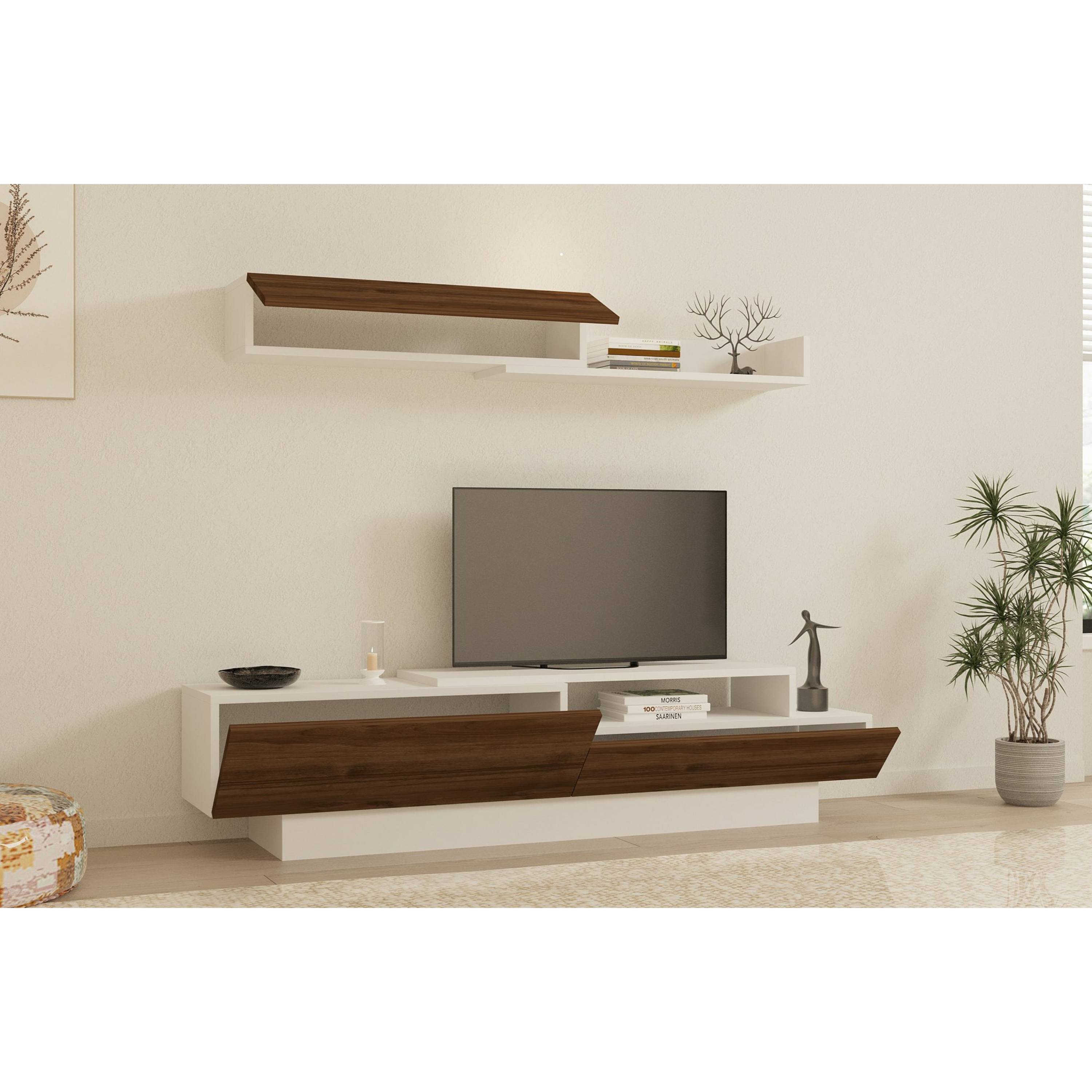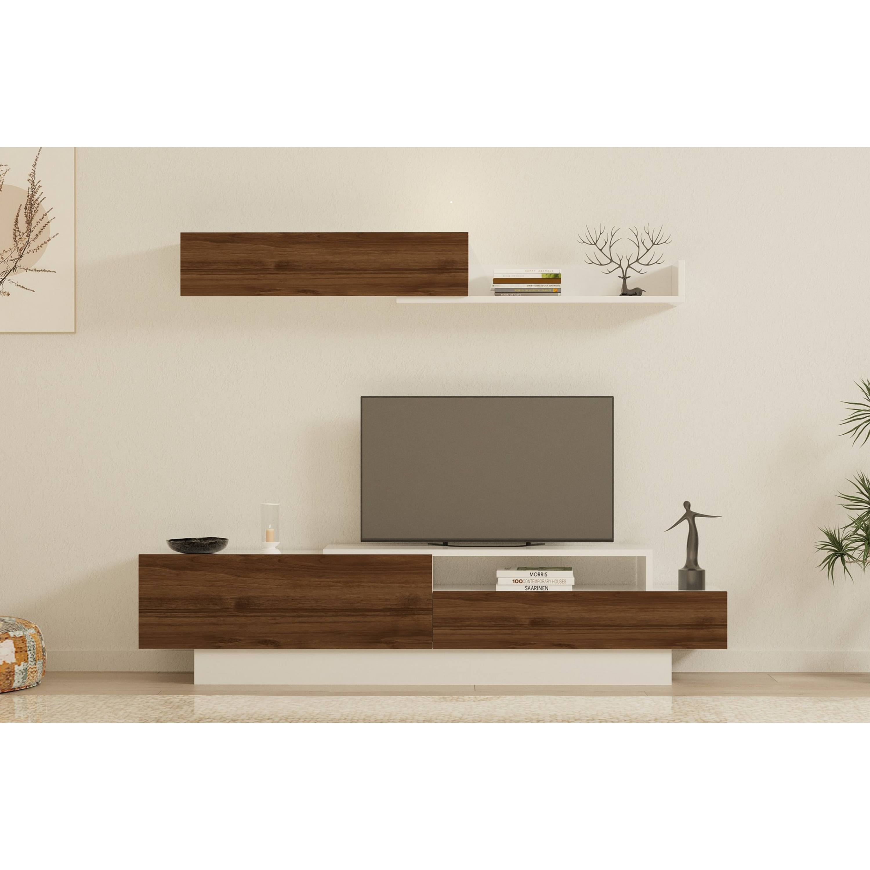 Obývacia stena ELDA predstavuje komplexné riešenie funkčného nábytku do obývačky. Kombinácia dekoru orecha a odtieňa bielej farby vnesie do vašej obývačky prírodný nádych.