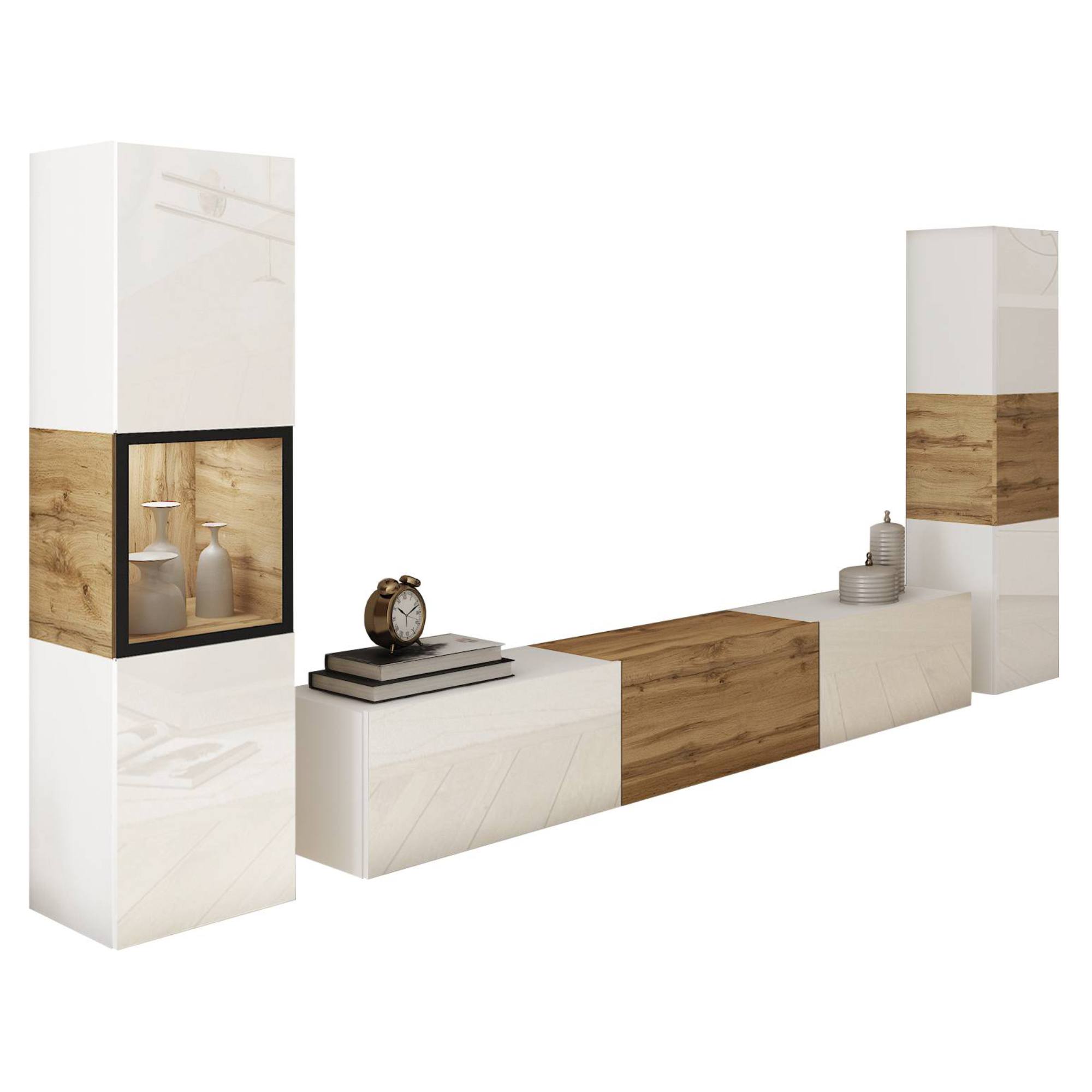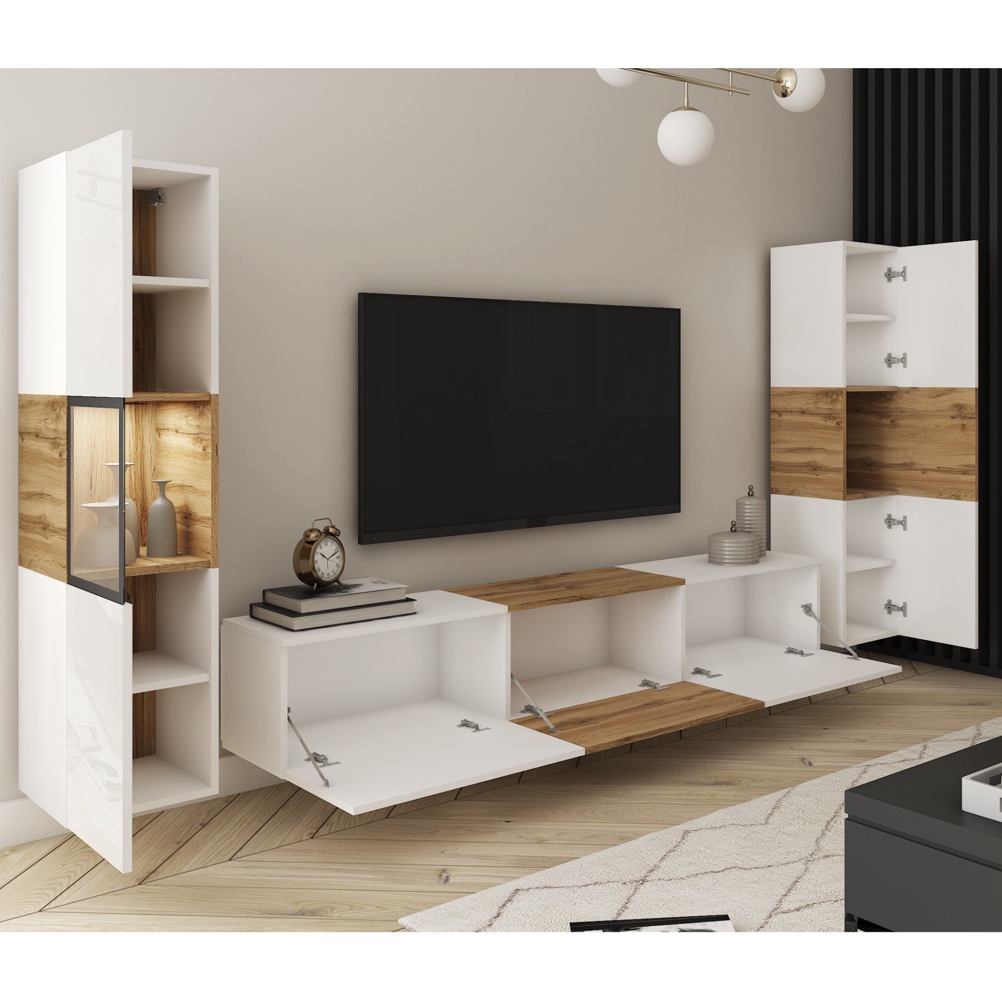 Stenu tvorí vitrína, skrinka a TV komoda. Za čiastočne presklenými otočnými dvierkami vitríny sa nachádzajú 4 vložené police. Nechýba ani štýlové LED osvetlenie, ktoré pomôže vystaveným predmetom vyniknúť. Ďalšími 4 vloženými policami disponuje skrinka. TV komoda ponúka dostatok úložného priestoru, takže si v nej nájde miesto nielen TV príslušenstvo, ale aj ďalšie nevyhnutnosti. Vitrínu, skrinku aj komodu je možné zavesiť na stenu.