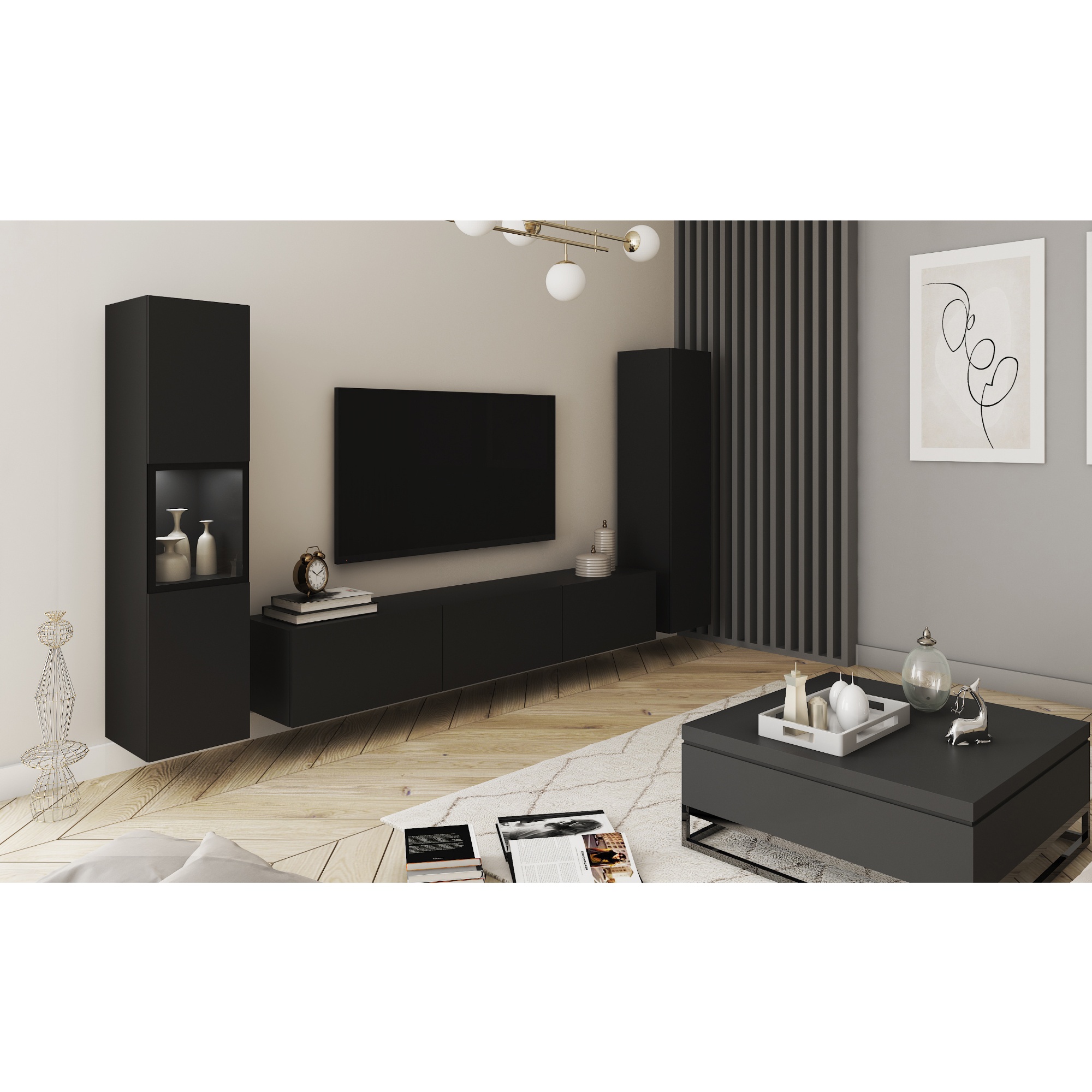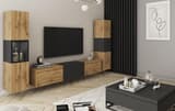 Stenu tvorí vitrína, skrinka a TV komoda. Za čiastočne presklenými otočnými dvierkami vitríny sa nachádzajú 4 vložené police. Nechýba ani štýlové LED osvetlenie, ktoré pomôže vystaveným predmetom vyniknúť. Ďalšími 4 vloženými policami disponuje skrinka. TV komoda ponúka dostatok úložného priestoru, takže si v nej nájde miesto nielen TV príslušenstvo, ale aj ďalšie nevyhnutnosti. Vitrínu, skrinku aj komodu je možné zavesiť na stenu.