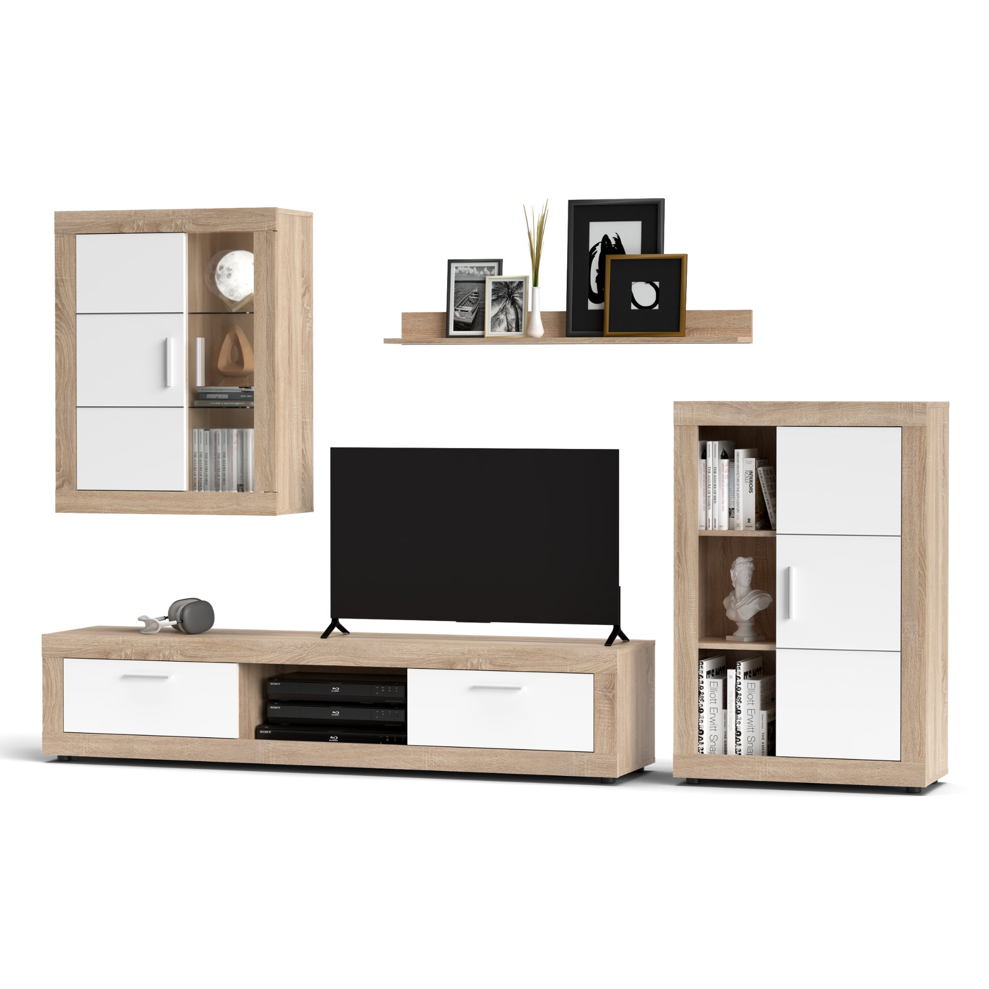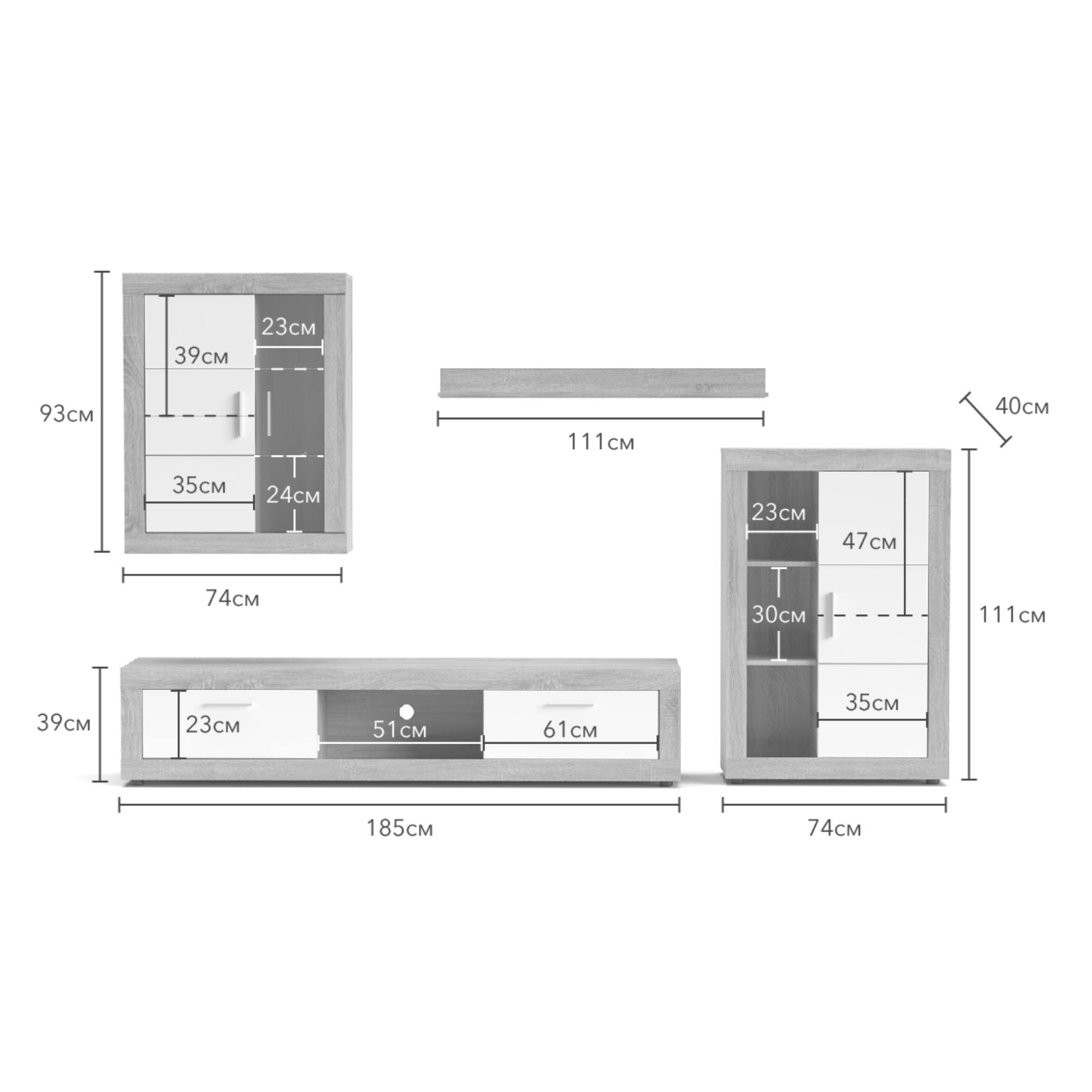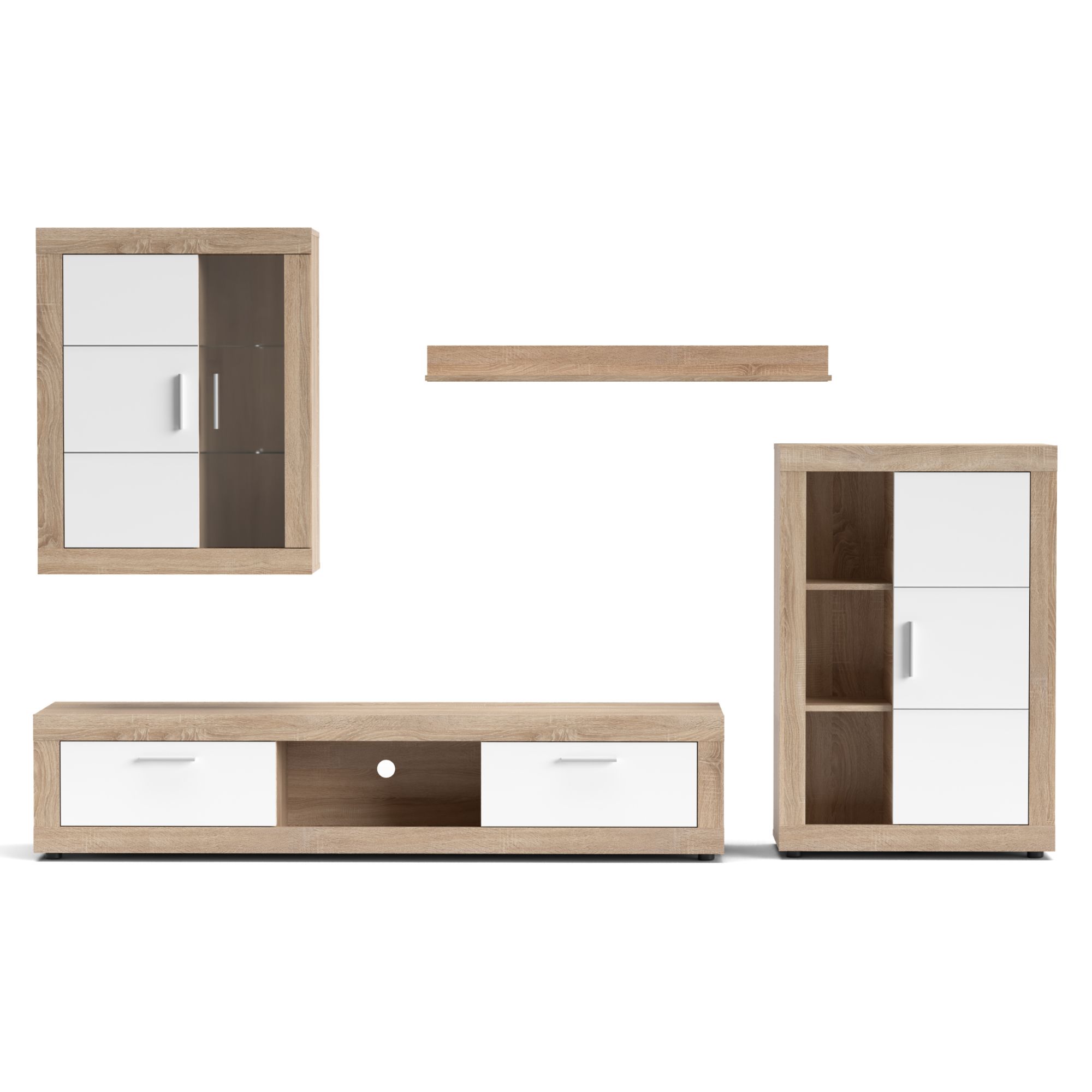 - Skladá sa z: Nástenná polica, TV komoda, 2 skrinky