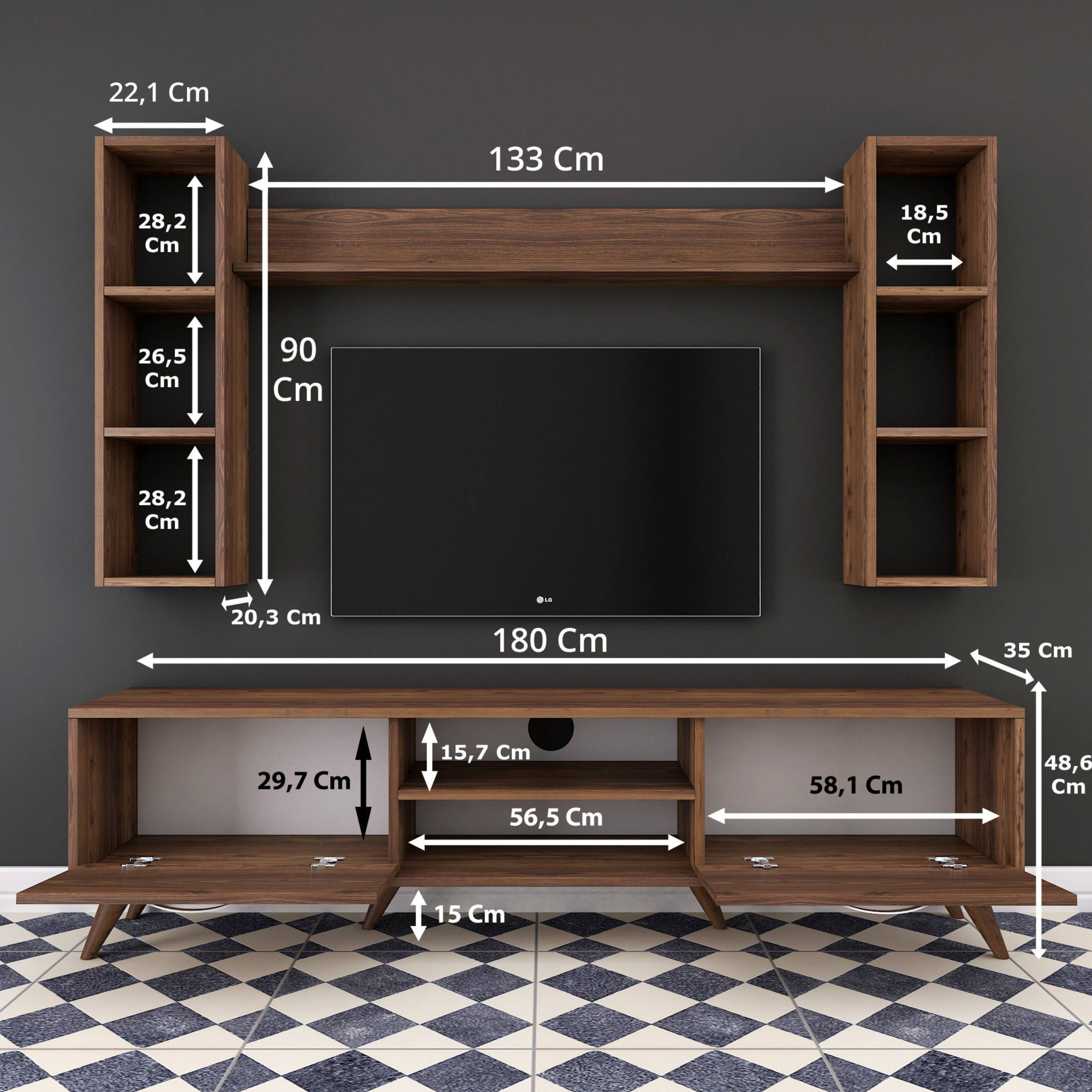 - Skladá sa z: TV komoda, 2x nástenný regál, nástenná polica